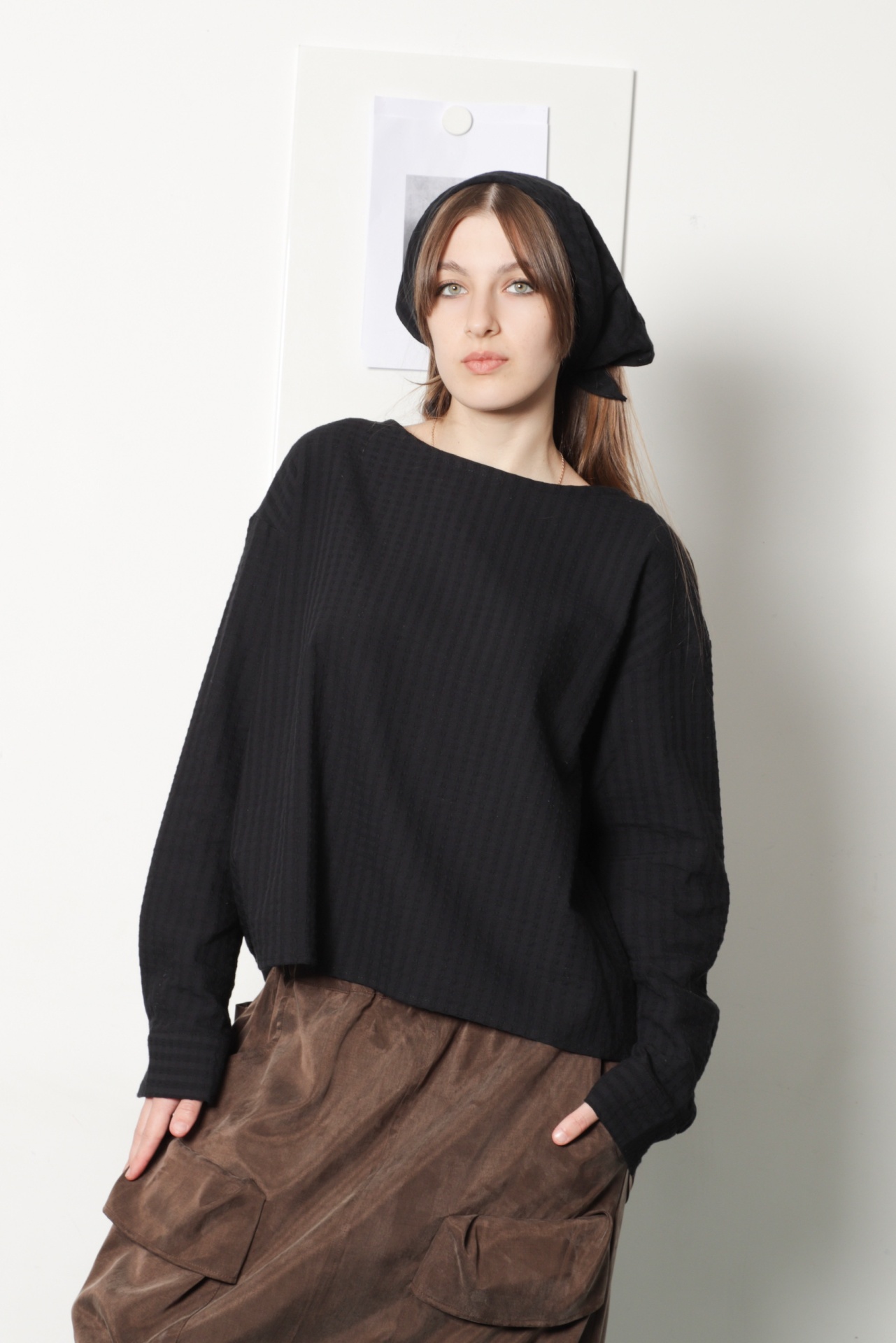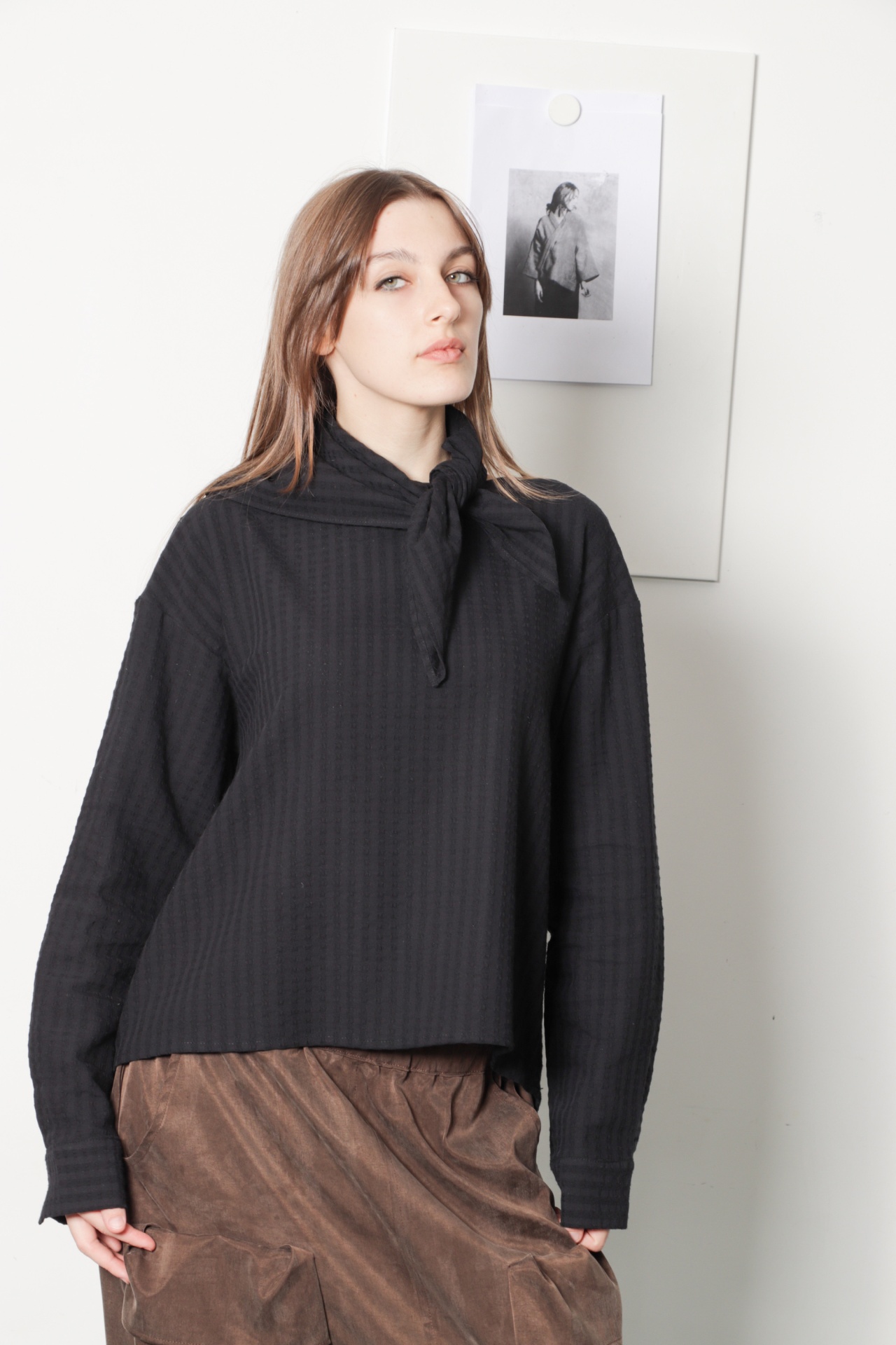 Blusa em tecido fantasia preto com lenço. Tem manga comprida com punho e botão, decote redondo e escapulário com pequeno macho nas costas. Tem bainha redonda, ligeiramente mais comprida atrás e vem acompanhada de um lenço 60x60 no mesmo material. Modelo solto, muito feminino.