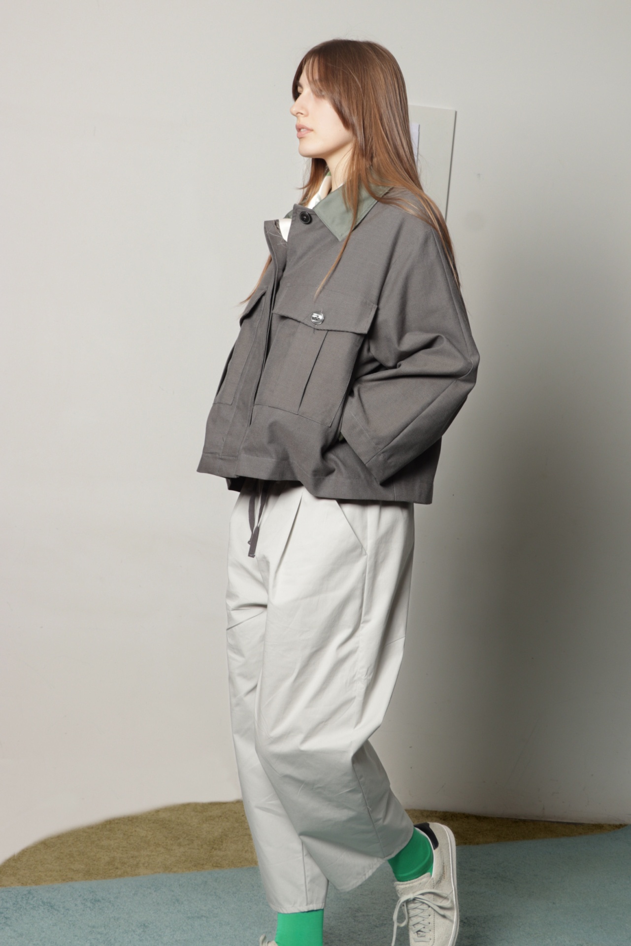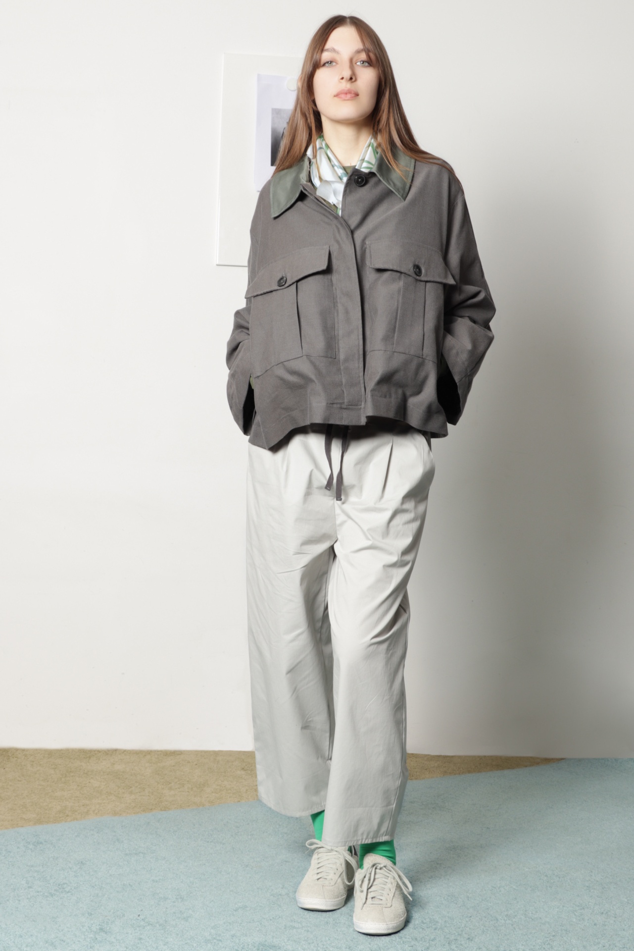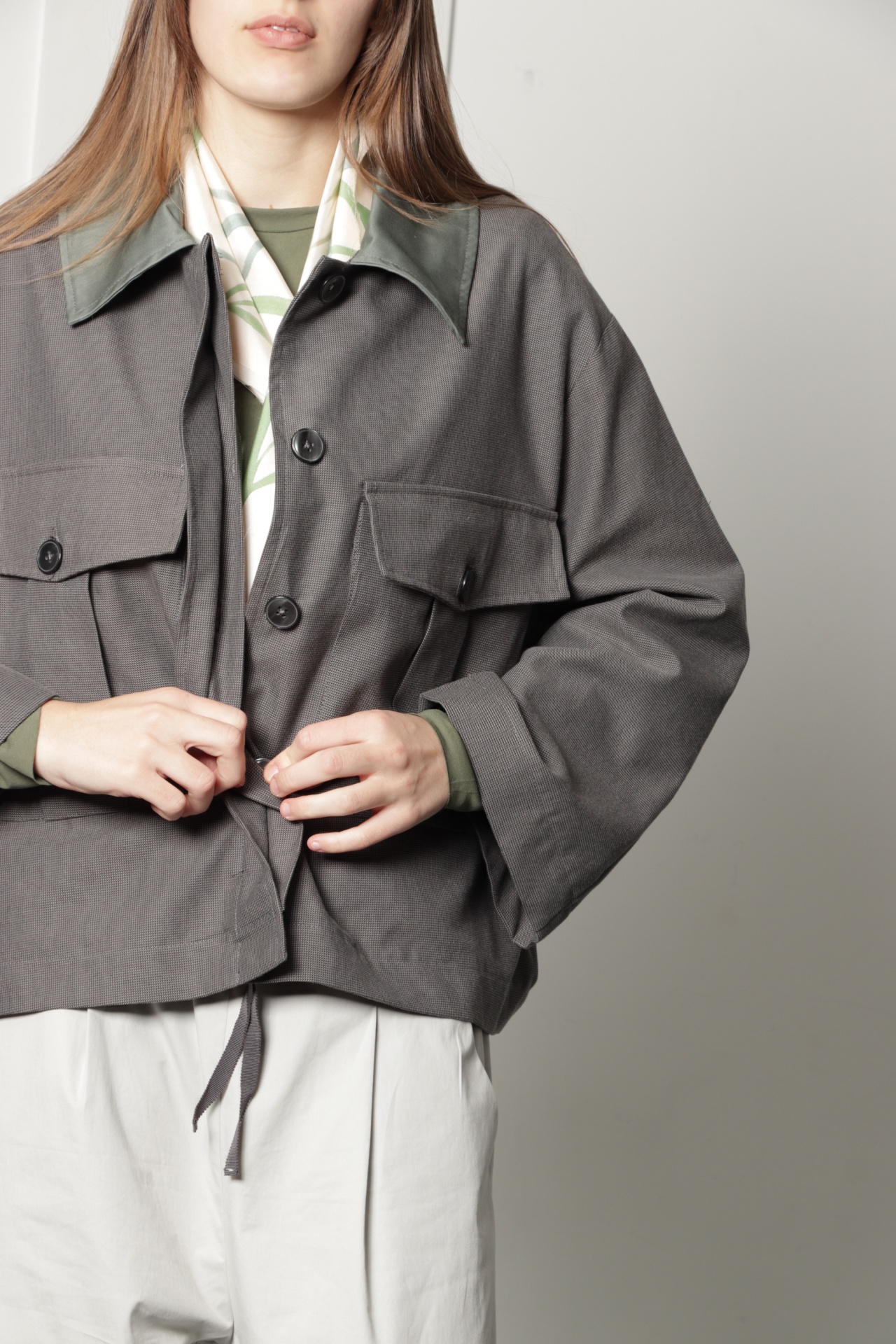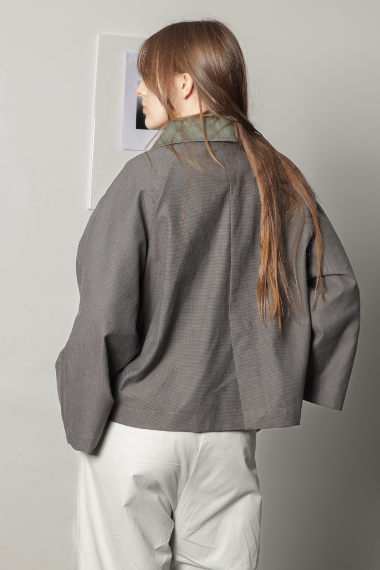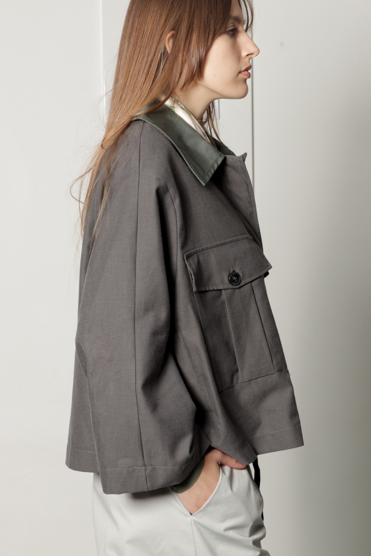 Blusão solto em tecido de algodão cardado com micro desenho, nos tons de cinza. Tem manga comprida aplicada em ombro descaído. Gola em bico com tecido contrastante, aperta com botões escondidos por carcela dupla e tem 2 bolsos cargo com pala e botão e 2 bolsos nas laterais. A racha alta nas costas dá-lhe um movimento muito elegante.