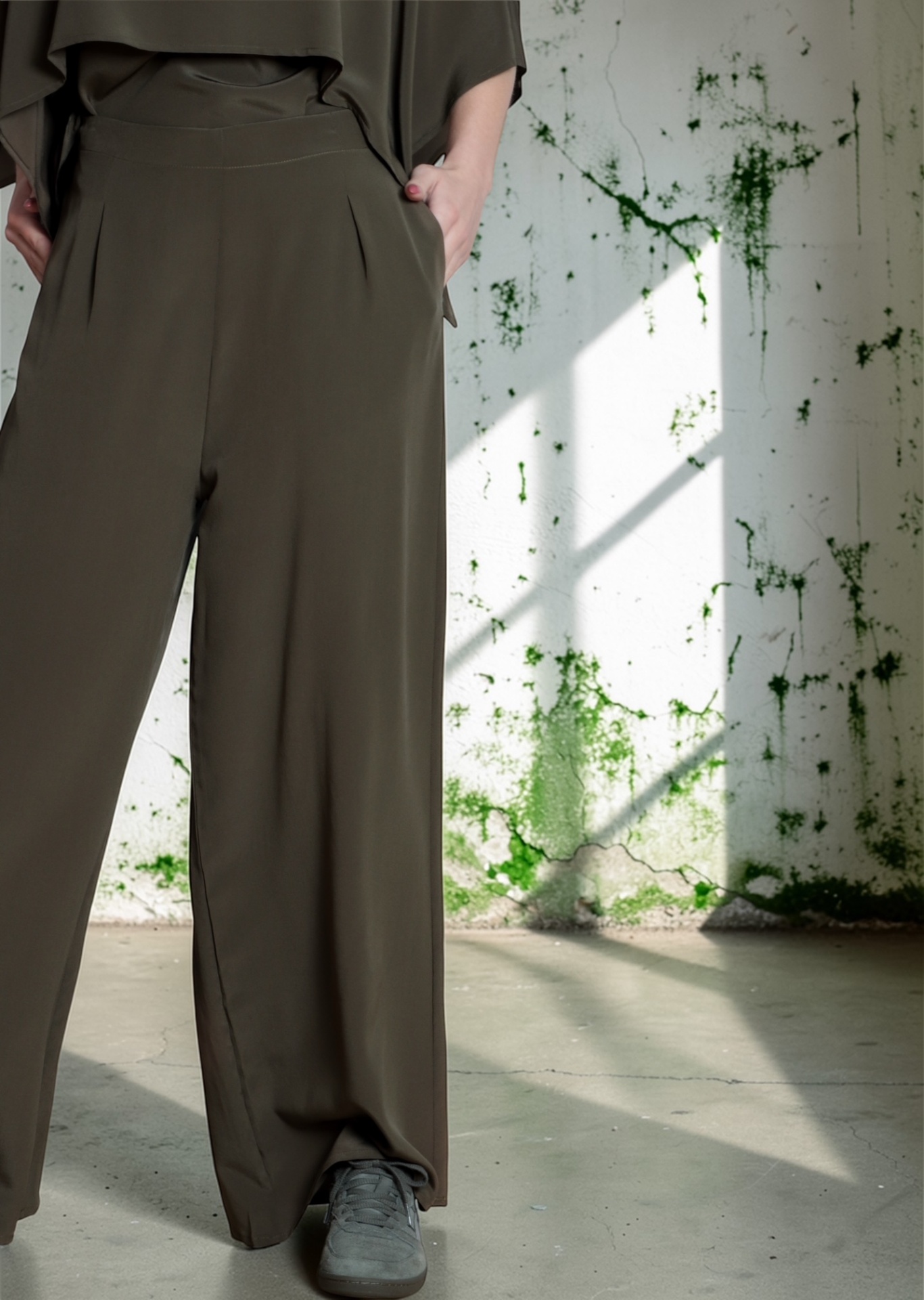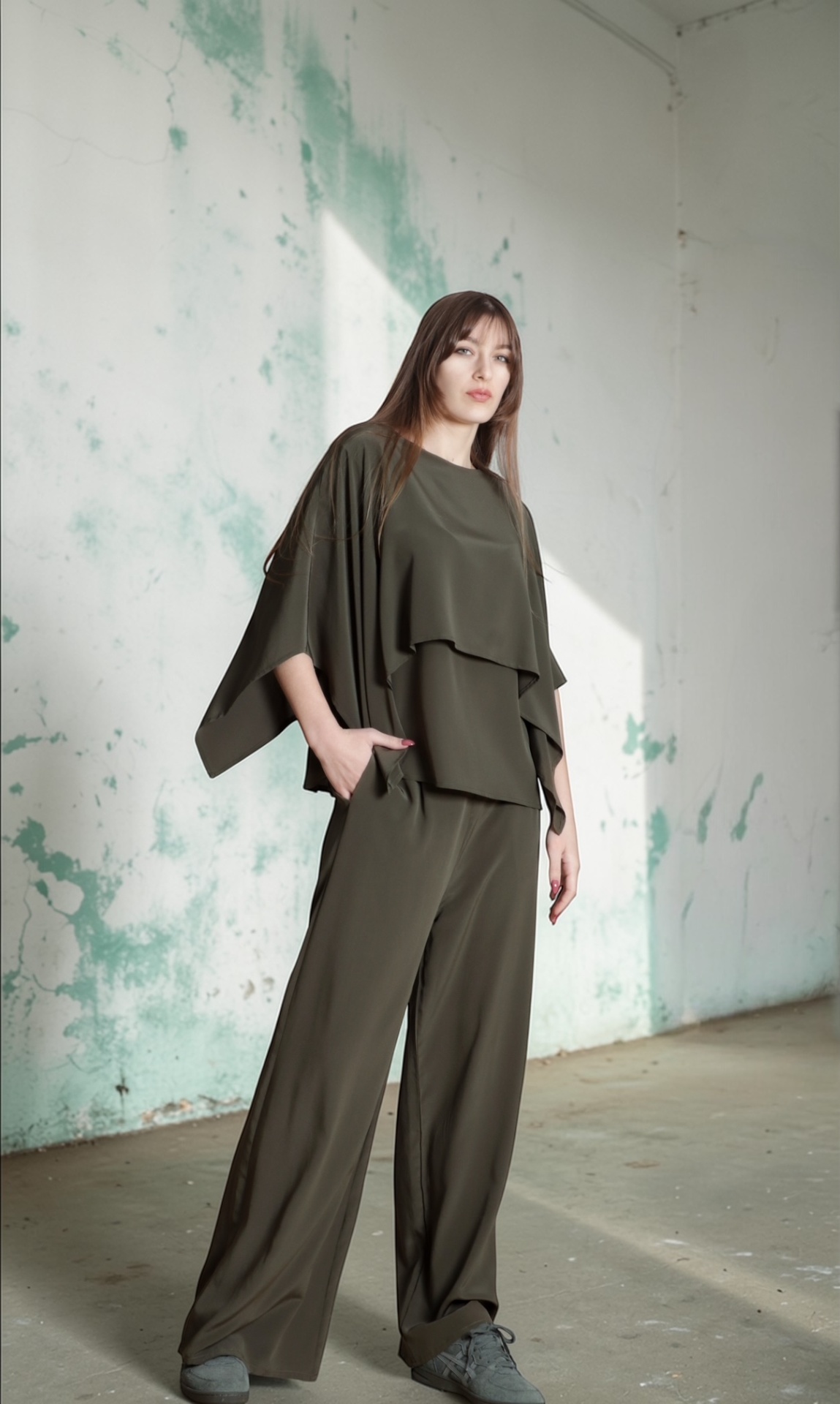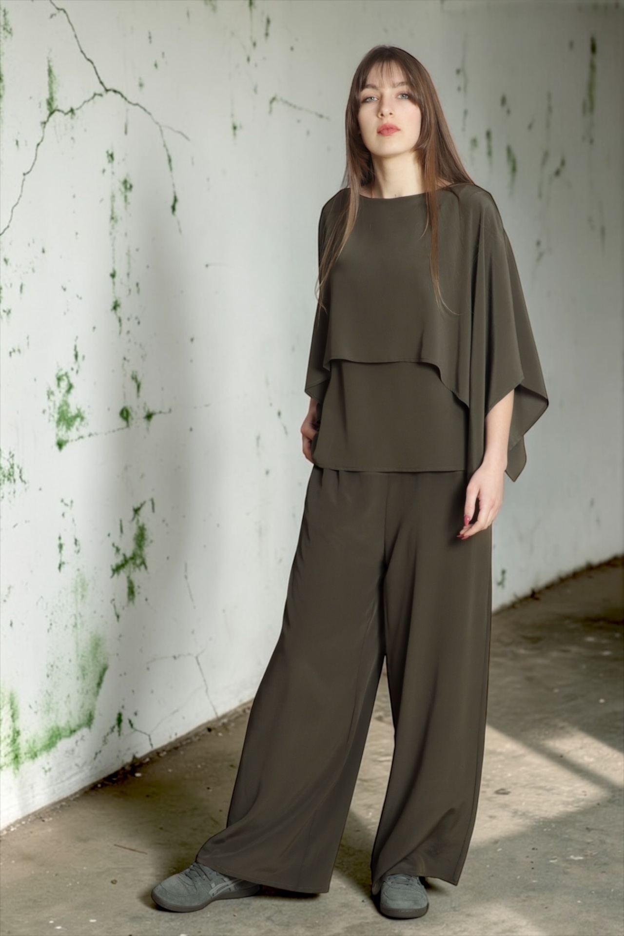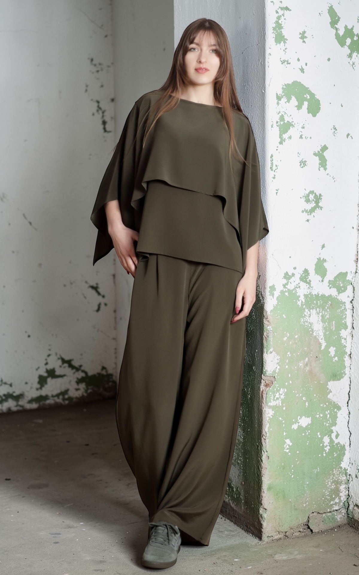 • Mulher com conjunto verde-oliva em tecido fluido, blusa com sobreposição e calças largas, sapatos cinzentos em fundo de parede branca rachada
