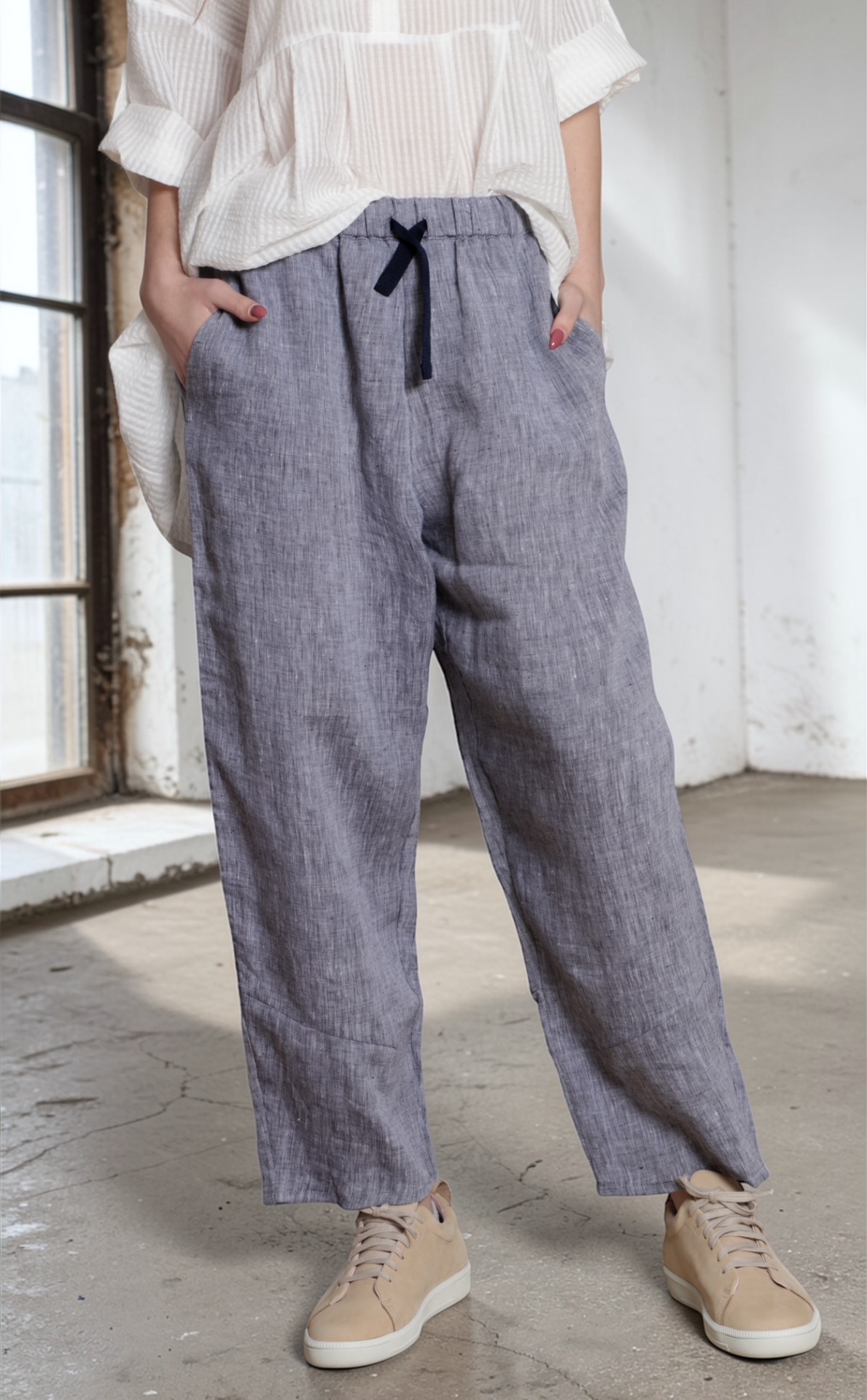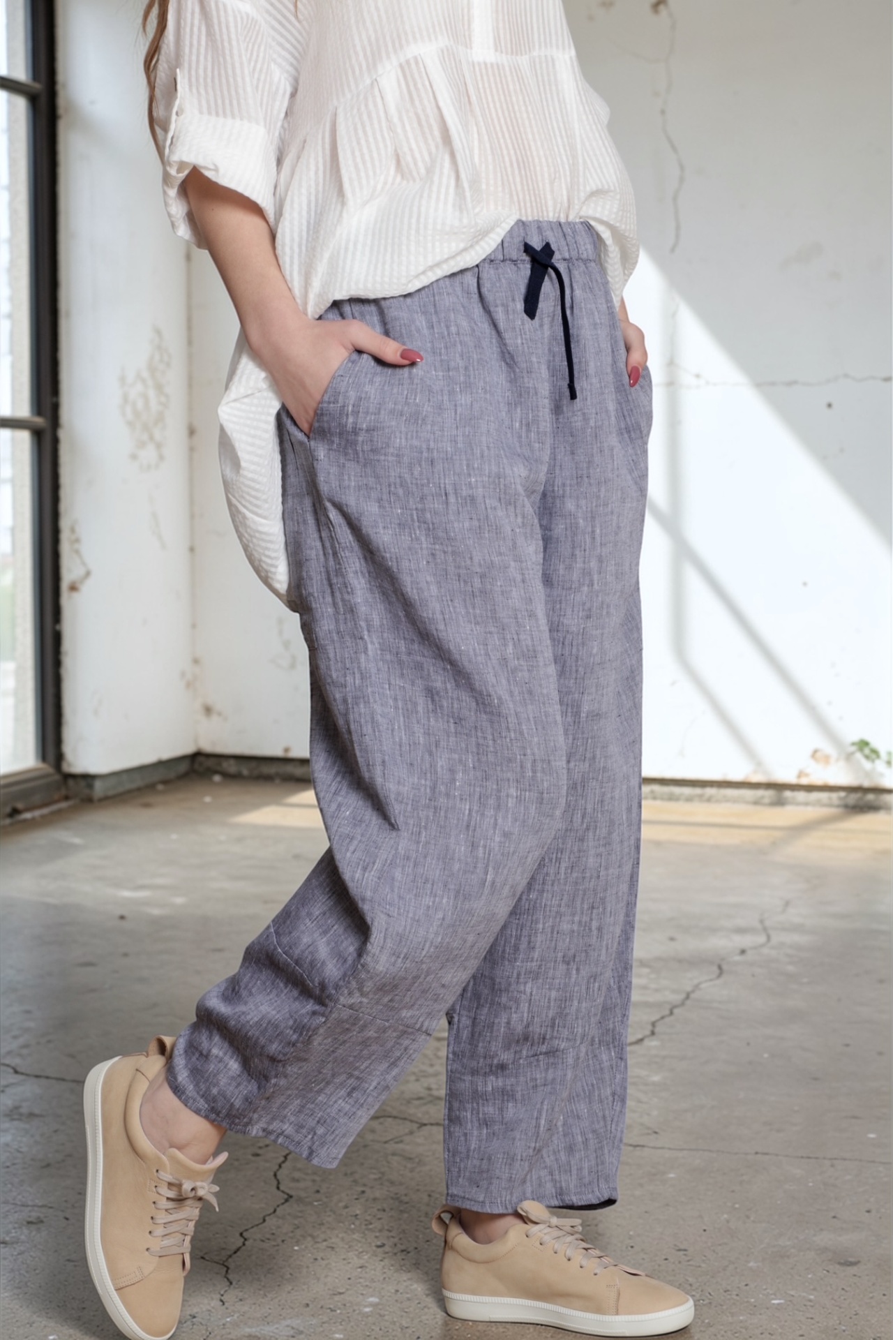 • Calças de linho cinza com cordão preto e ténis bege com sola branca