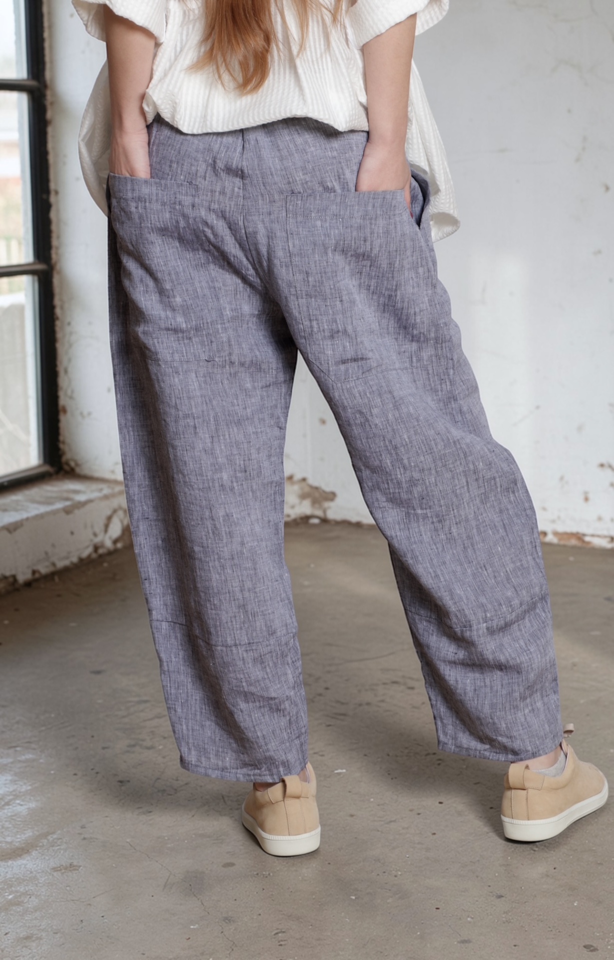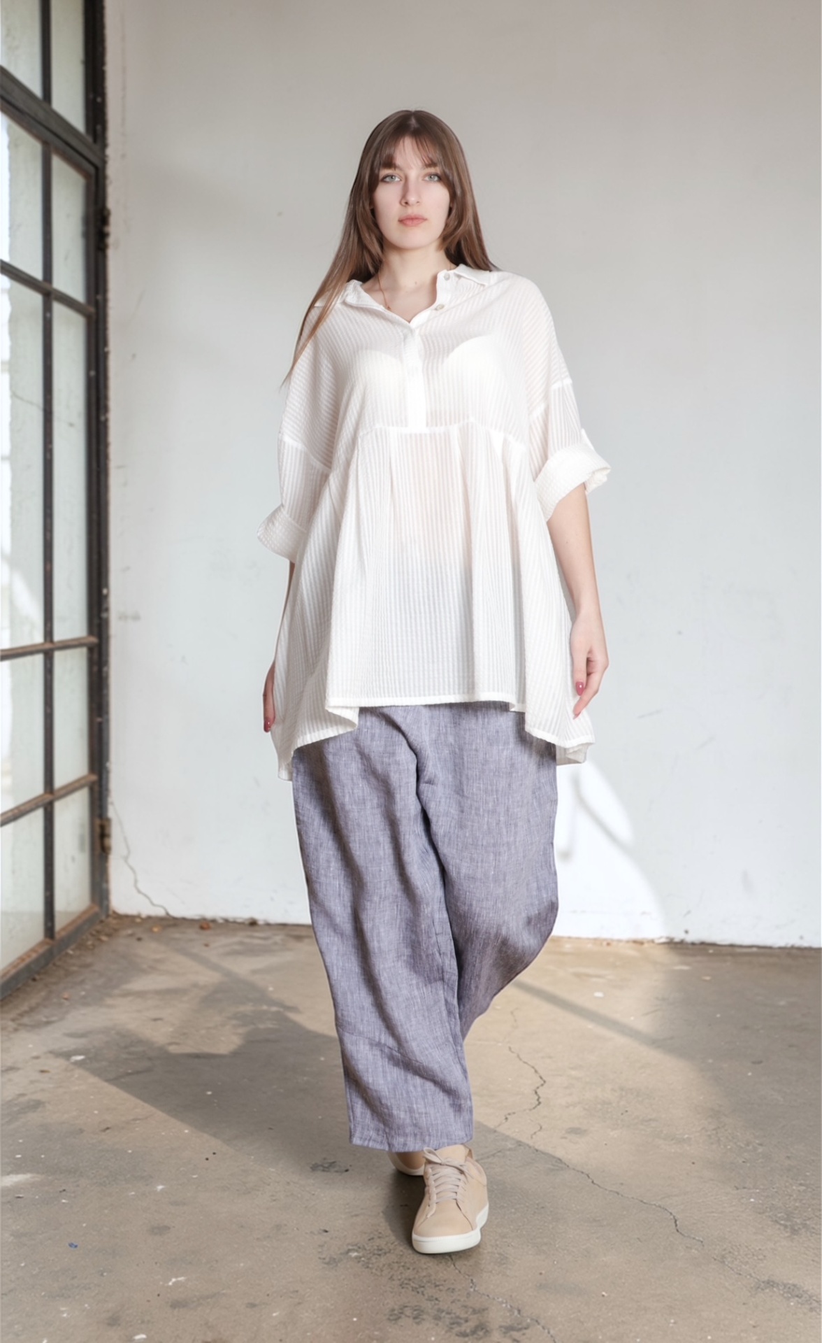 • Mulher com blusa branca larga e calças cinza num espaço interior