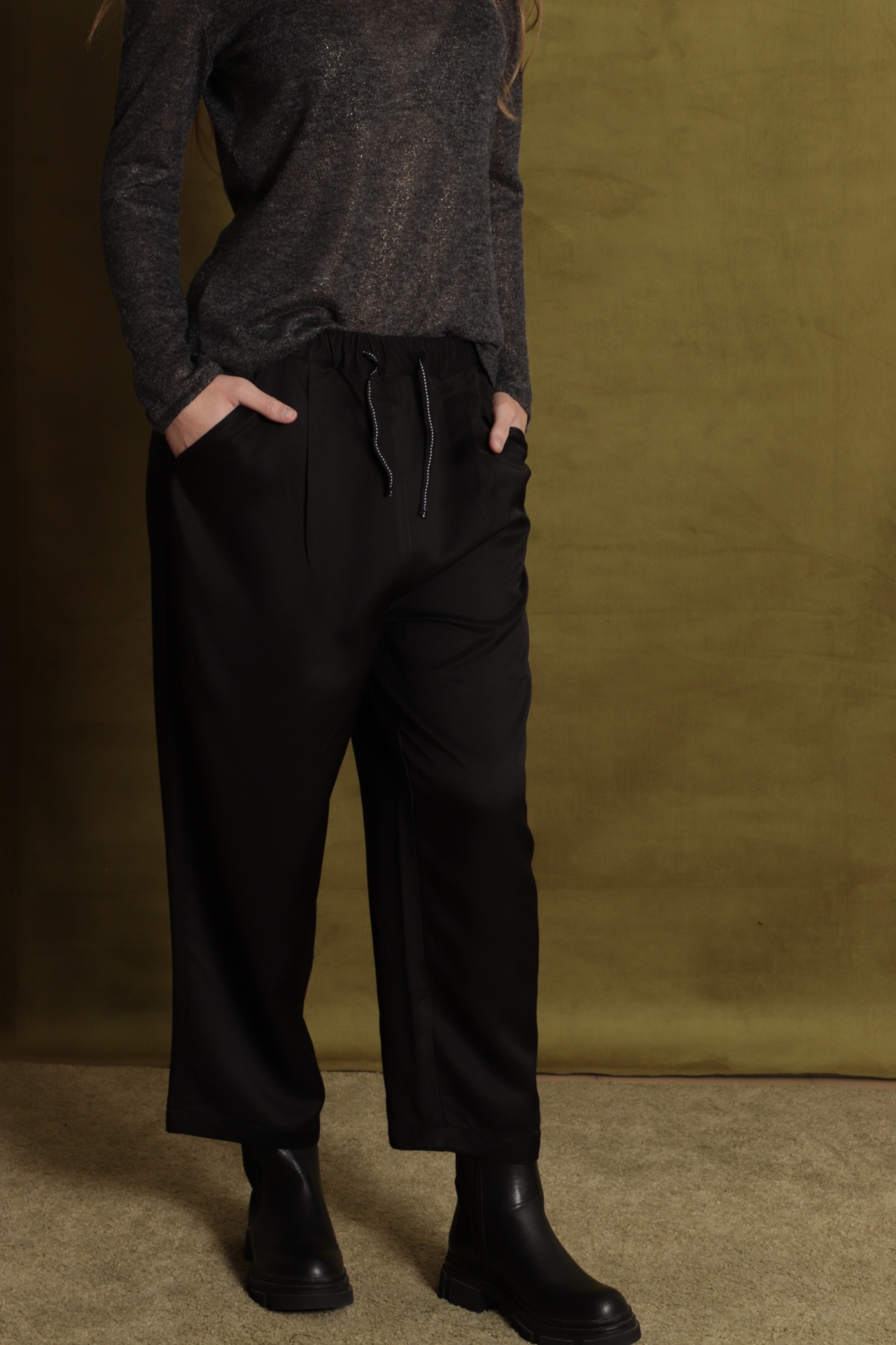 Calças soltas em sarja fluida com ligeiro brilho, na cor preta. Calças de look desportivo citadino, com elástico largo no cinto e cordão, para um ajuste mais confortável.  Veste vários tamanhos.