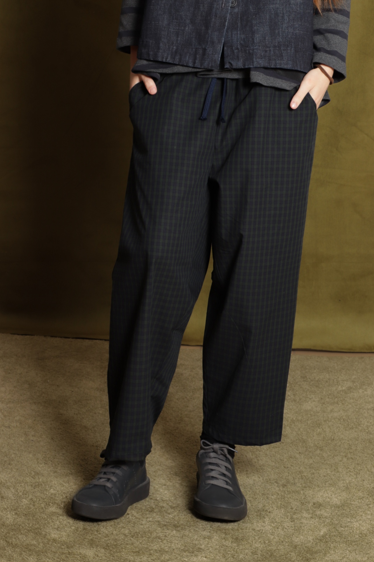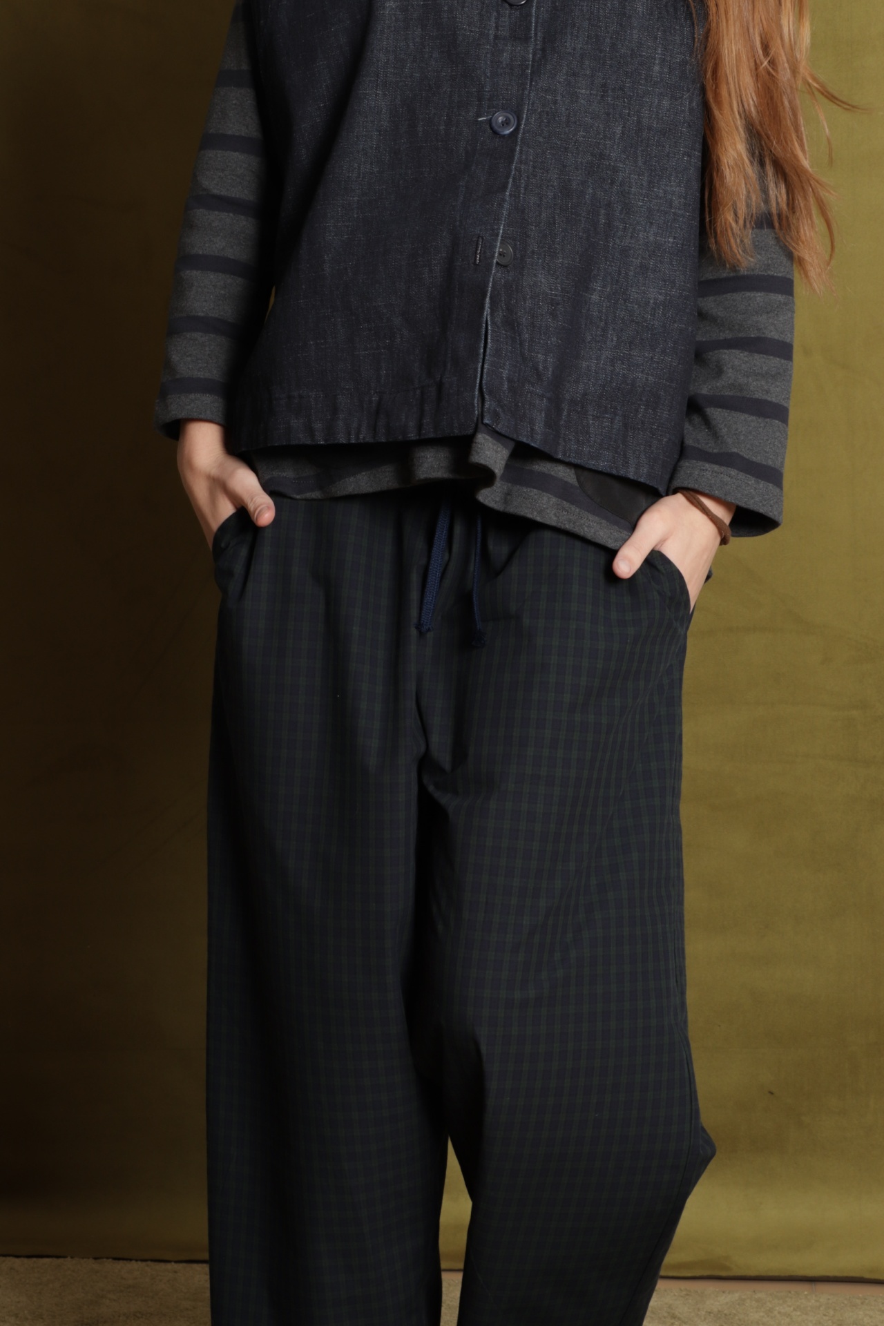 Calças soltas xadrez nas cores verde e azul escuro. Calças de look desportivo citadino, com elástico largo no cinto e cordão, para um ajuste mais confortável.  Veste vários tamanhos.