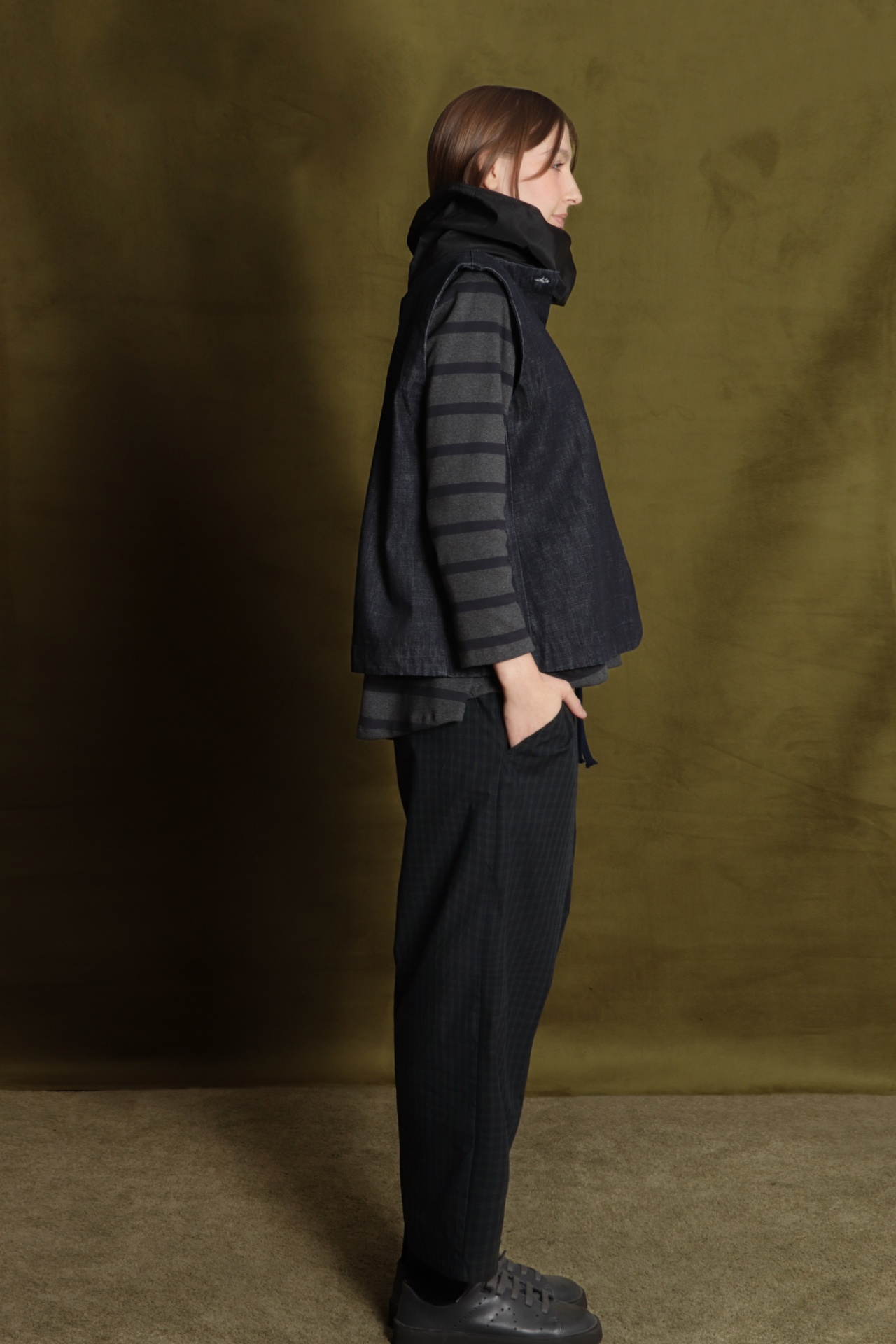 • Mulher veste camisola riscas, colete azul, calças xadrez e sapatilhas cinzentas em fundo castanho.