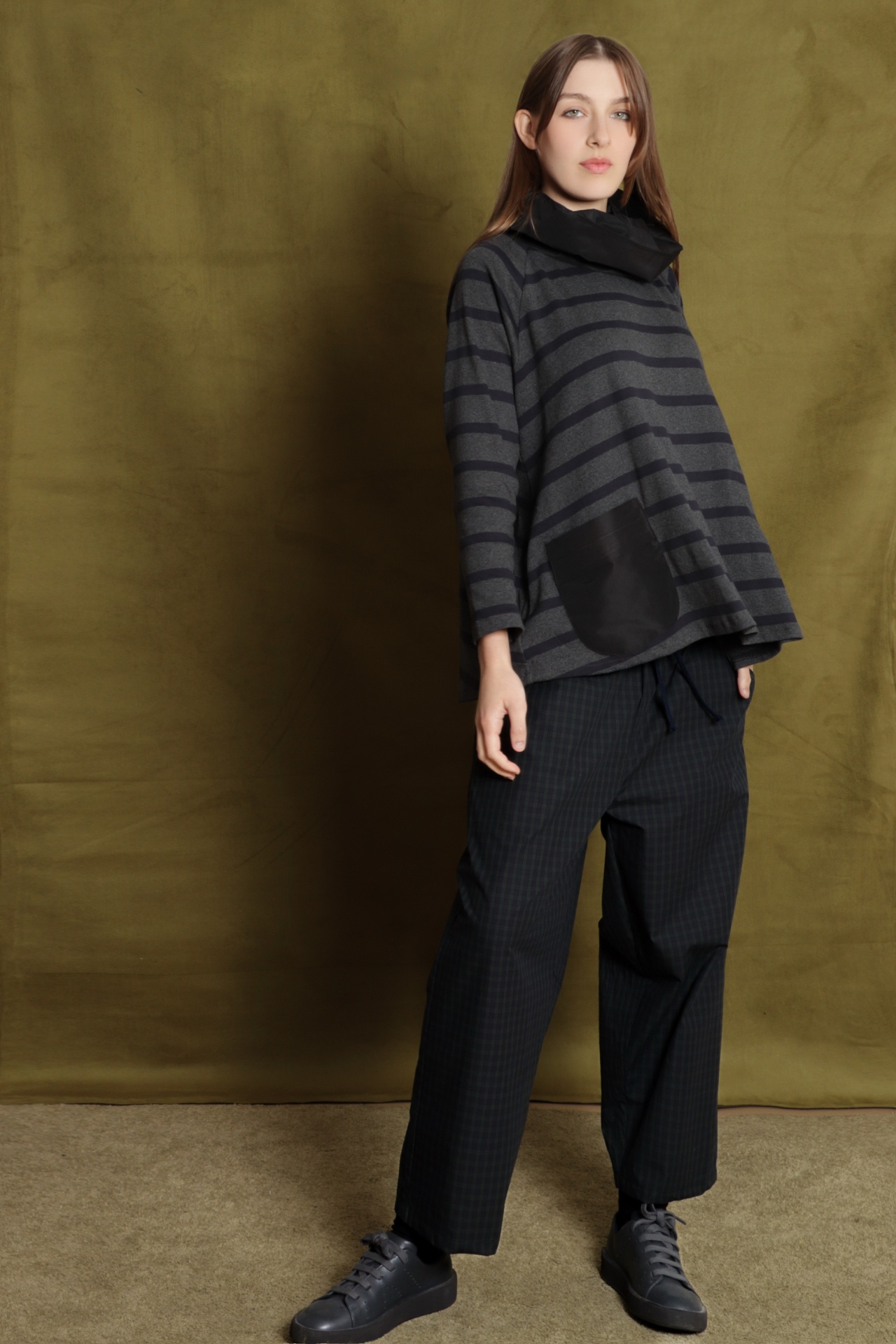• Mulher com camisa riscada cinza e preta, calças largas escuras e sapatos cinzentos