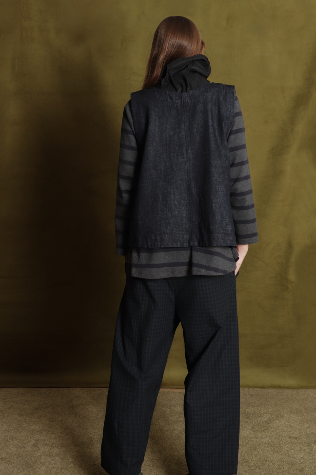• Pessoa com colete azul escuro, camisola cinzenta às riscas, calças escuras e sapatilhas cinzentas.