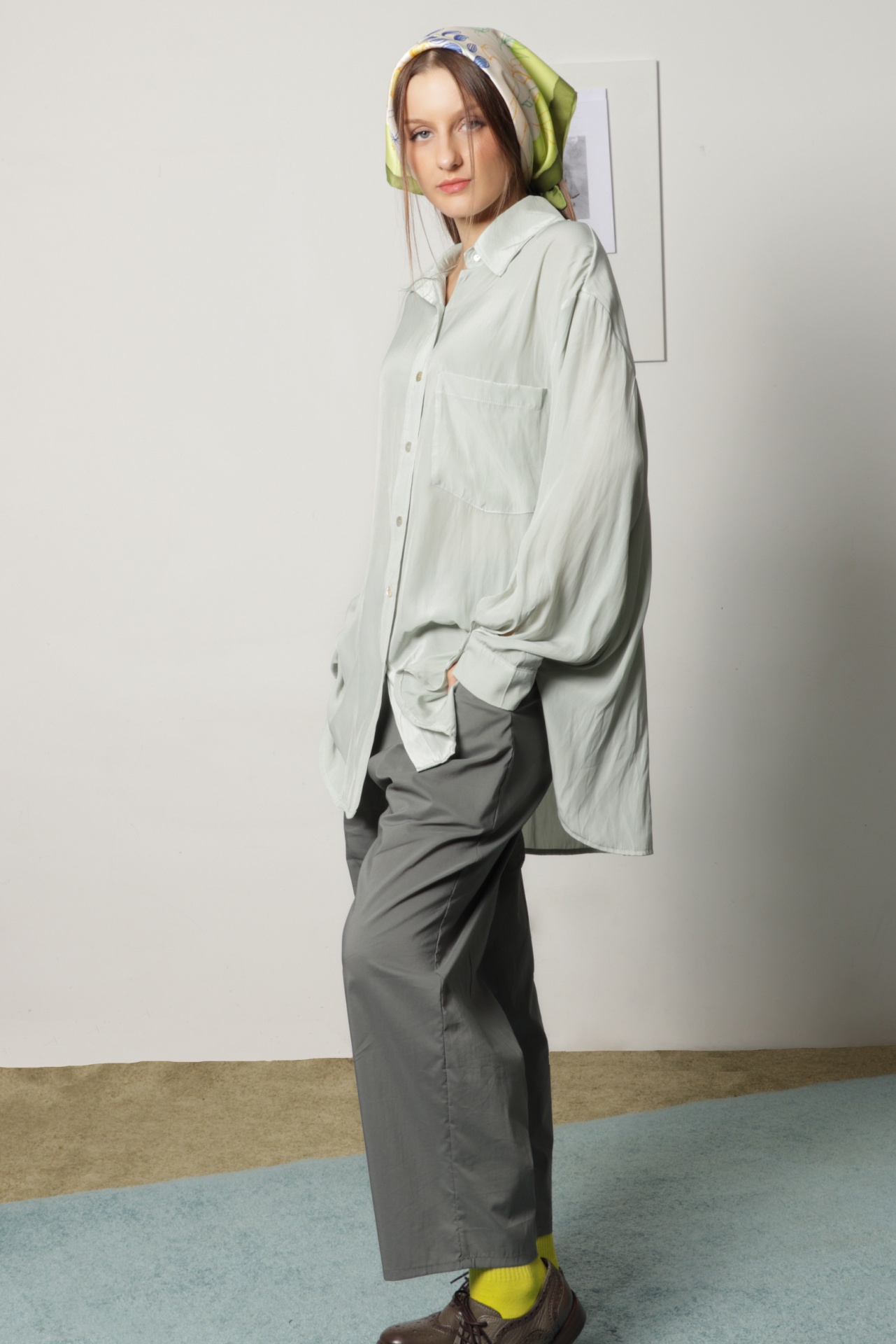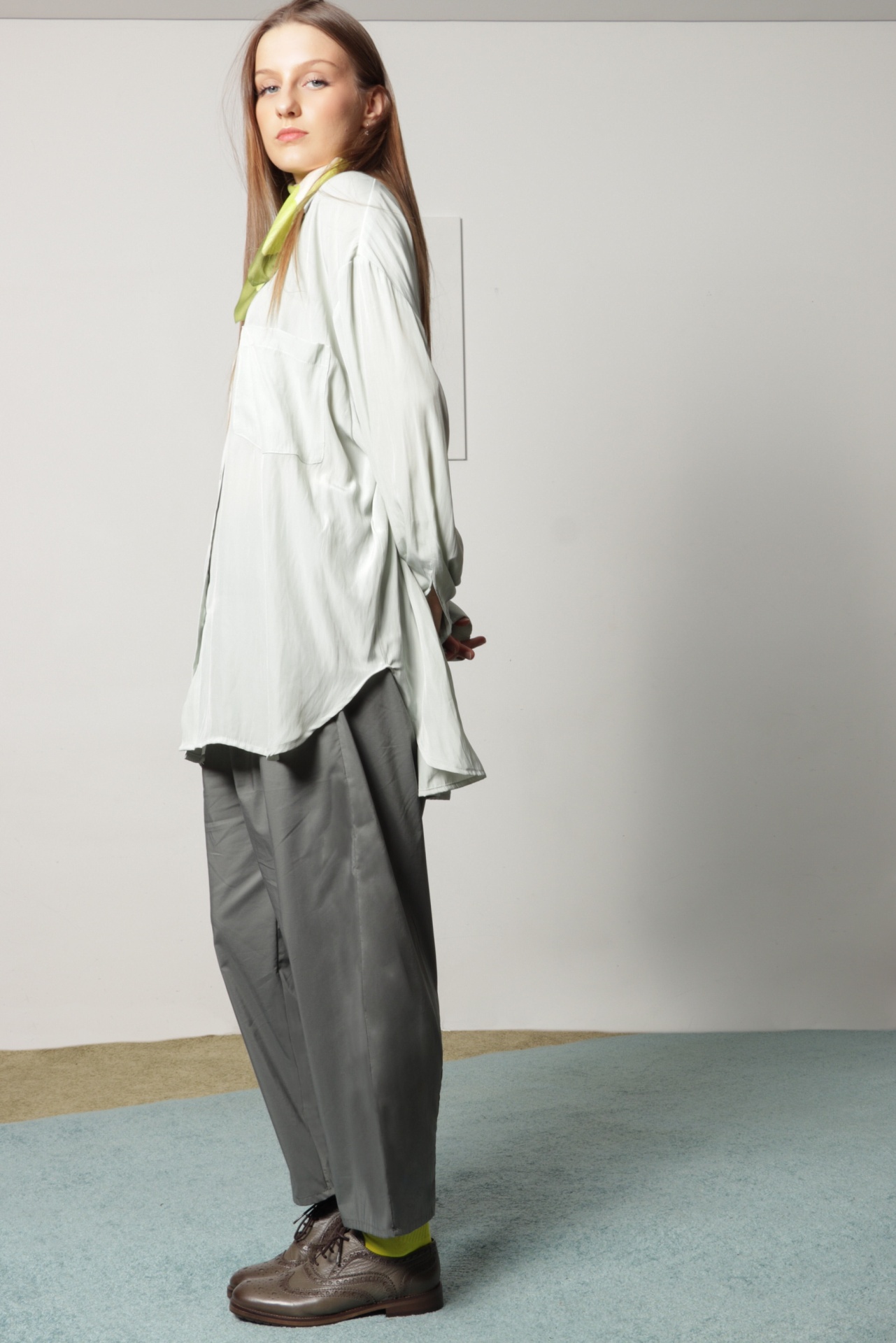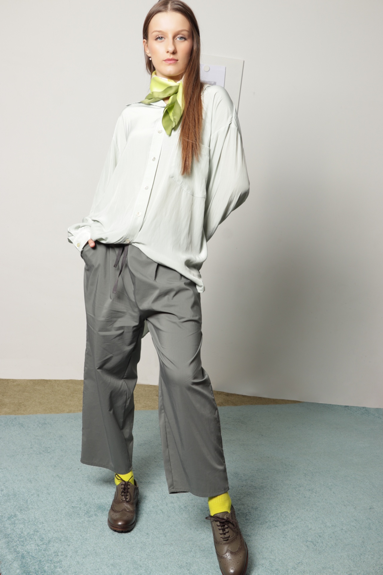 Calças soltas em tecido fino de toque apapelado e brilho subtil, na cor verde acinzentado. Calças de look desportivo citadino, com elástico largo no cinto e cordão, para um ajuste mais confortável.  Veste vários tamanhos.