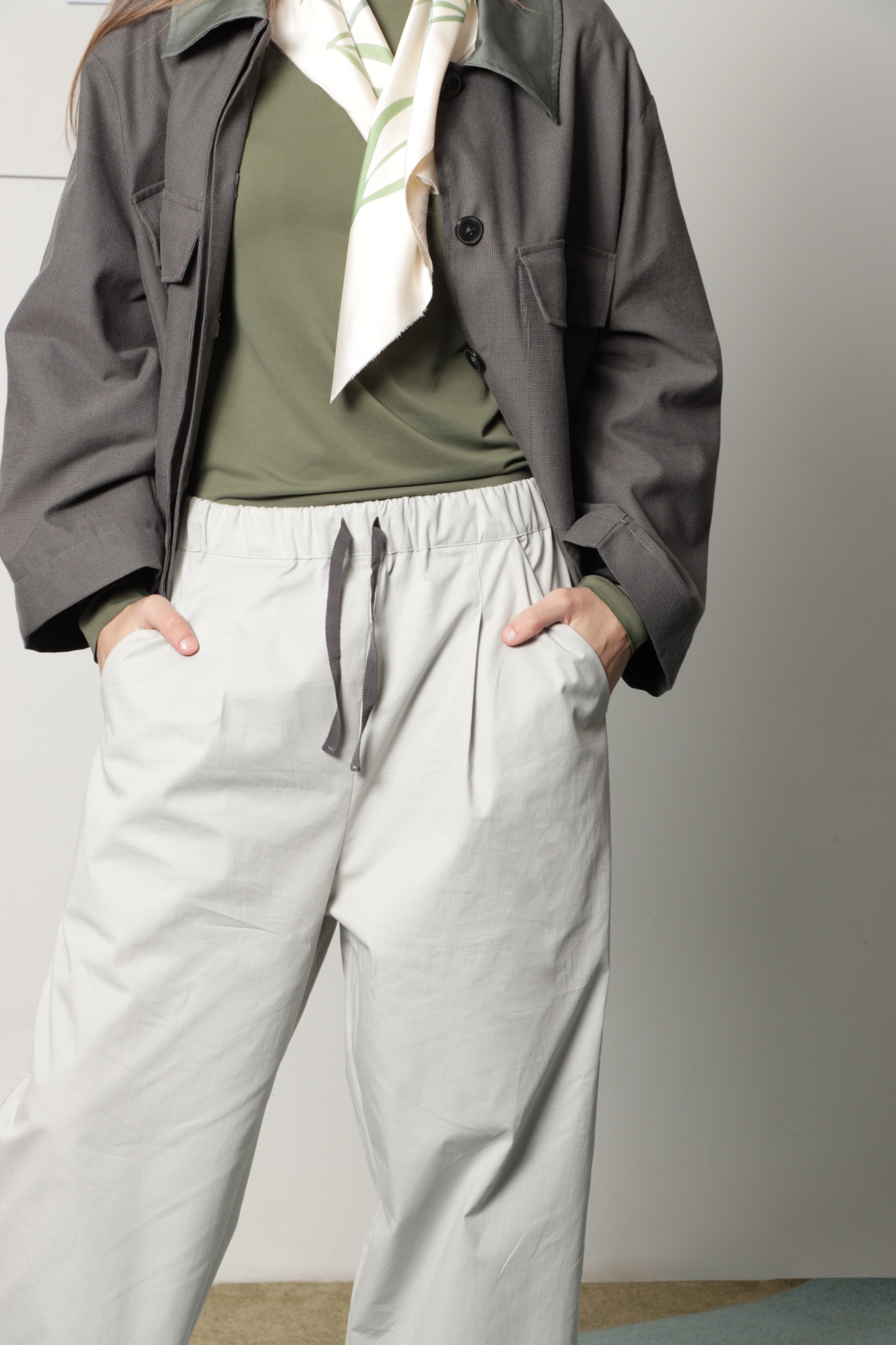 Calças soltas em sarja de algodão, na cor verde nórdico muito claro. Calças de look desportivo citadino, com elástico largo no cinto e cordão, para um ajuste mais confortável.  Veste vários tamanhos.