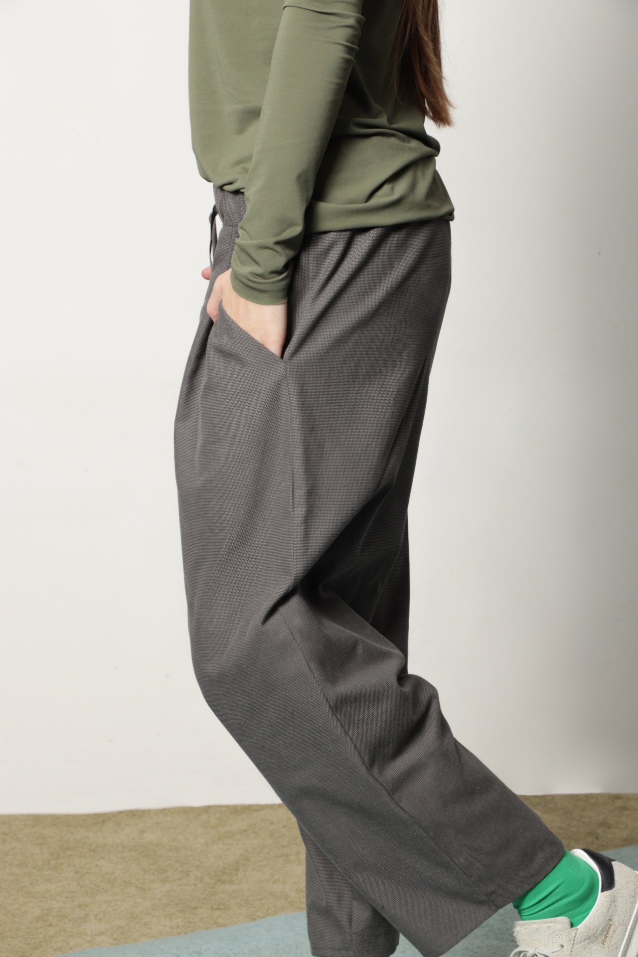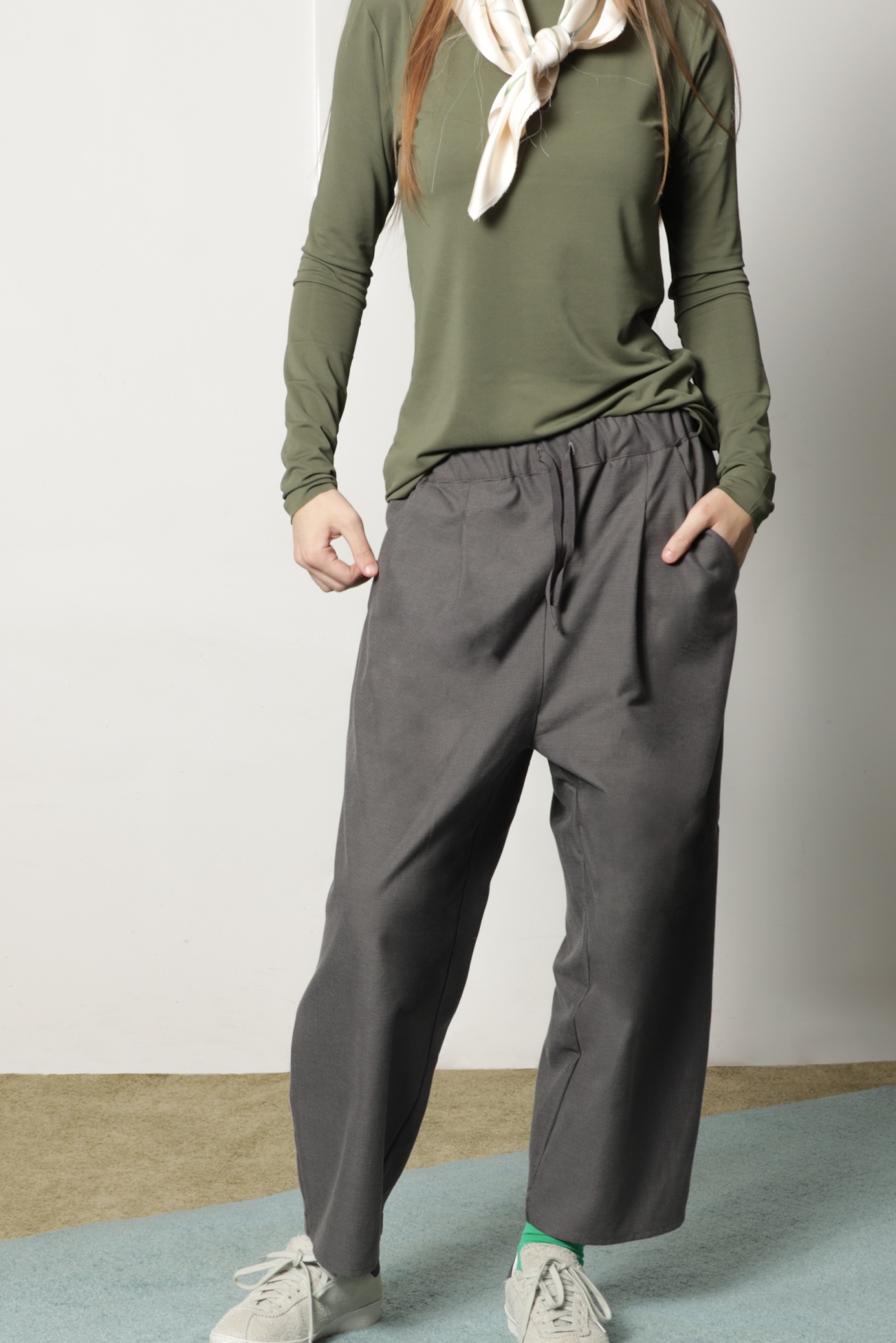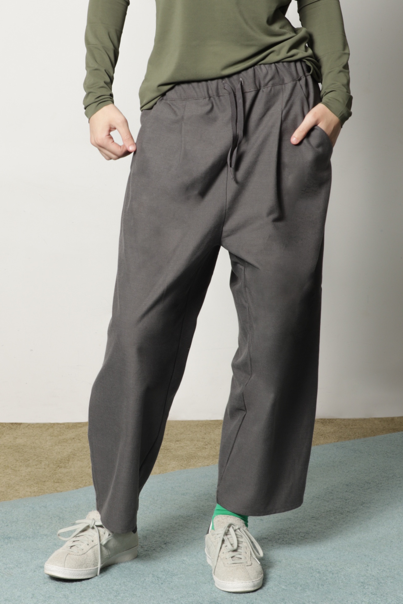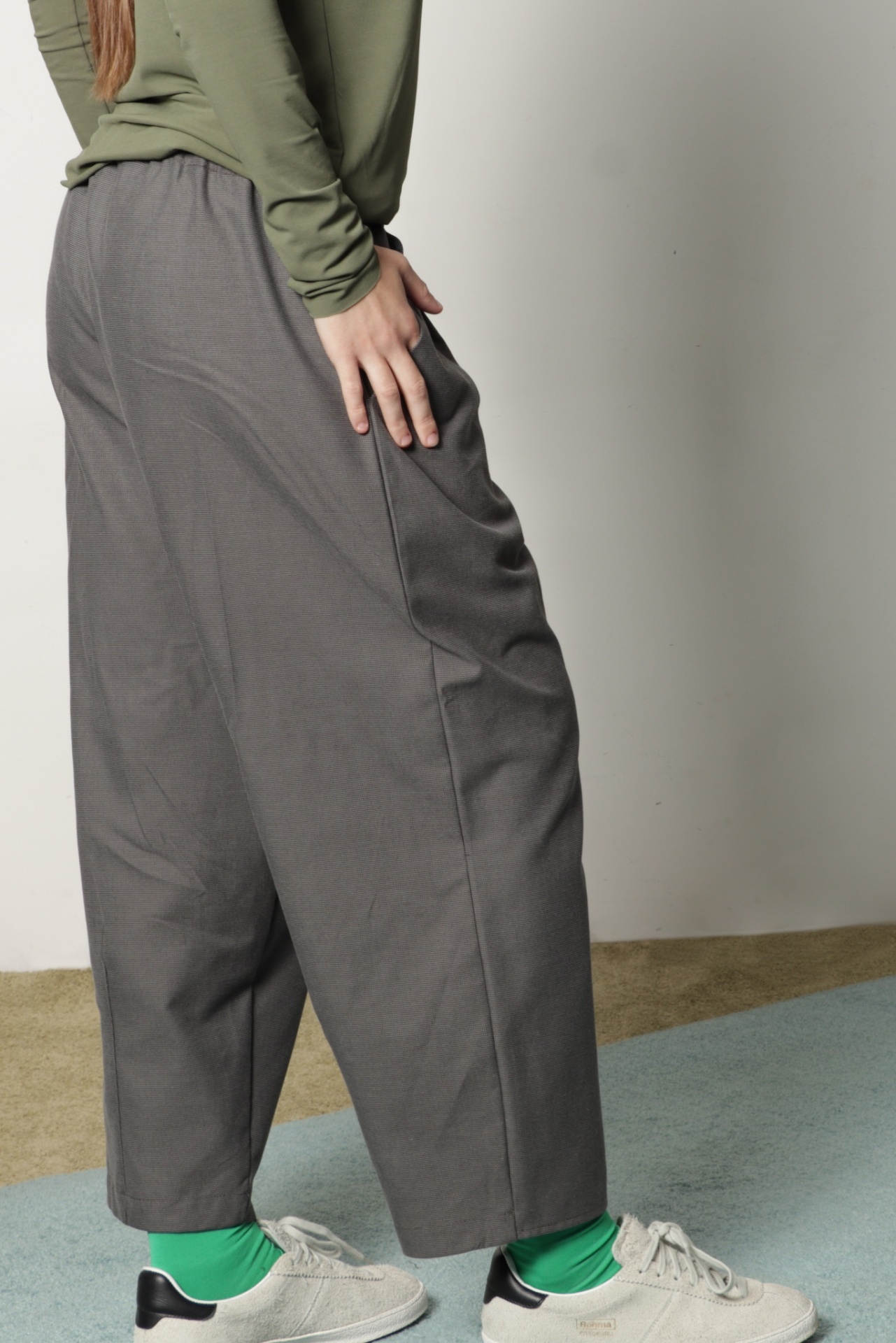 Calças soltas em tecido de algodão cardado com micro desenho nos tons cinza. Calças de look desportivo citadino, com elástico largo no cinto e cordão, para um ajuste mais confortável.  Veste vários tamanhos.
