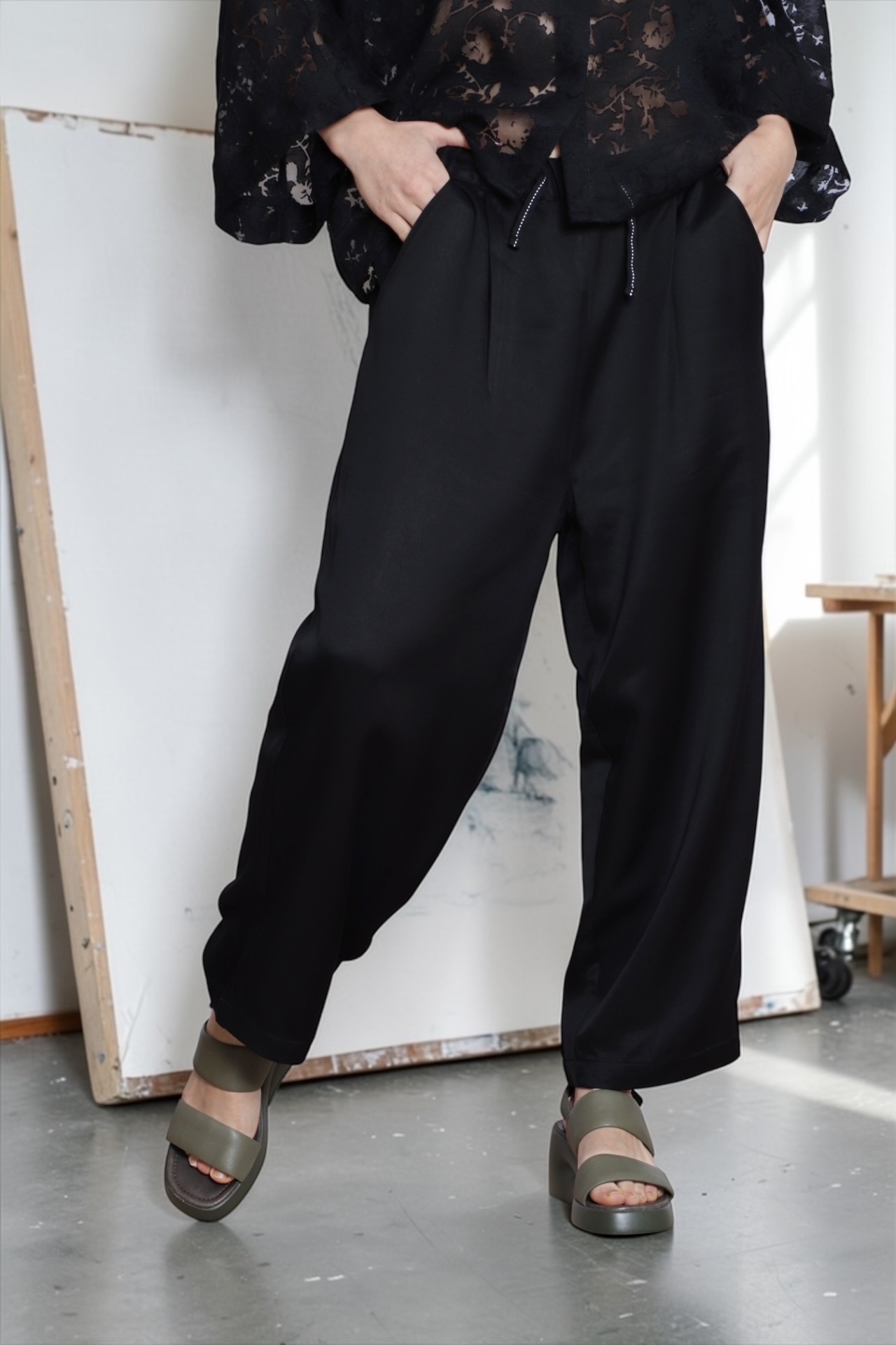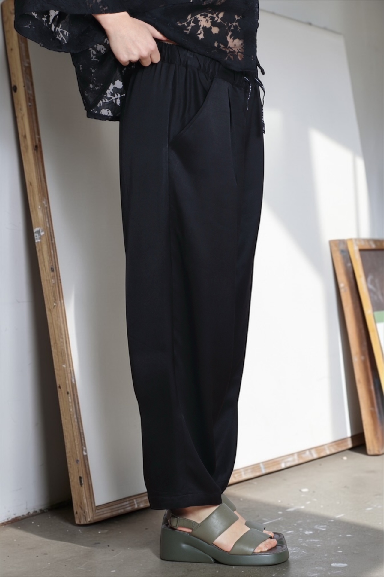 Calças soltas em sarja fluida com ligeiro brilho, na cor preta. Calças de look desportivo citadino, com elástico largo no cinto e cordão, para um ajuste mais confortável.  Veste vários tamanhos.