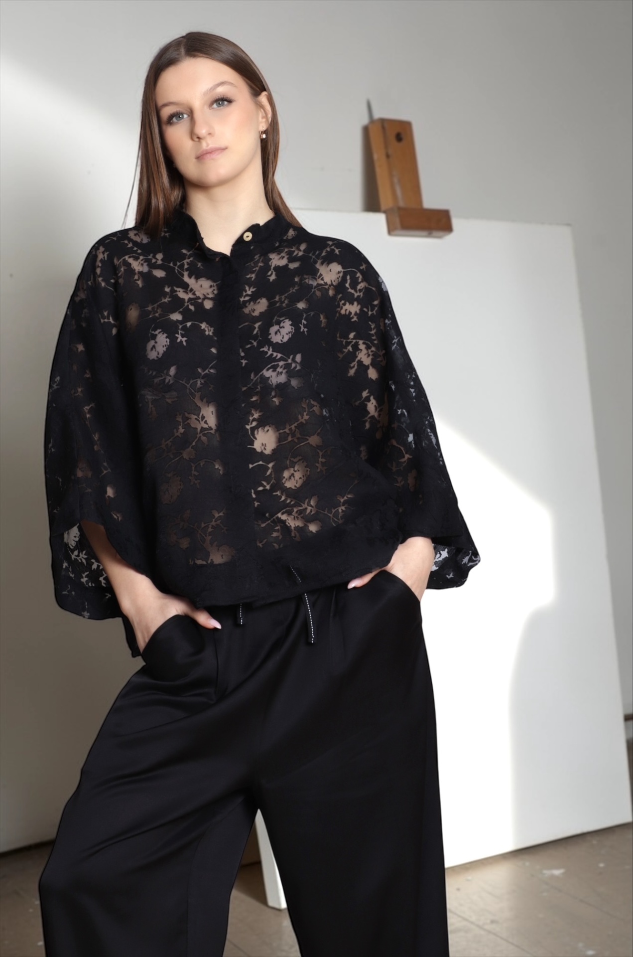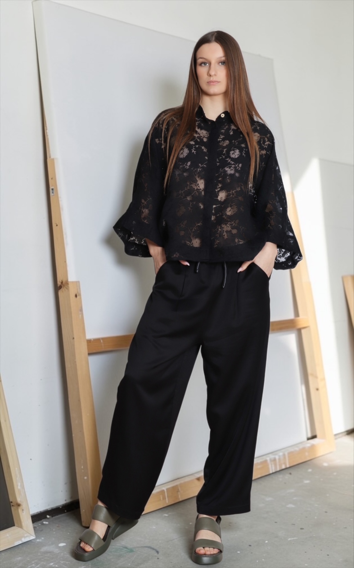 • Mulher vestindo blusa preta de renda floral e calças pretas largas em estúdio