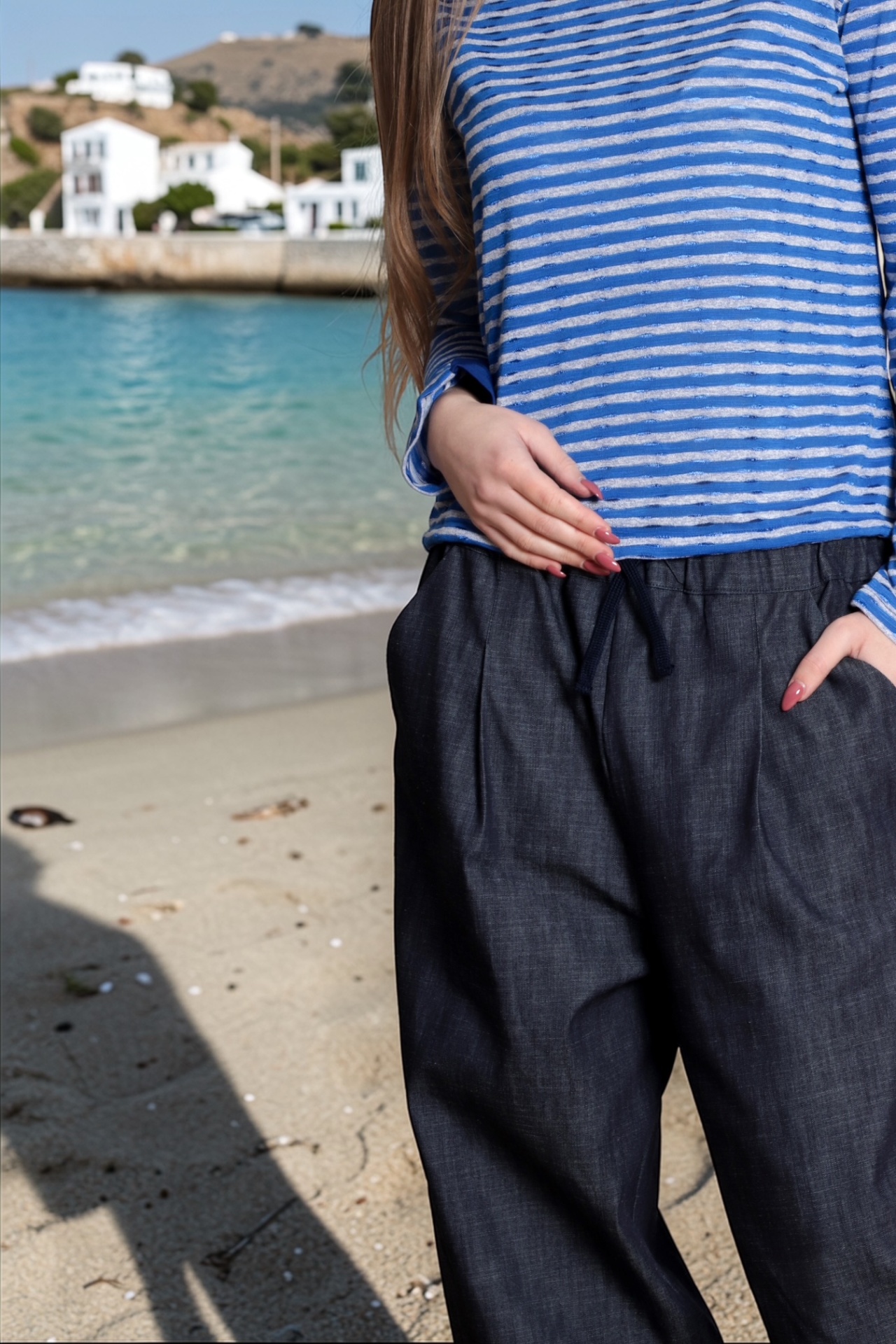• Mulher com camisola azul às riscas, calças pretas largas e sapatilhas pretas num passeio à beira-mar