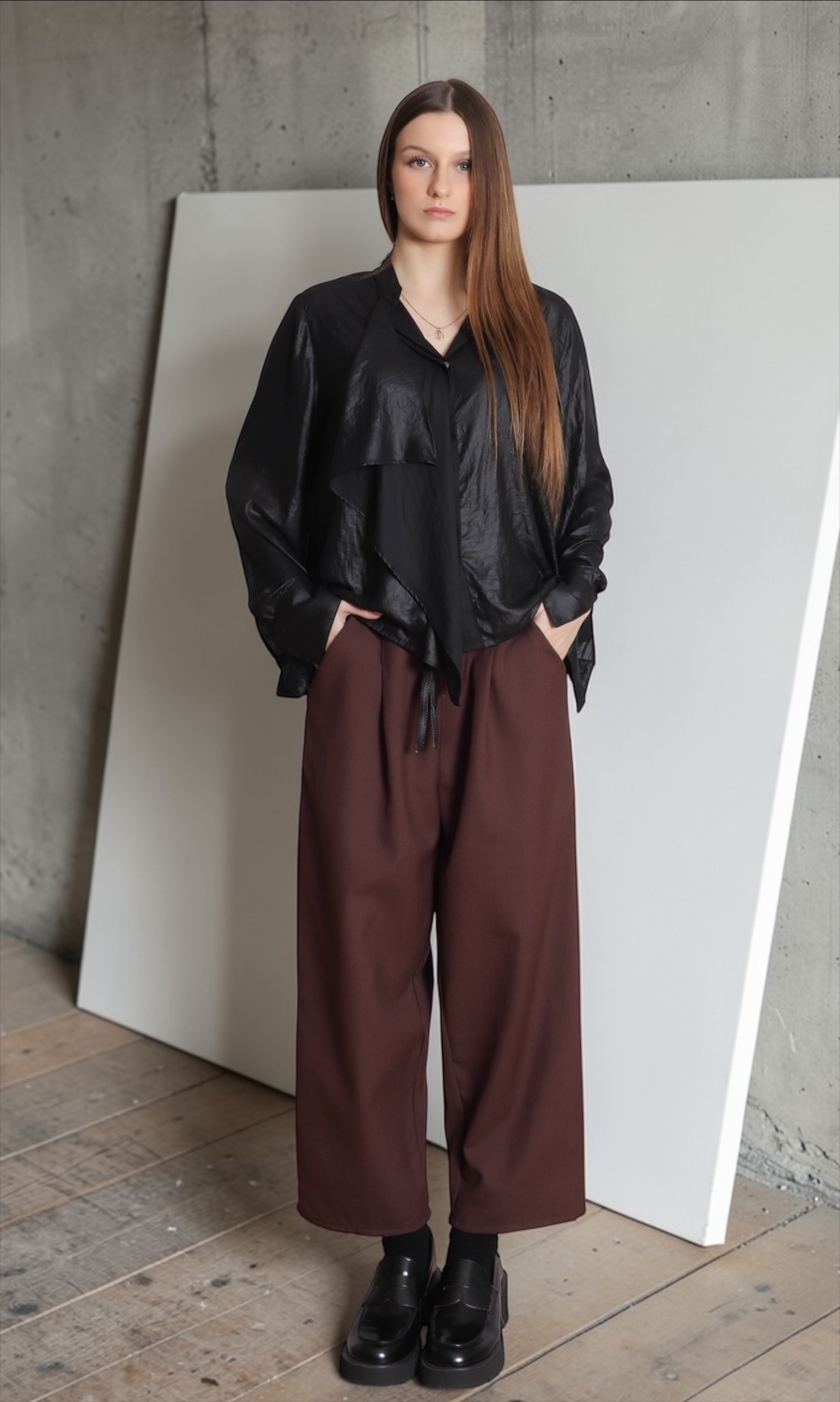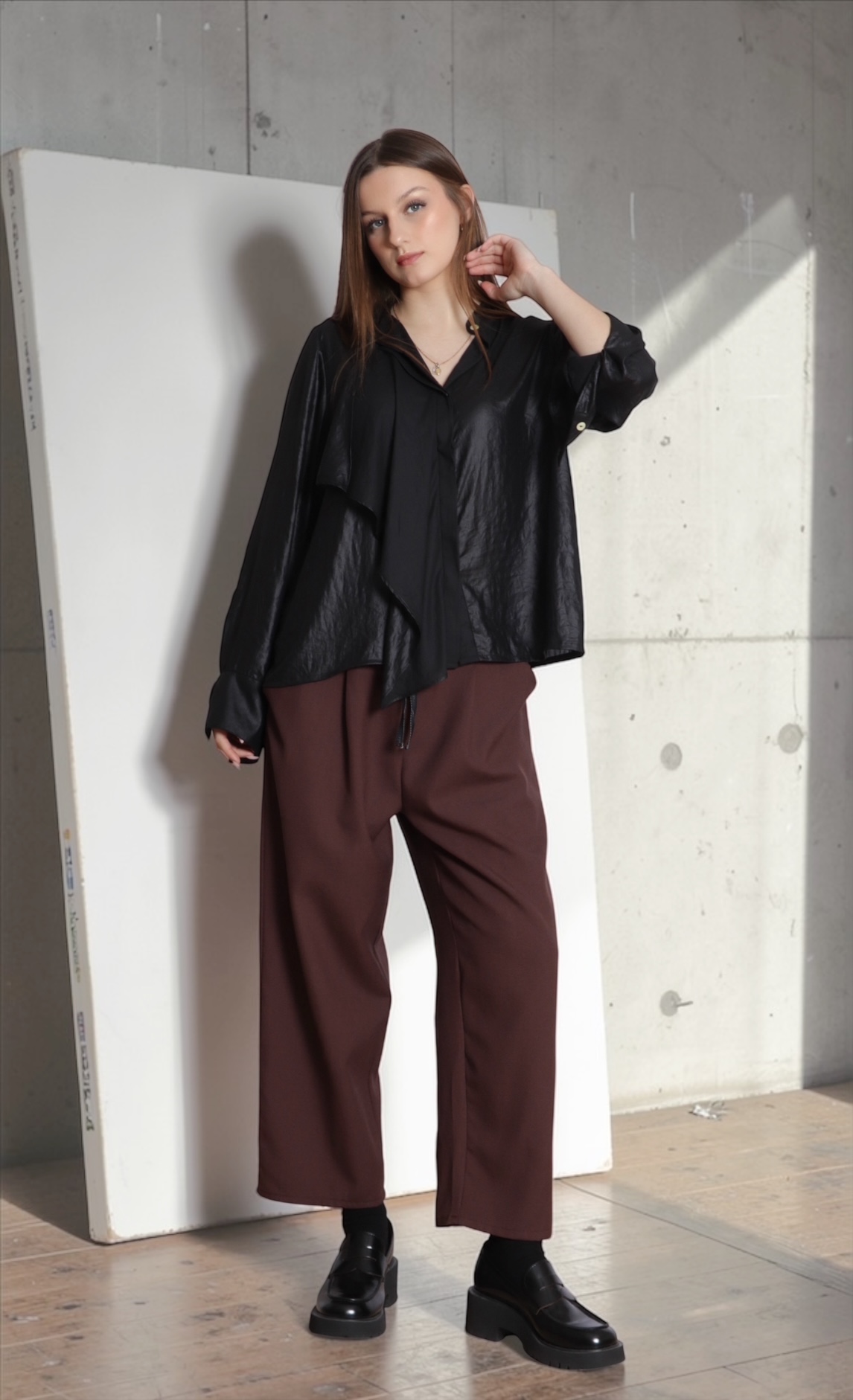 • Mulher com camisa preta brilhante, calças castanhas largas e sapatos pretos em interior com chão de madeira.