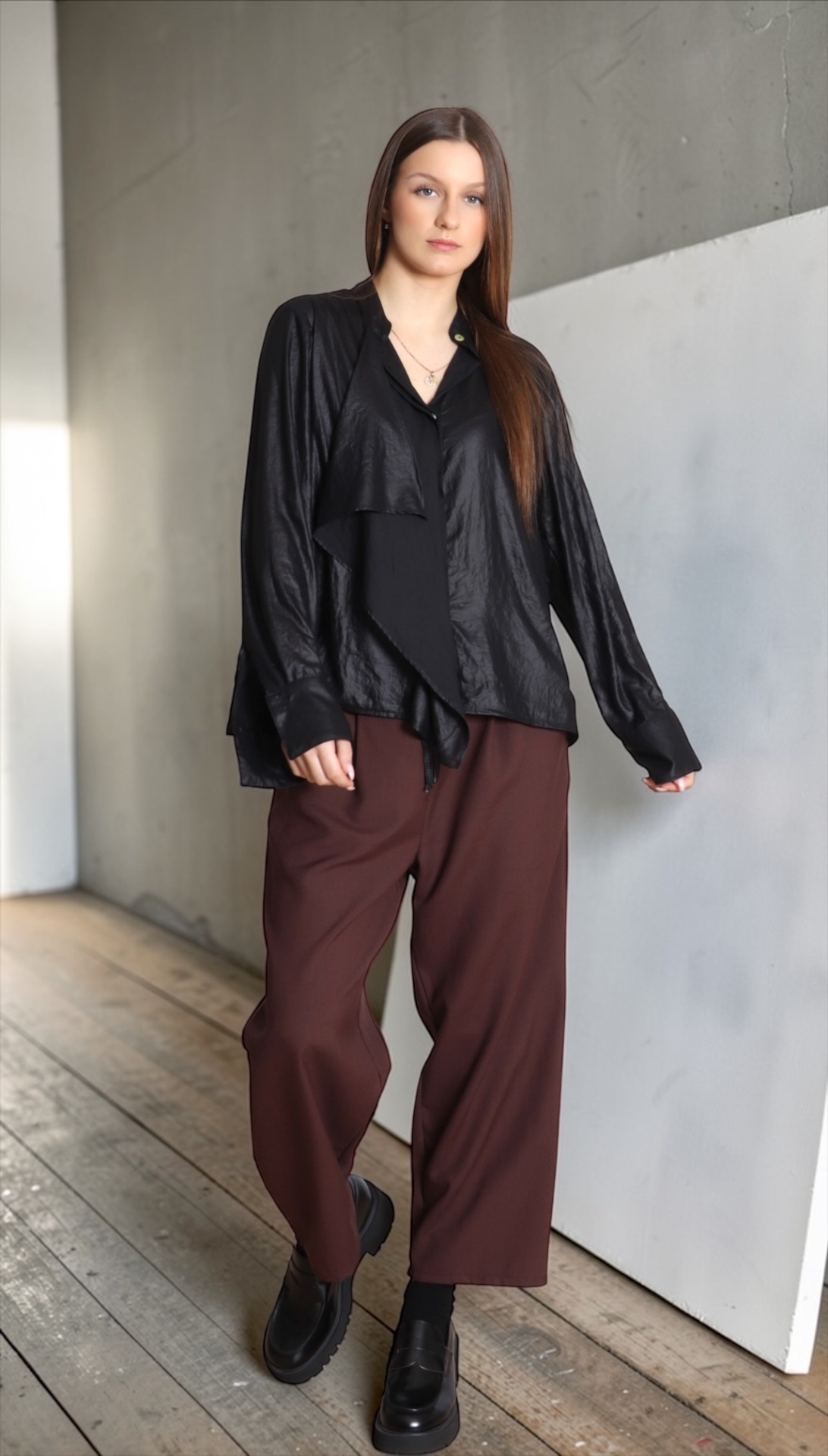 • Mulher com camisa preta brilhante e calças largas castanho-escuras