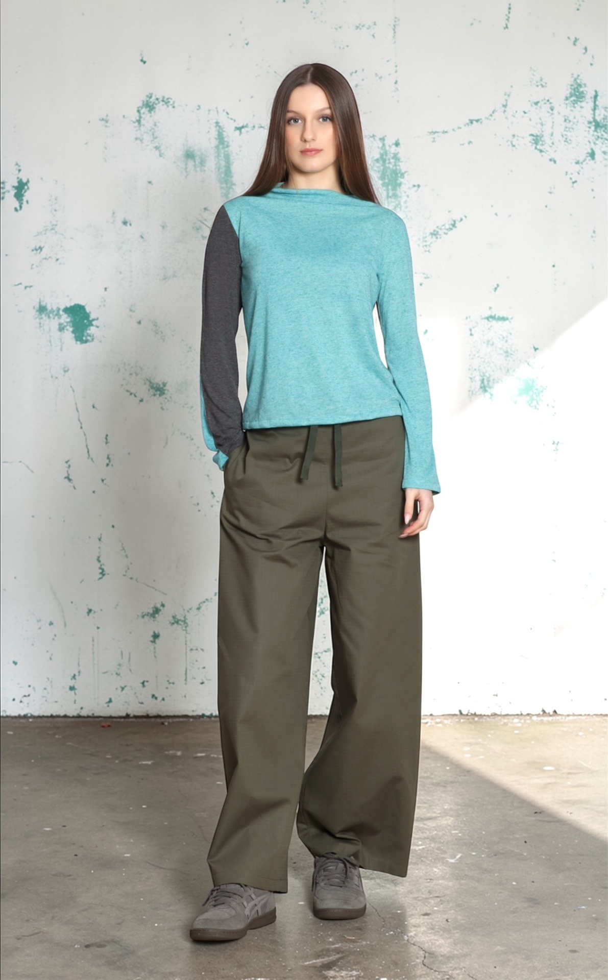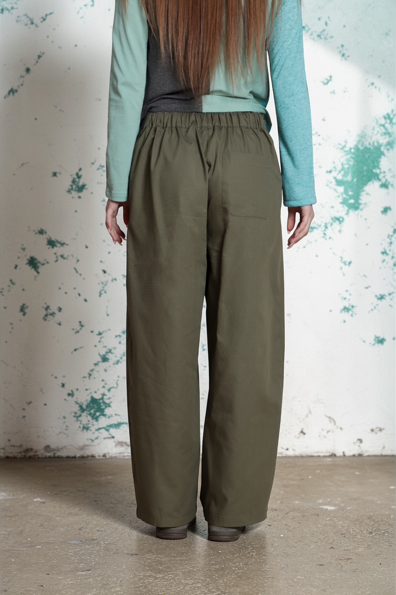 • Calças verdes largas com bolso traseiro e camisola verde e cinzenta vistas de costas.