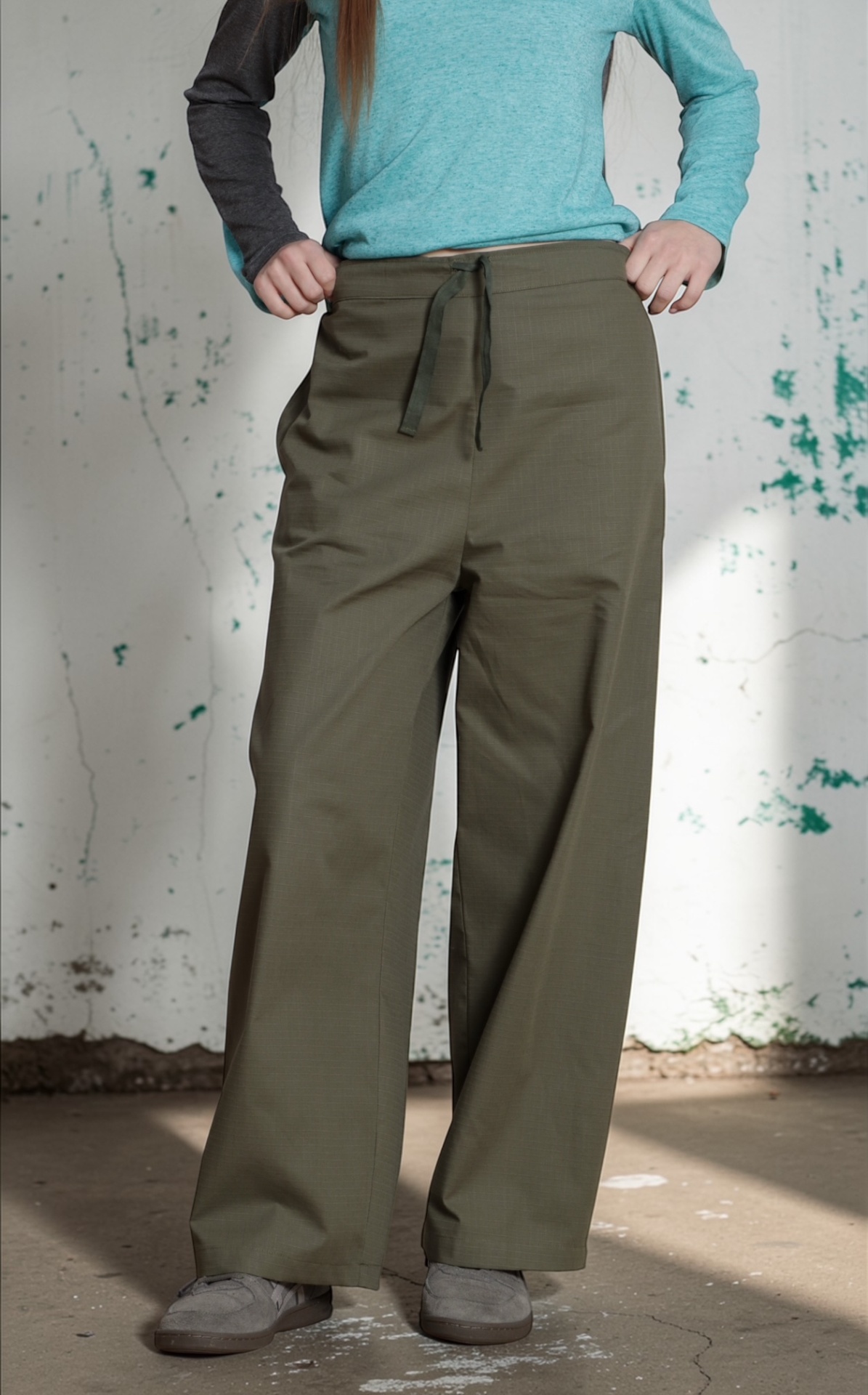 • Calças largas verde-oliva com cordão, usadas com camisola azul e ténis cinza, em interior com parede gasta