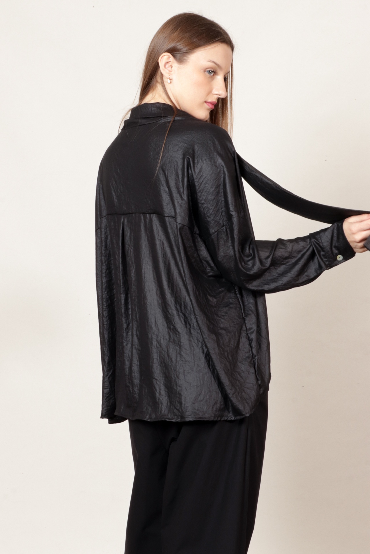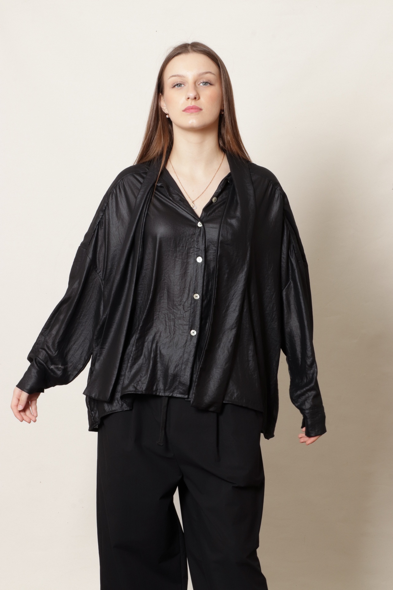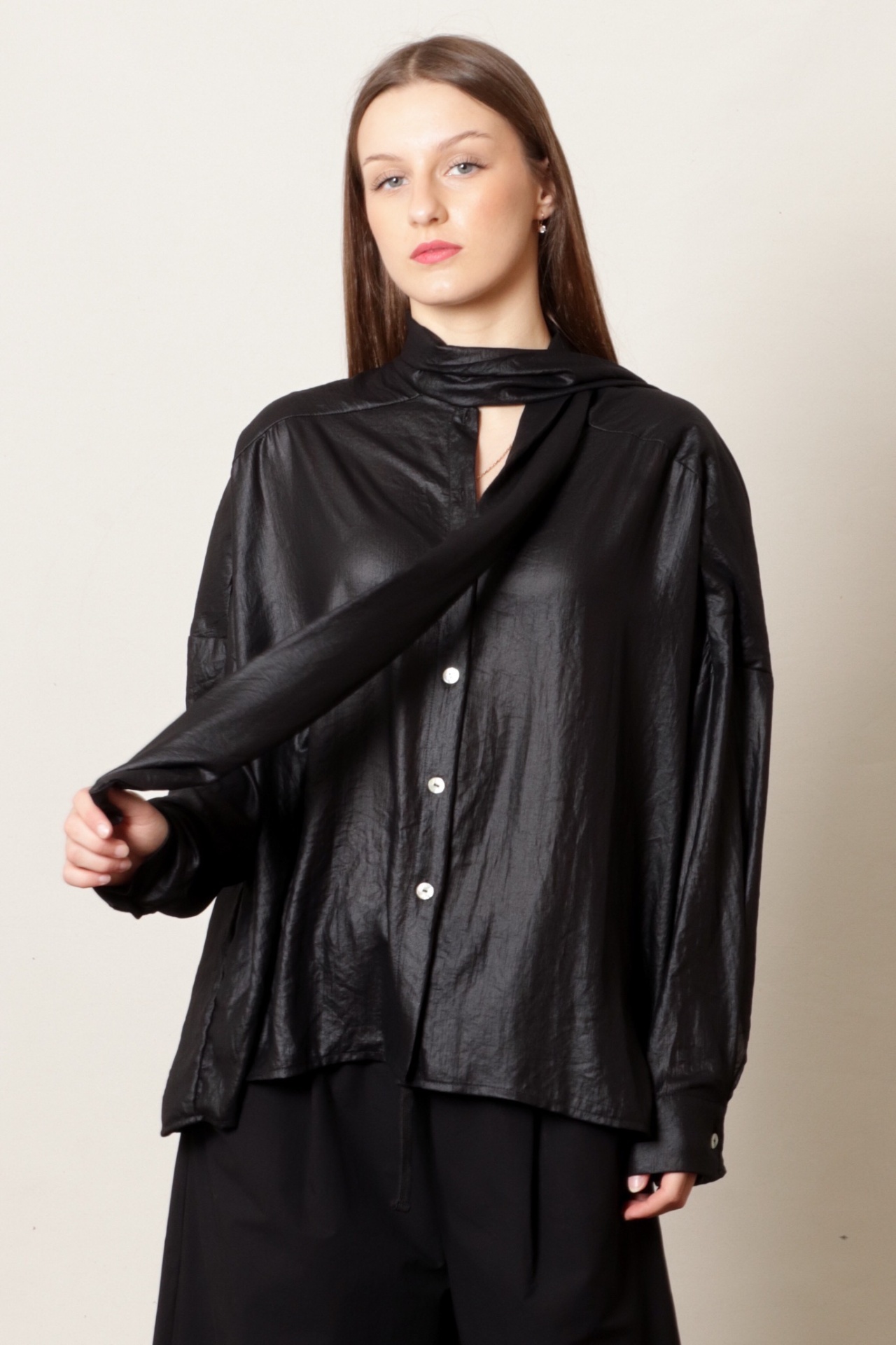 Camisa oversize com laçada em crepe de poliamida muito leve, com efeito brilho/baço, na cor preta . Pode ser usada com laçada ou com as tiras soltas para um look mais descontraído. É uma peça muito versátil que pode ser usada para uma festa ou de forma mais casual.