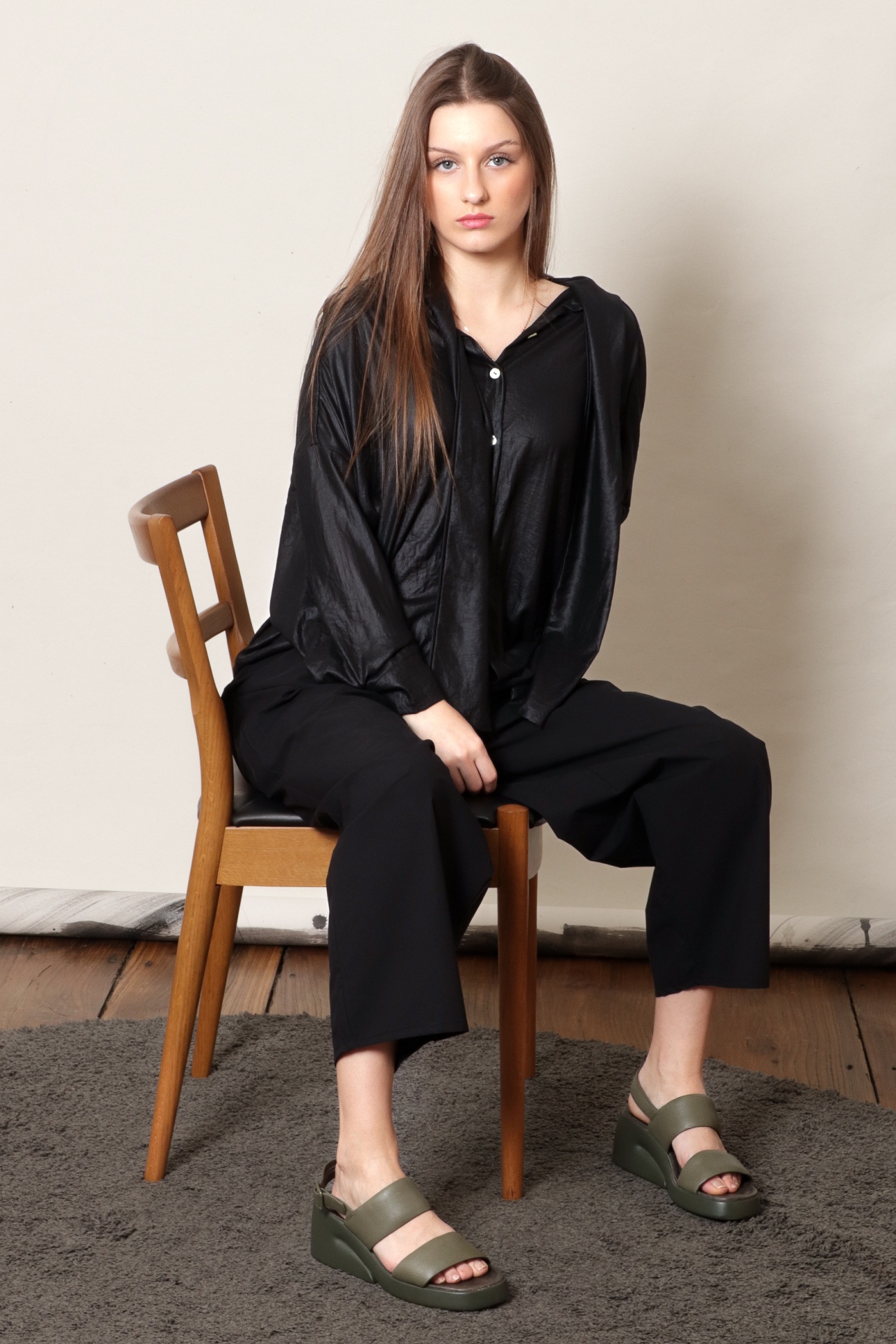 • Mulher sentada com roupa preta e sandálias verdes num tapete cinza