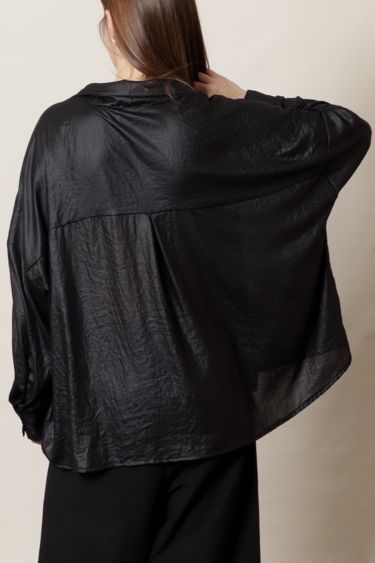 • blusa preta de tecido brilhante vista de costas