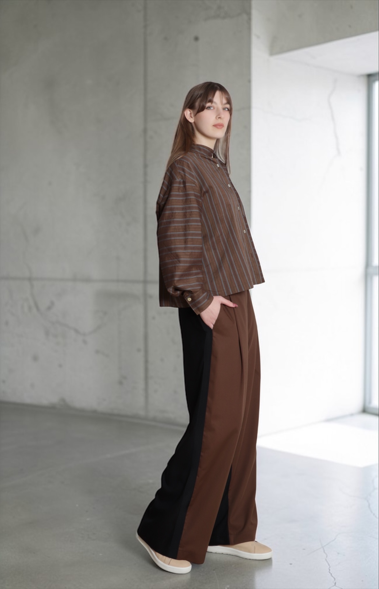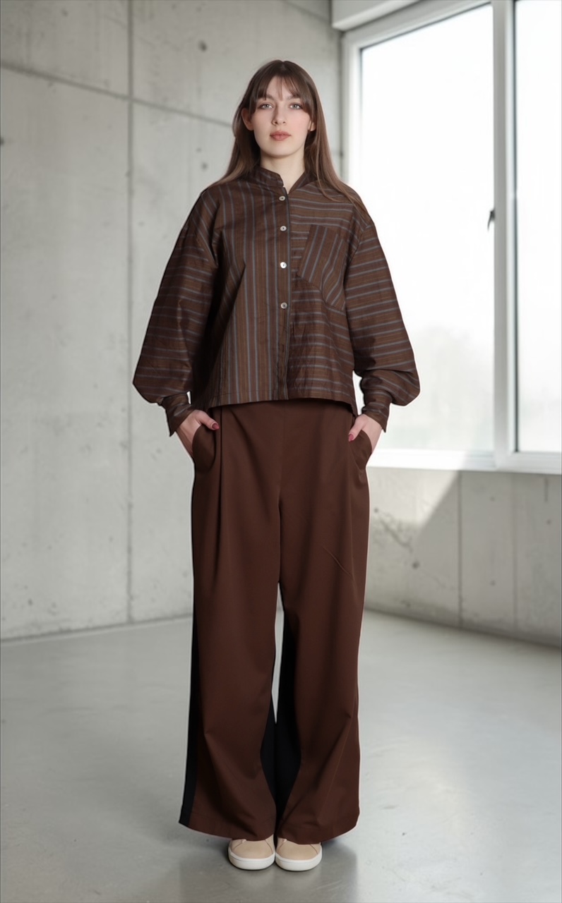 • Mulher com camisa castanha às riscas e calças largas castanhas com faixa preta, calçado bege, em espaço interior cinzento.