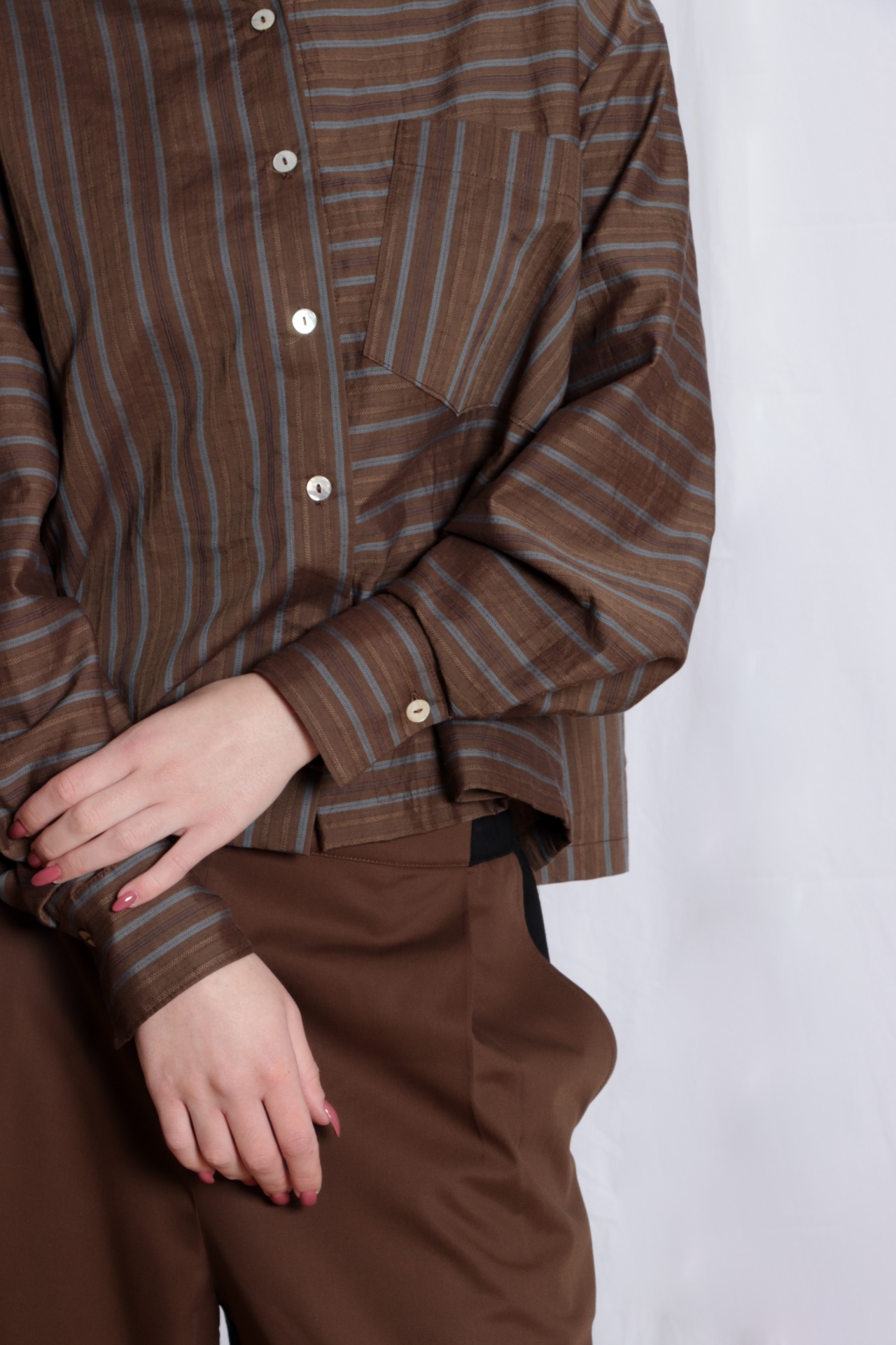 • Camisa castanha às riscas com botões e bolso, combinada com calças castanhas.