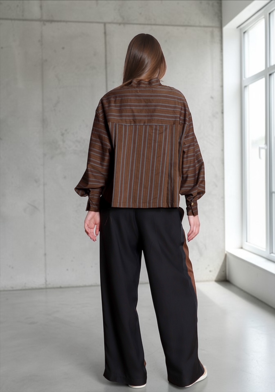 • Camisa castanha às riscas e calças largas castanhas com risca preta lateral
