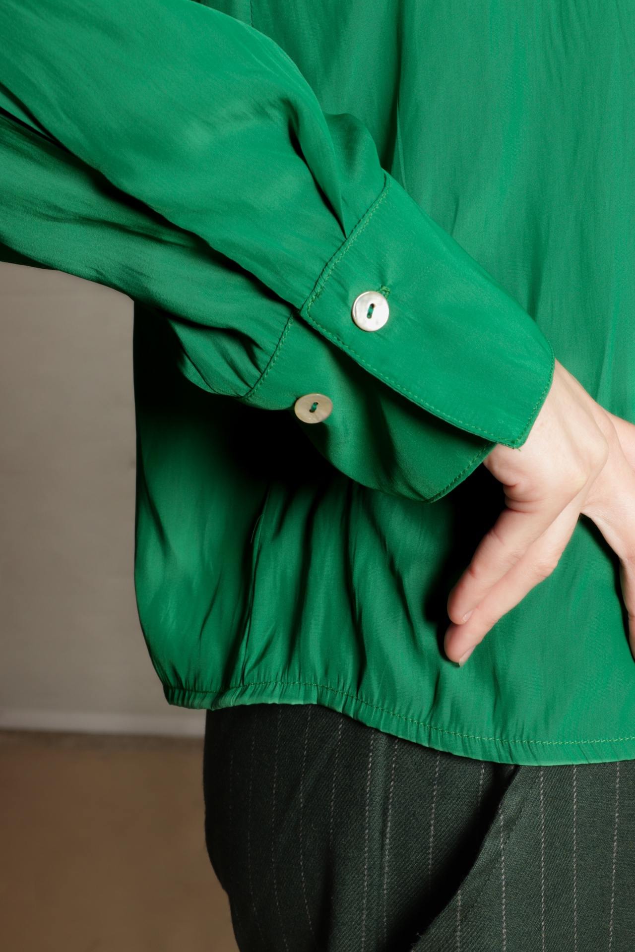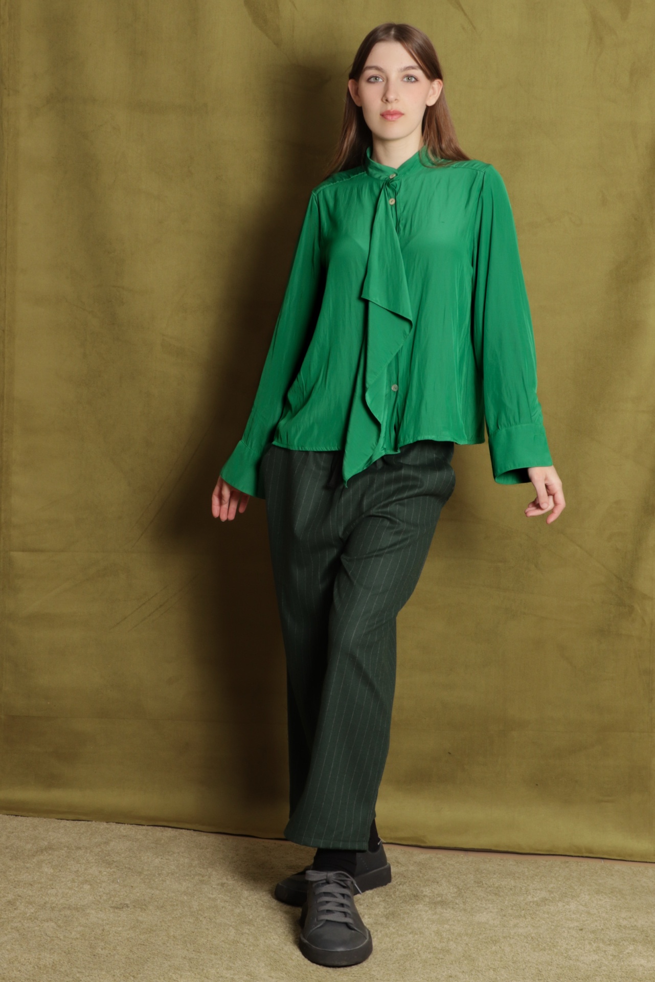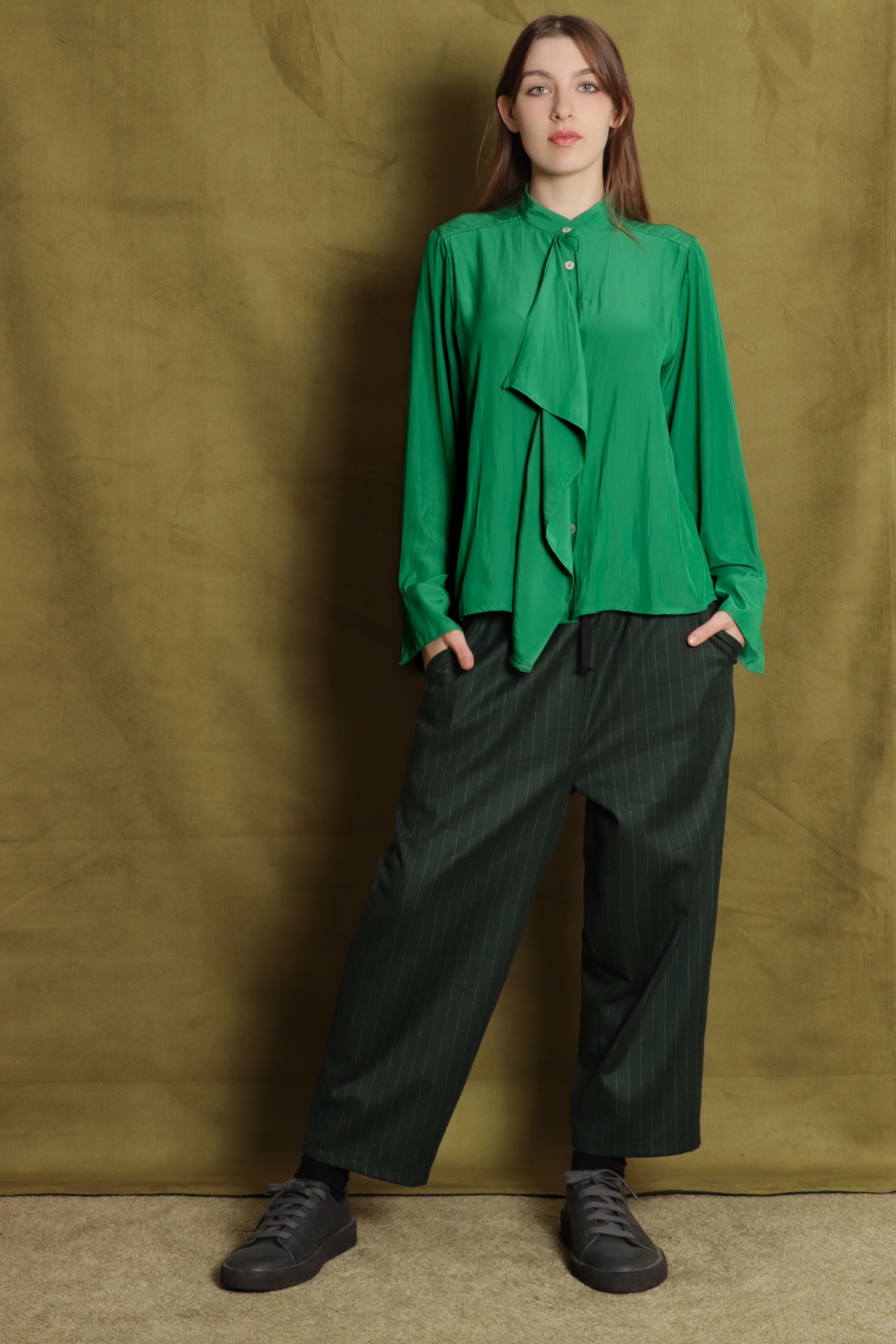 Camisa solta em tecido enrugado e acetinado, fino e muito fluido, na cor verde bandeira. Tem um folho aplicado ao longo da carcela, gola à padre e aperta com botões de madrepérola. Tem manga comprida com punho alto. É uma camisa de festa, que também pode ser usada no dia a dia em look city chic.