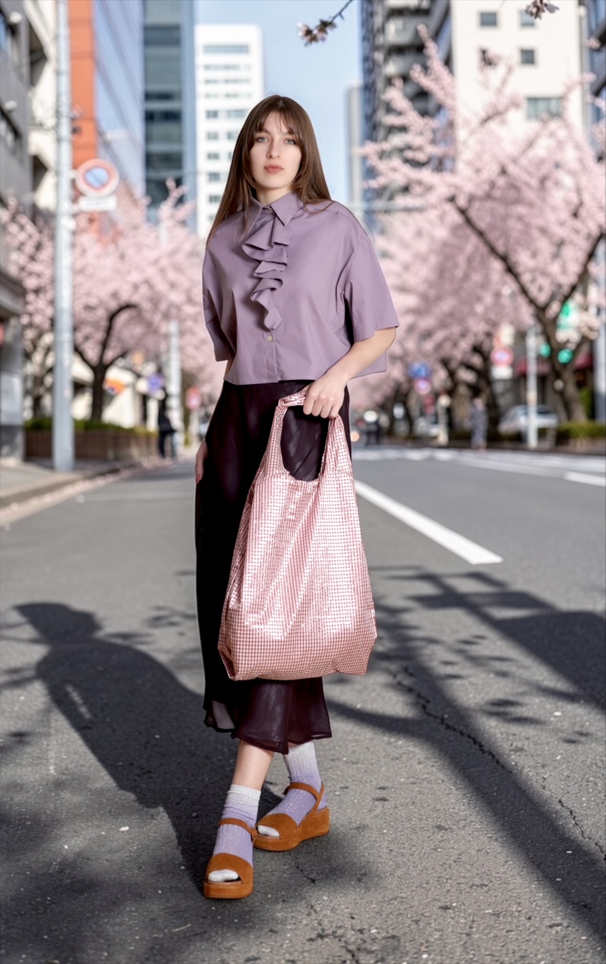 • Mulher de pé numa rua urbana com árvores floridas, vestindo roupa lilás e preta, segurando um saco rosa