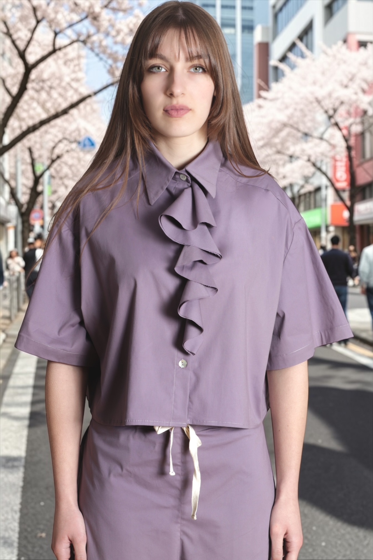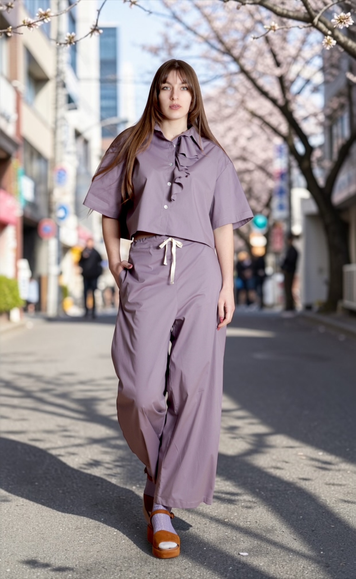 • mulher com conjunto lilás de camisa e calças largas e sapatos castanhos em rua com árvores floridas