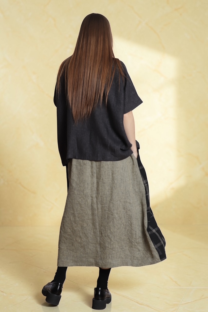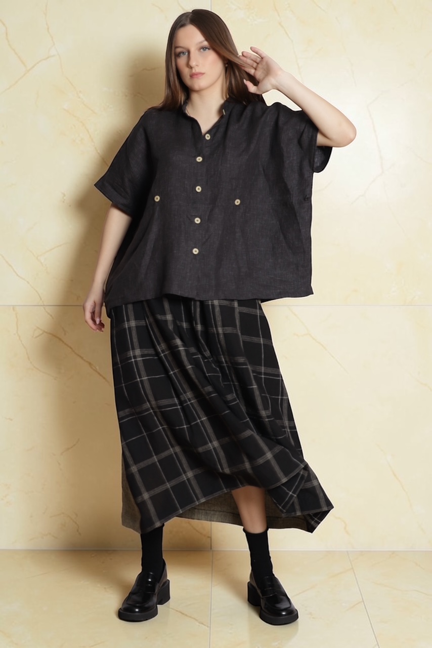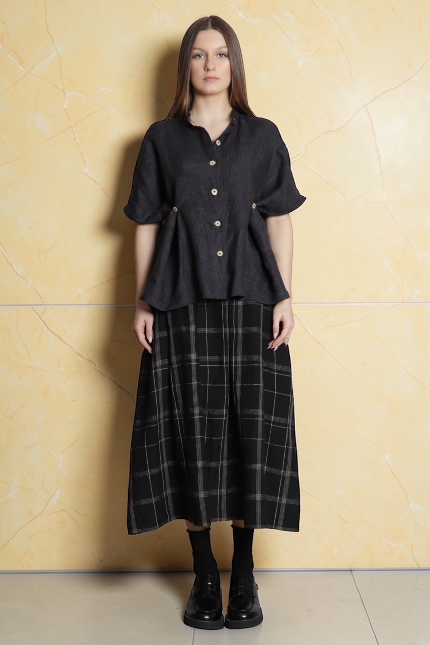 • Conjunto feminino preto com blusa de linho e saia xadrez