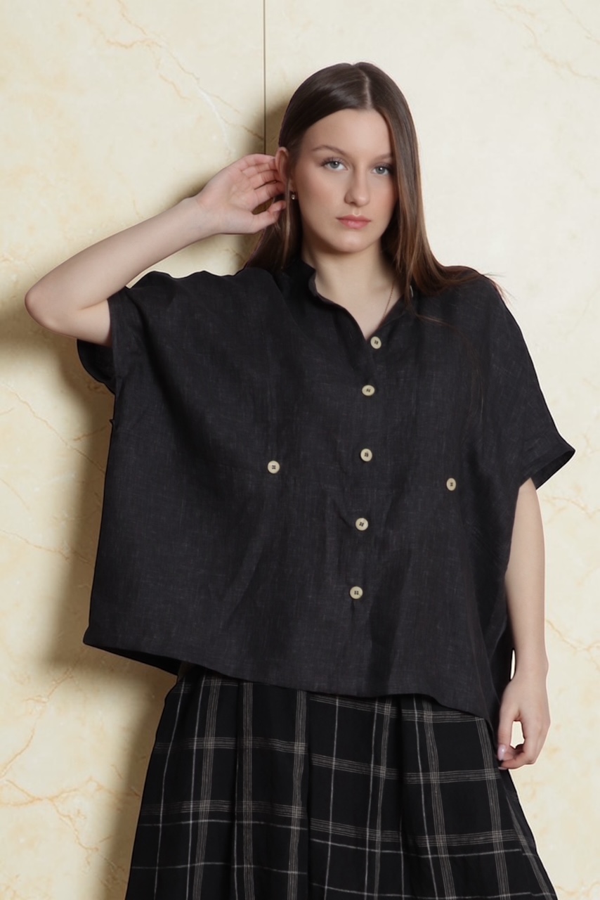 Camisa oversize ajustável em mistura algodão e linho. Tem gola à padre e manga japonesa. Aperta com 6 botões de fantasia e é ajustável na cintura por duas presilhas no mesmo material. É um modelo muito descontraído e fresco.