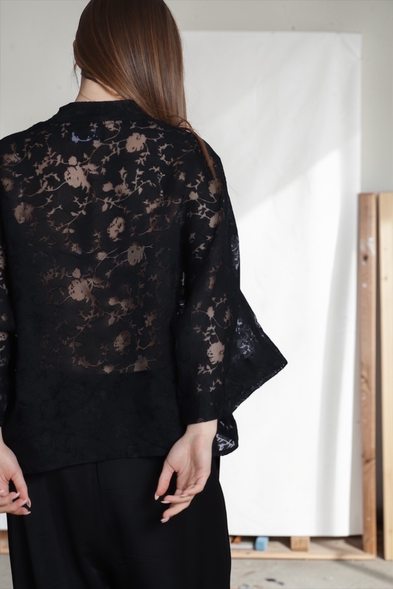 Camisa curta oversize em tecido com motivo floral aplicado em tule, efeito devoré. Tem gola à padre e aperta com botões de madrepérola escondidos por carcela dupla. Tem manga morecego larga com comprimento 3/4. É uma camisa de look japonês, muito confortável e elegante. Esta camisa não é forrada, assumindo um look semitransparente e pode ser usada aberta por cima de um vestido.