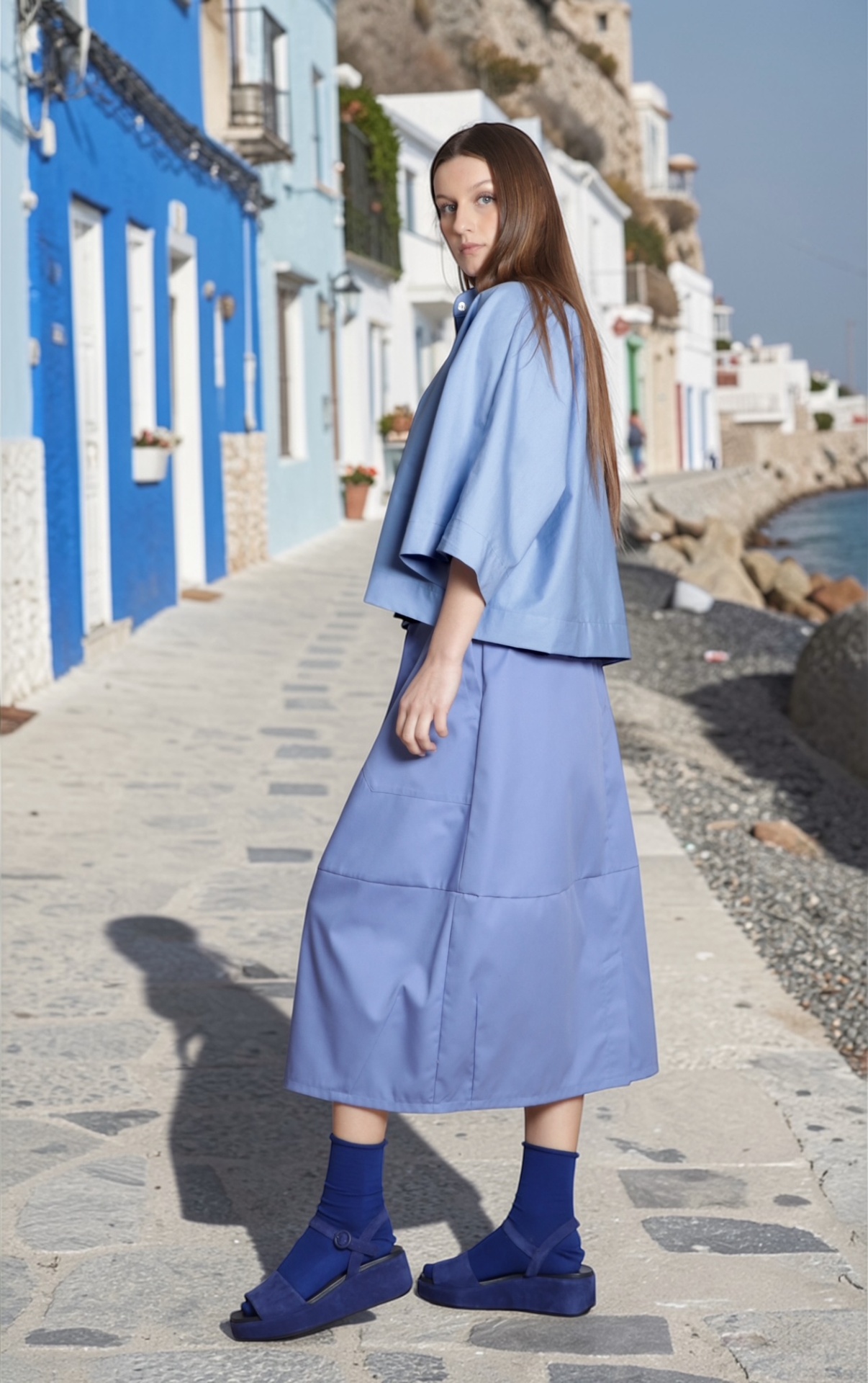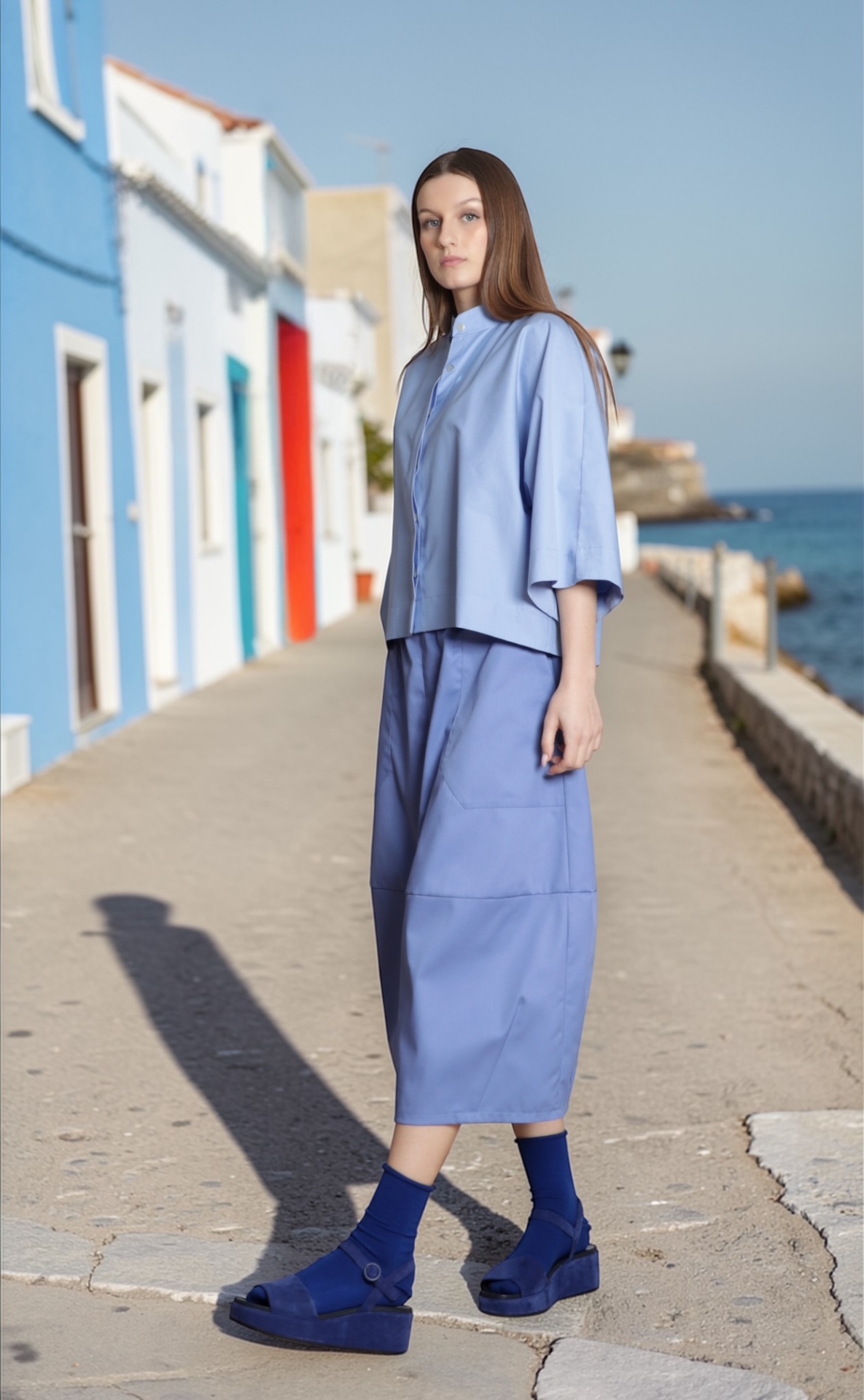 • Mulher veste conjunto azul claro com sandálias azuis numa rua junto ao mar