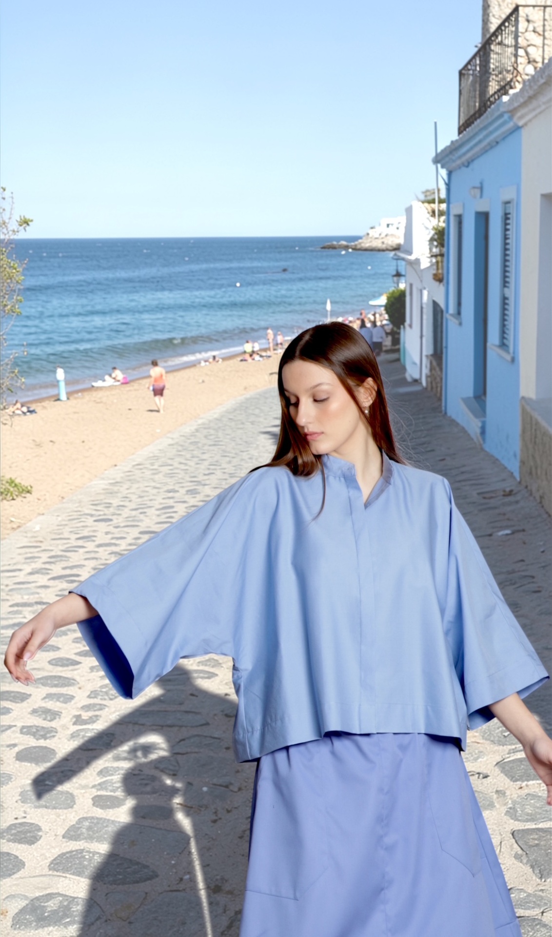 • Mulher com roupa azul claro de tecido liso na rua junto à praia