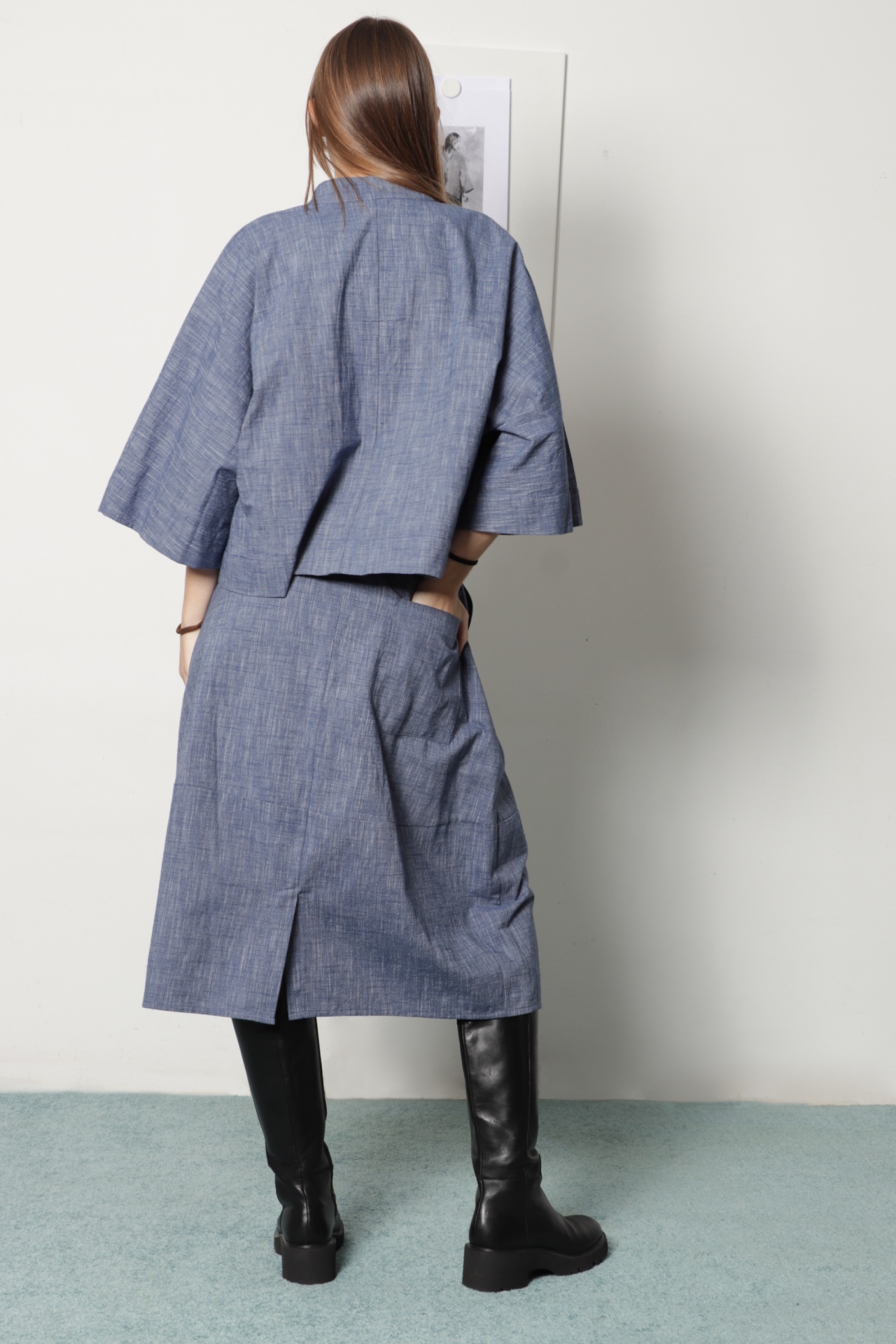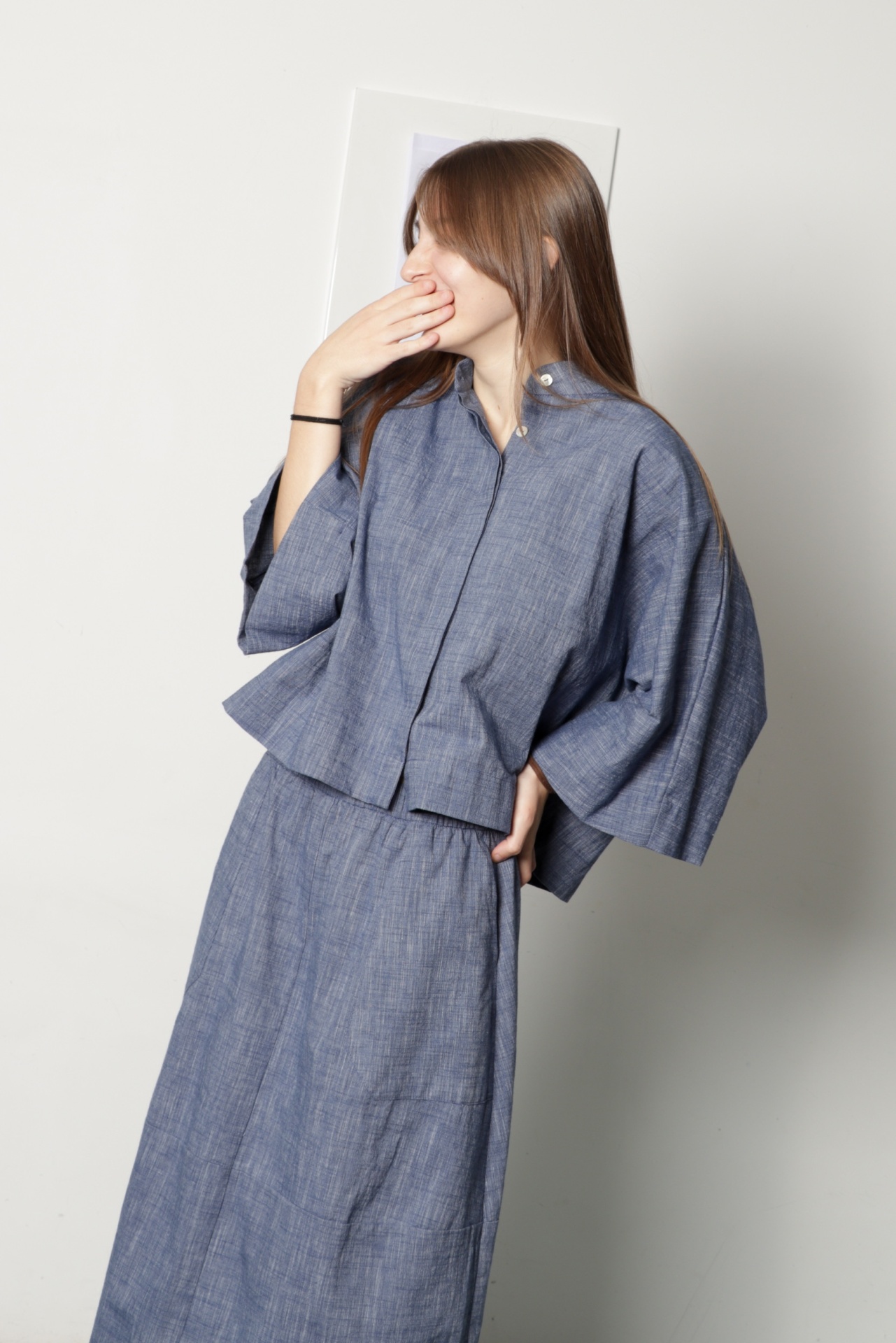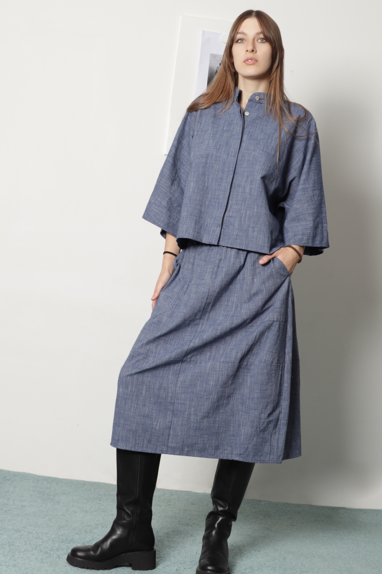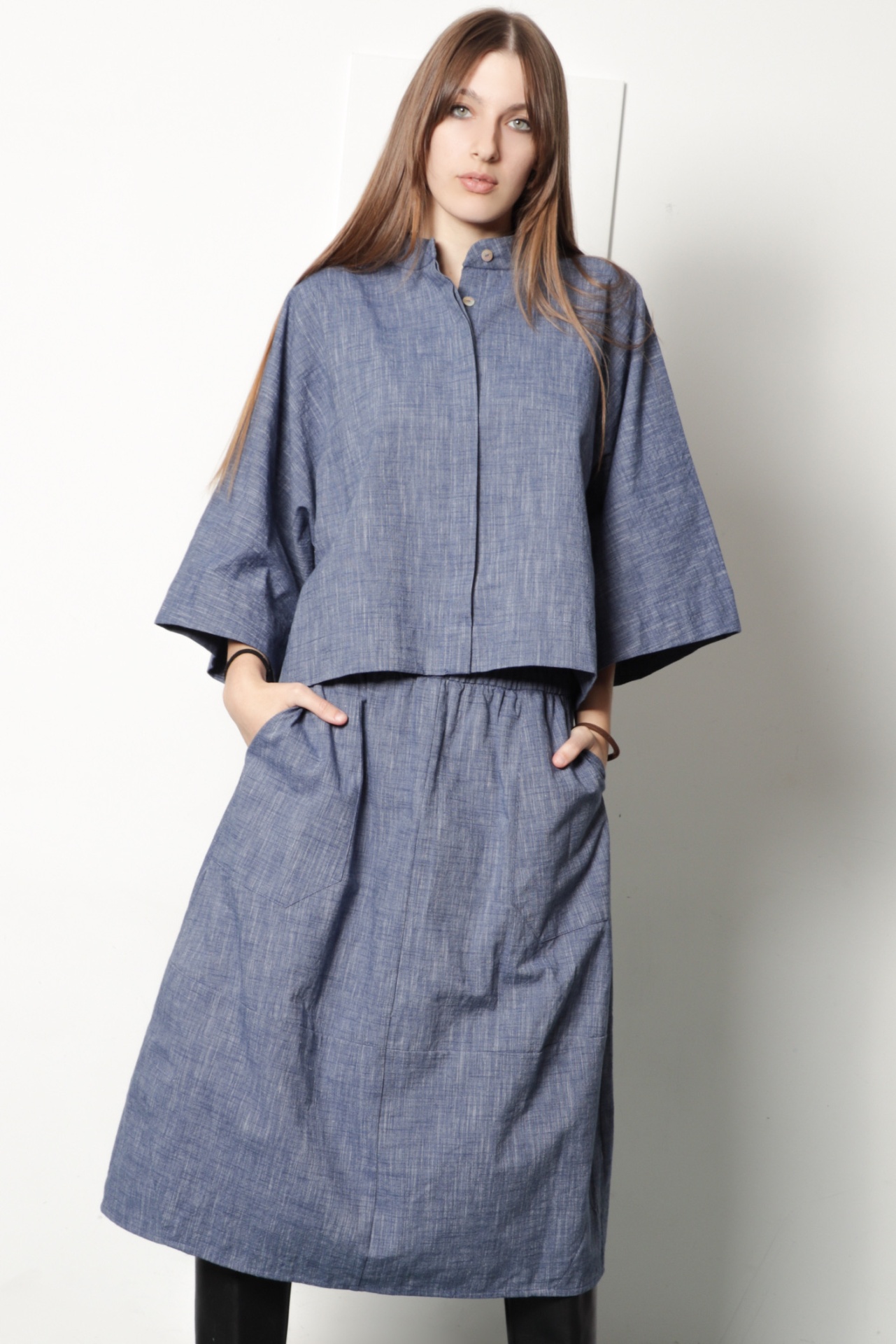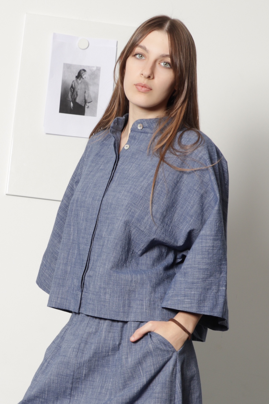 Camisa curta oversize em tecido de algodão azul mescla. Tem gola à padre e aperta com botões de madrepérola escondidos por carcela dupla. Tem manga morecego larga com comprimento 3/4. É uma camisa de look japonês, muito confortável.