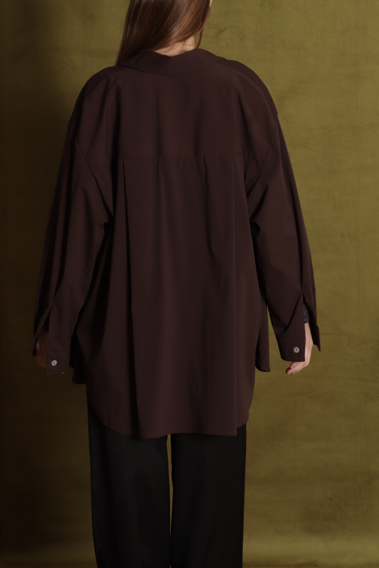 Camisa oversize, estilo "boyfriend shirt", em popeline castanho chocolate. Tem manga comprida com punho e botão, gola de camisa e e bolso grande na frente; escapulário com duas pequenas pregas nas costas. Tem bainha redonda na frente e verso. Também pode ser usada como sobrecamisa.