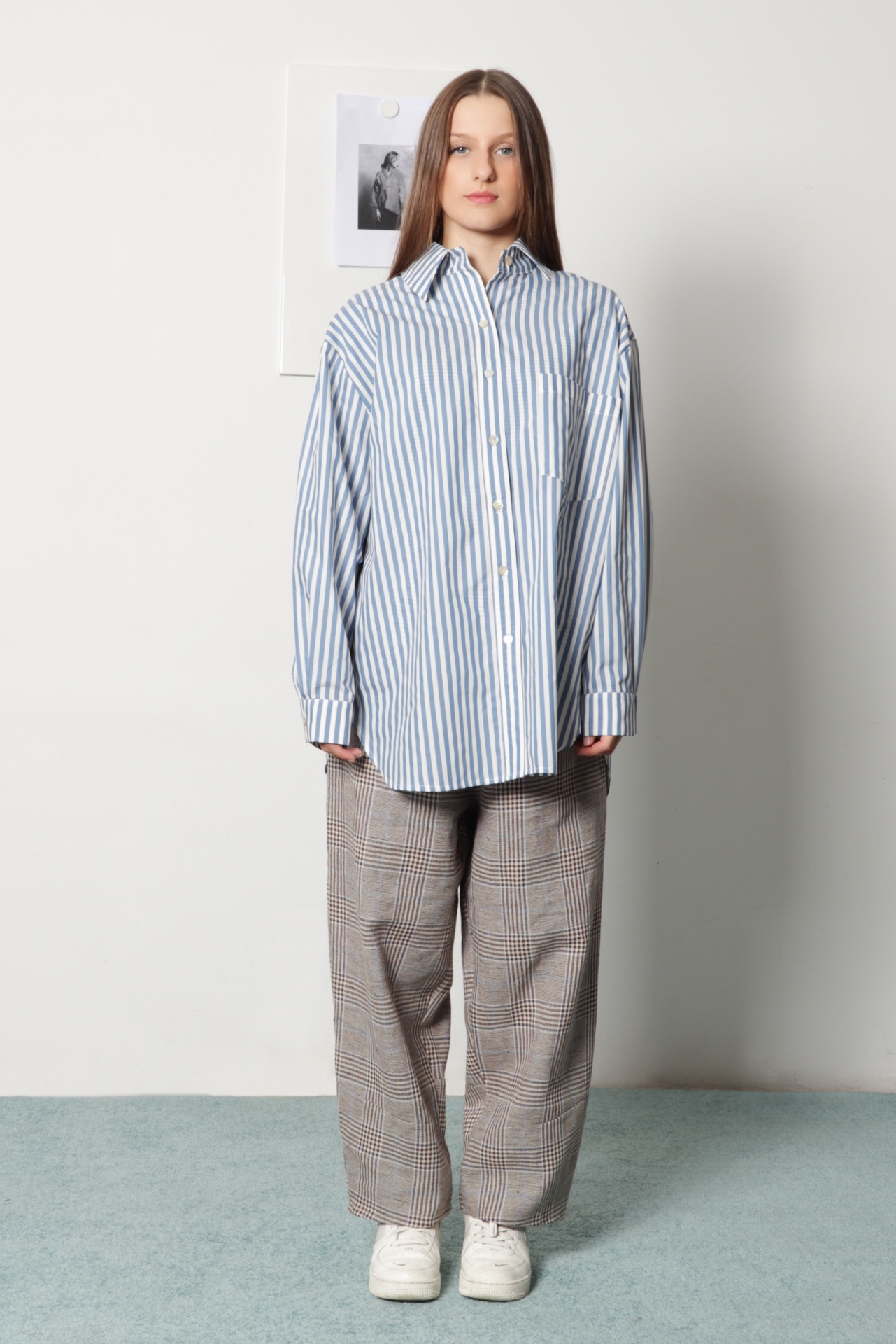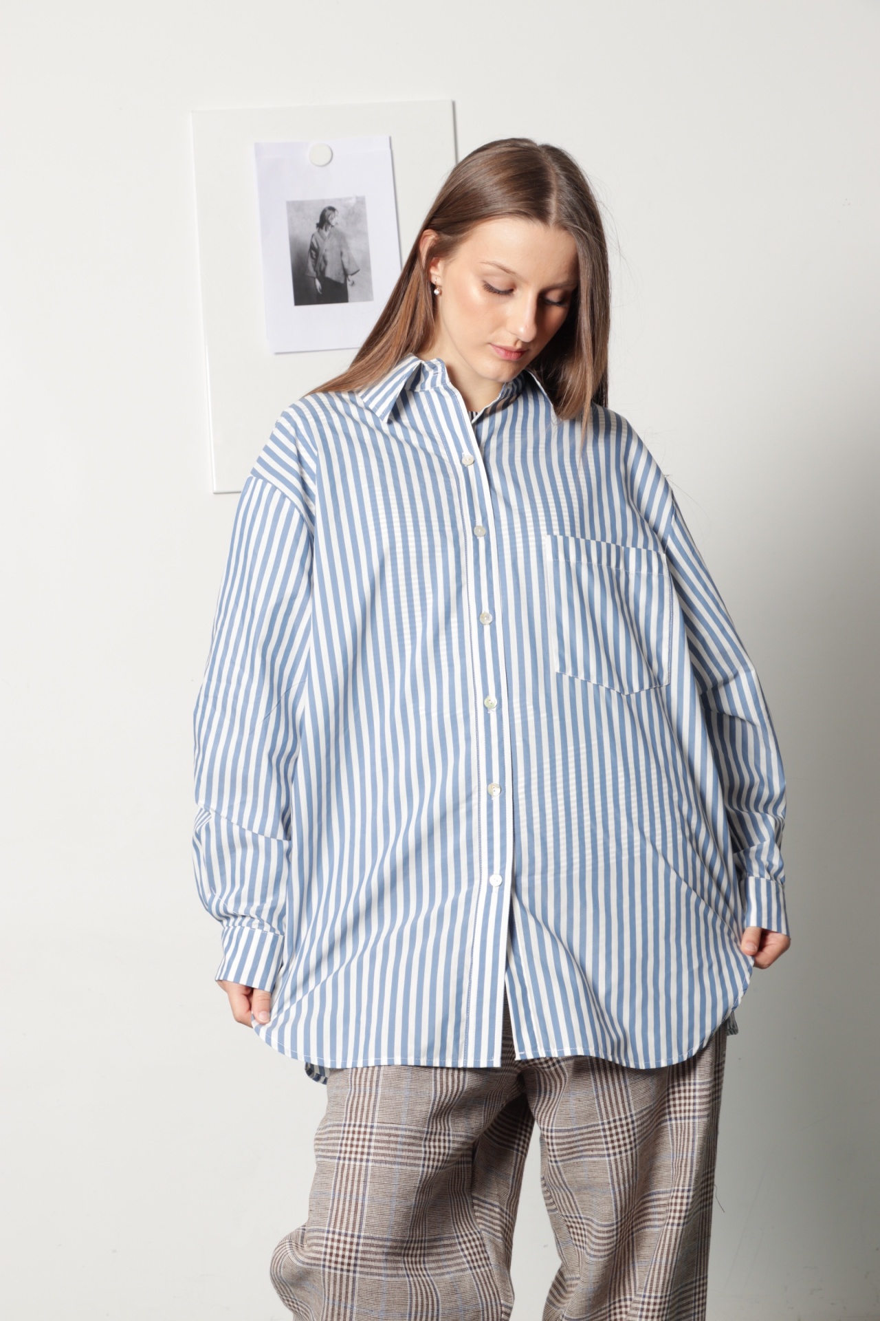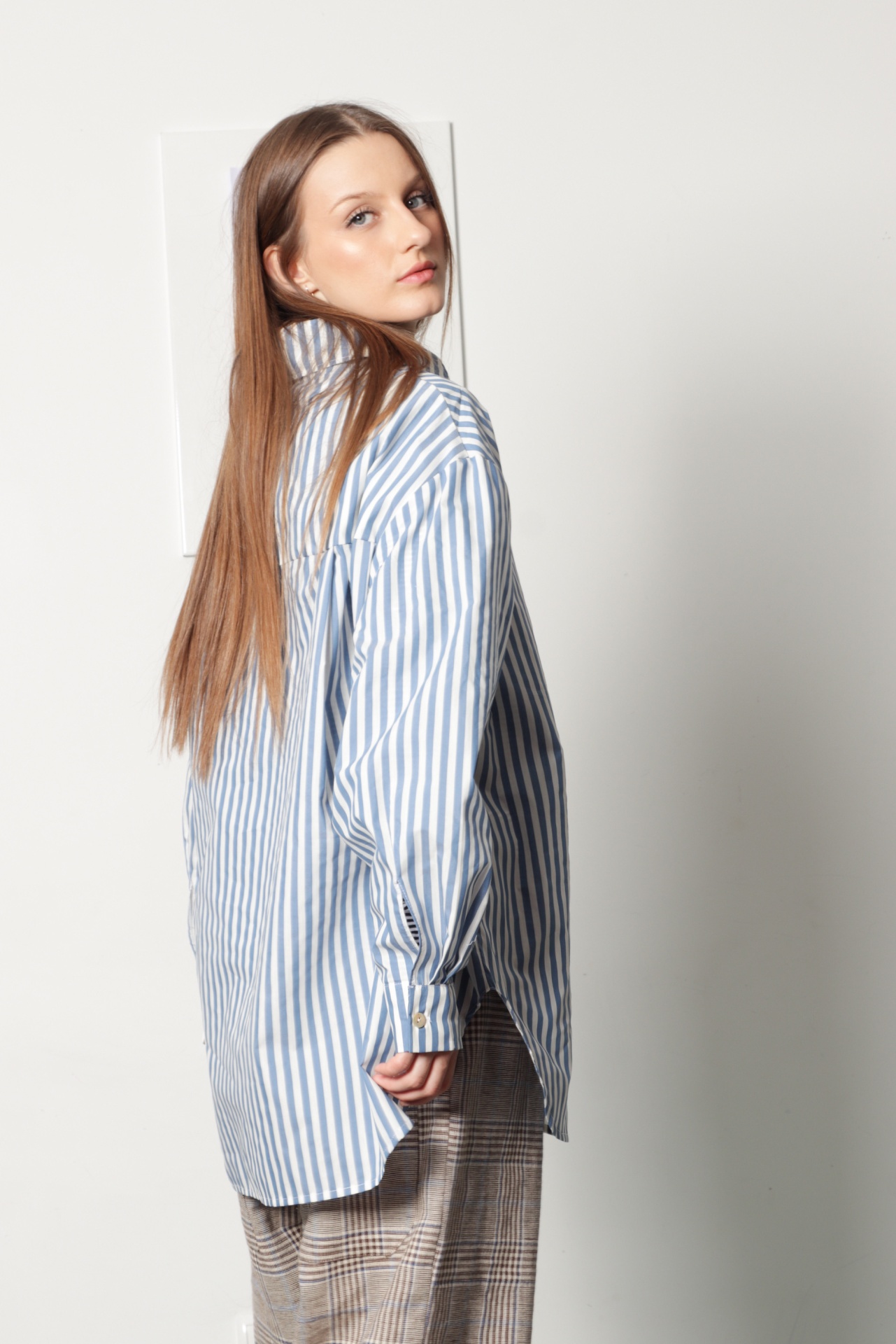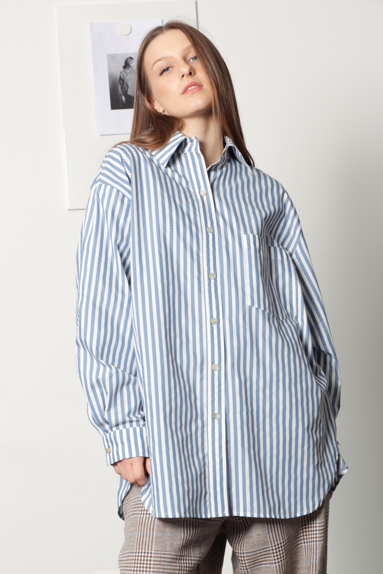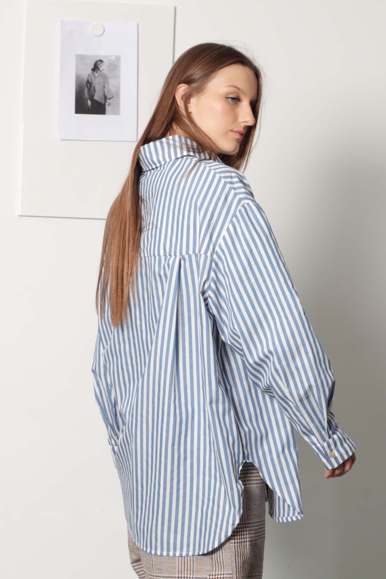 Camisa oversize, estilo "boyfriend shirt", em tecido de camisaria com riscas azul claro e branco. Tem manga comprida com punho e botão, gola de camisa e e bolso grande na frente; escapulário com duas pequenas pregas nas costas. Tem bainha redonda na frente e verso. Também pode ser usada como sobrecamisa.