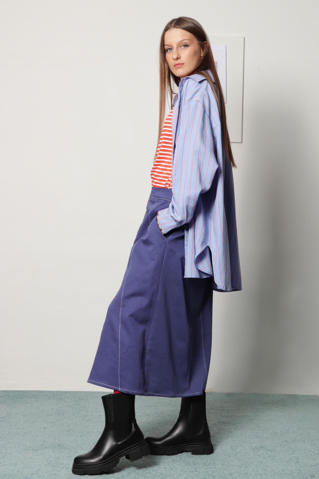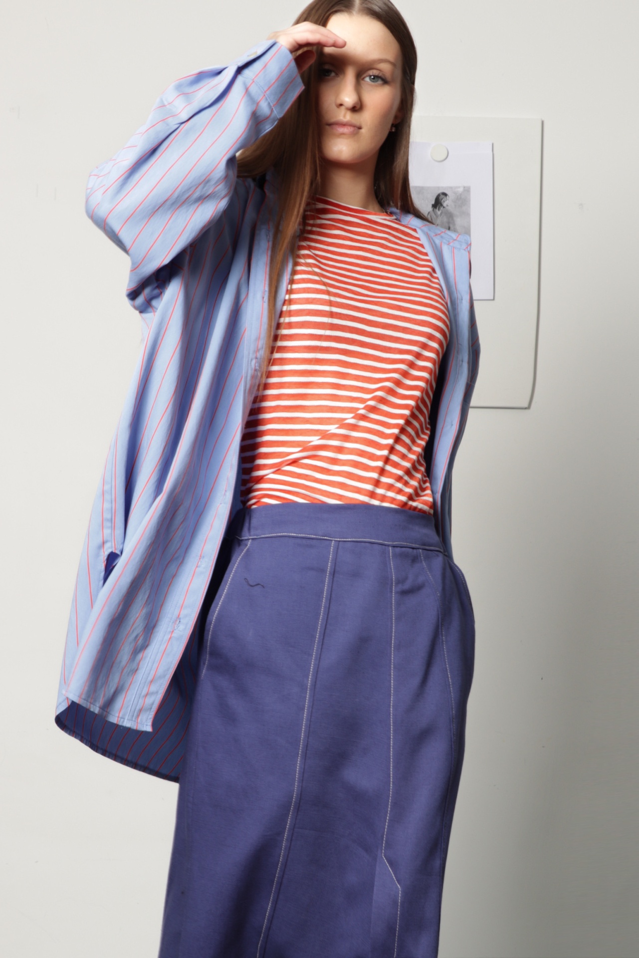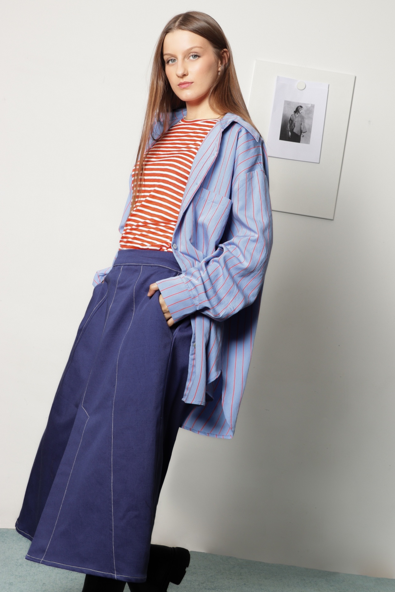 Camisa oversize, estilo "boyfriend shirt", em sarjinha de algodão azul clara com riscas laranja. Tem manga comprida com punho e botão, gola de camisa e e bolso grande na frente; escapulário com duas pequenas pregas nas costas. Tem bainha redonda na frente e verso. Também pode ser usada como sobrecamisa.