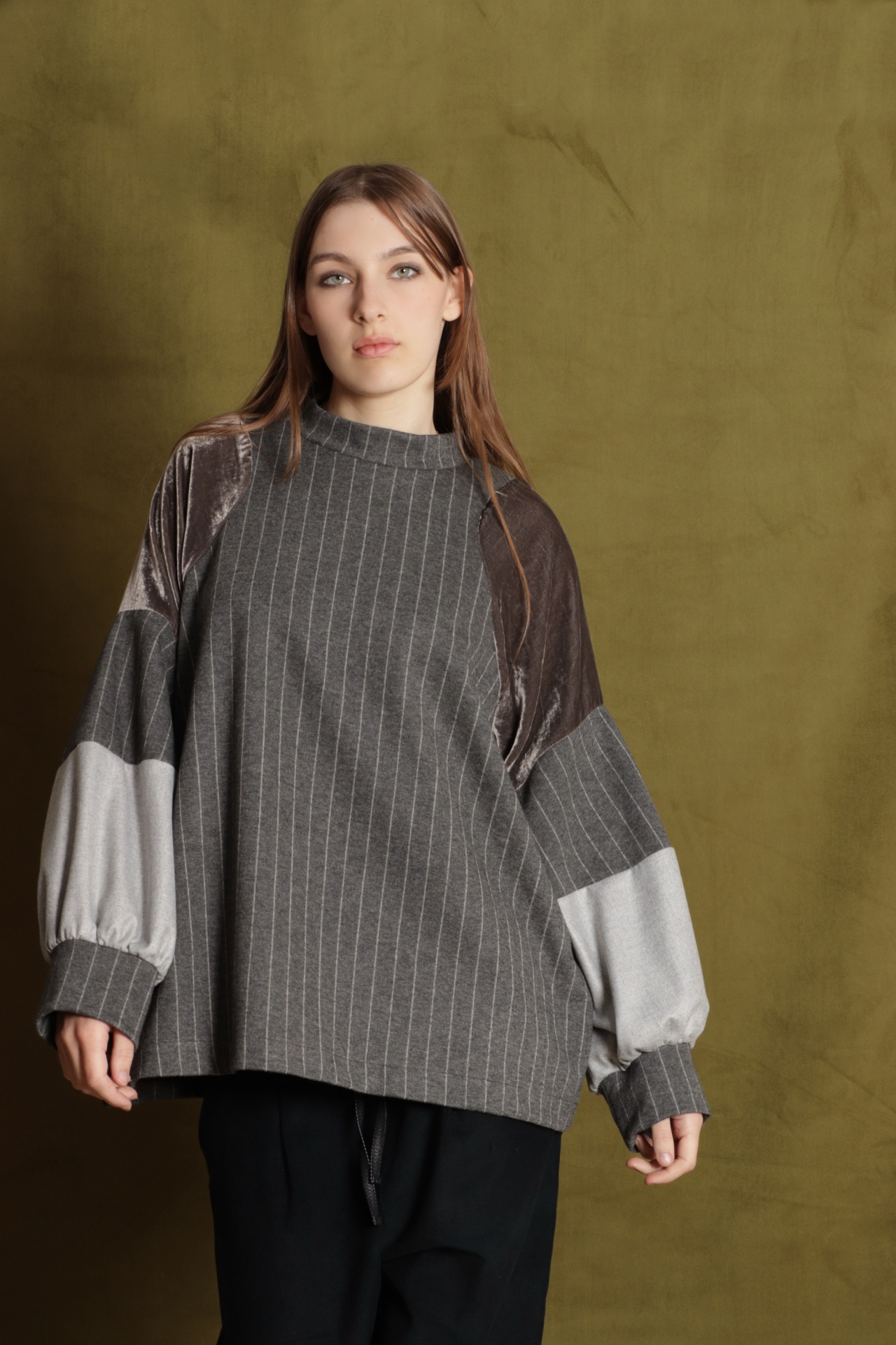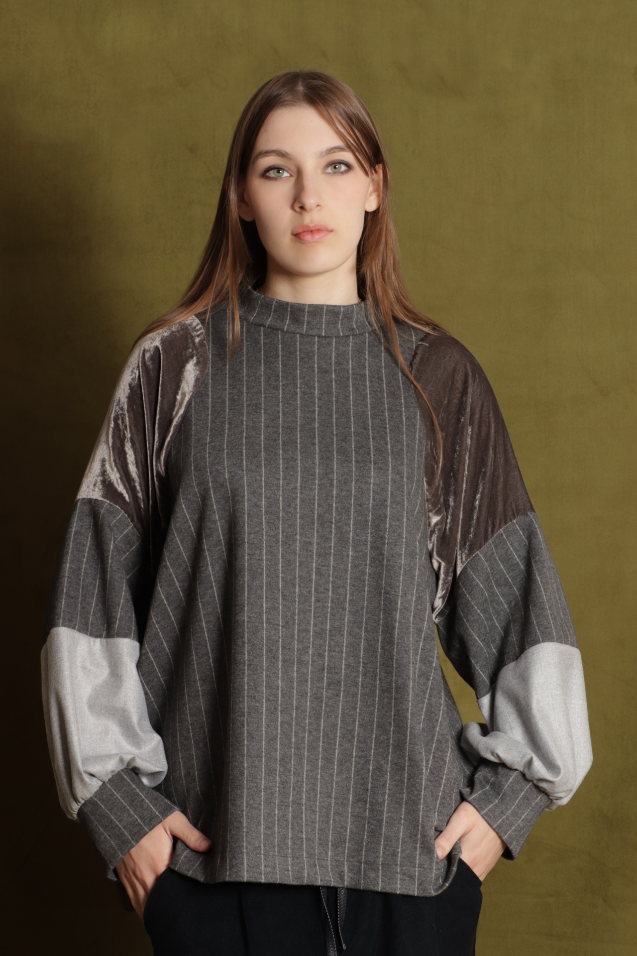 • Camisola feminina cinzenta com riscas verticais, mangas balão em patchwork e fundo castanho esverdeado