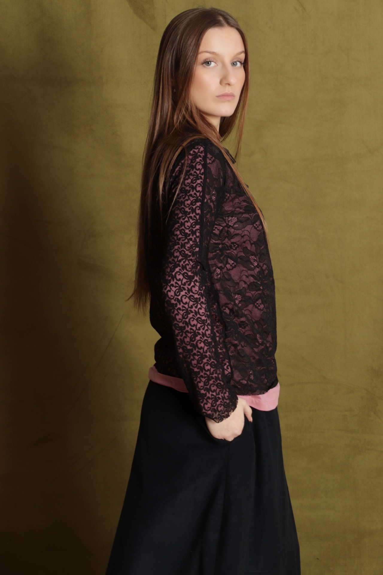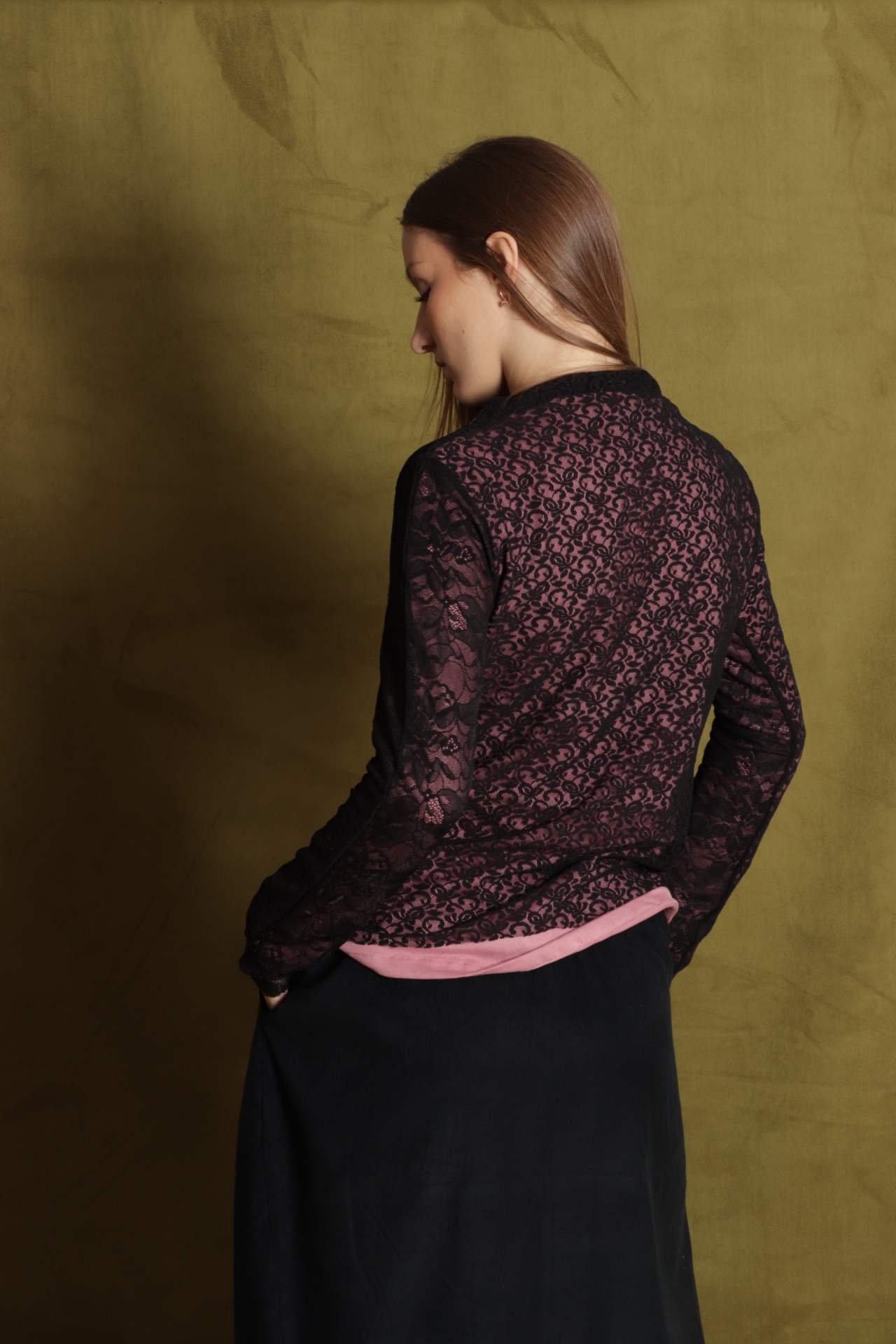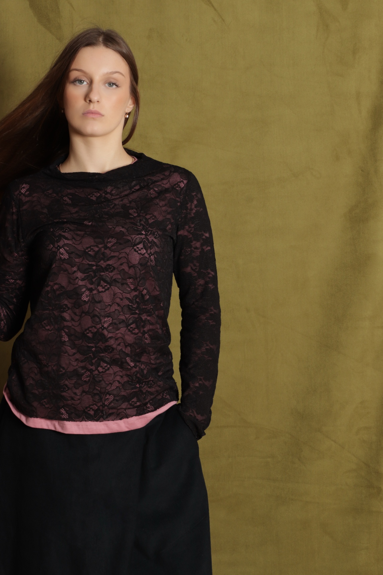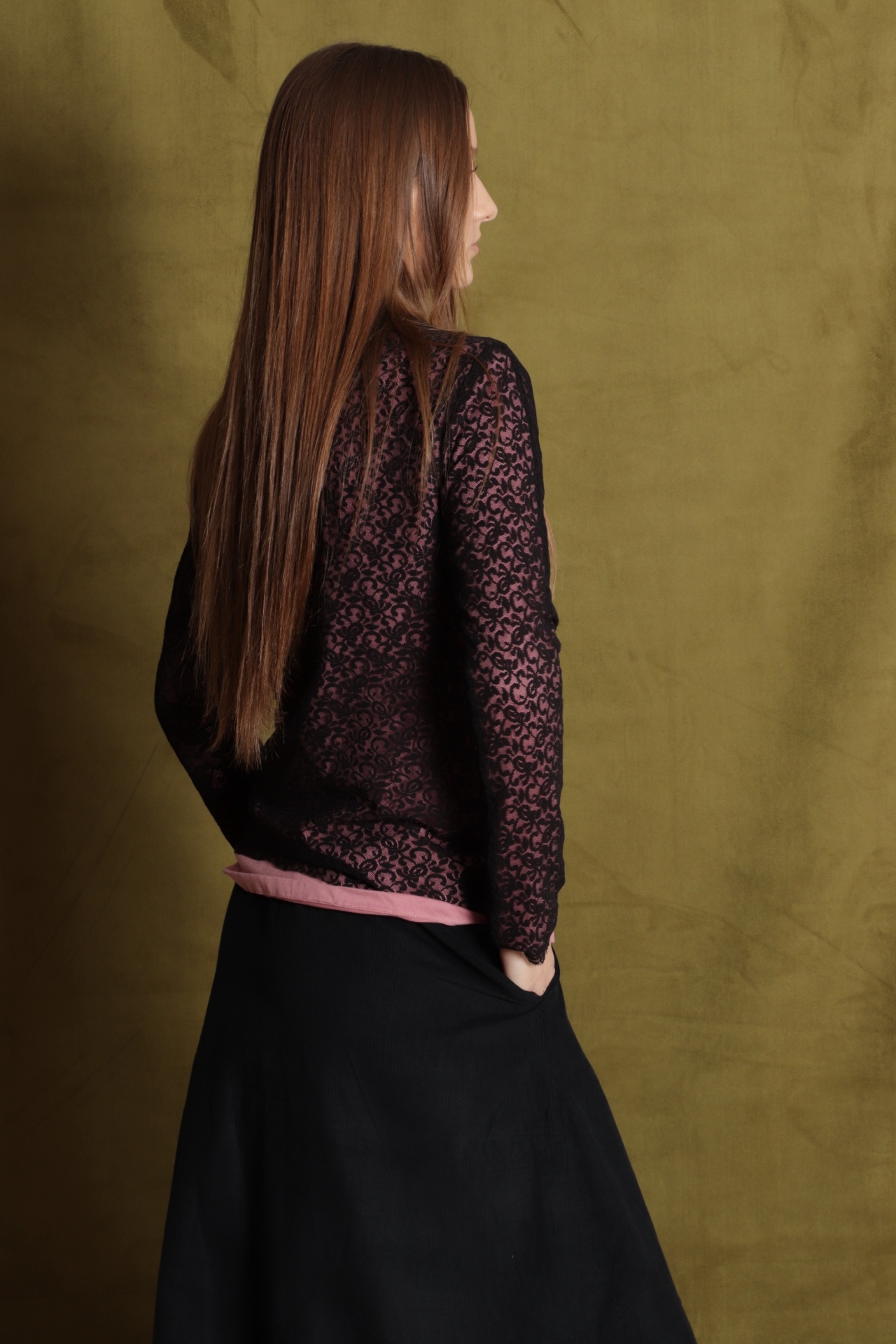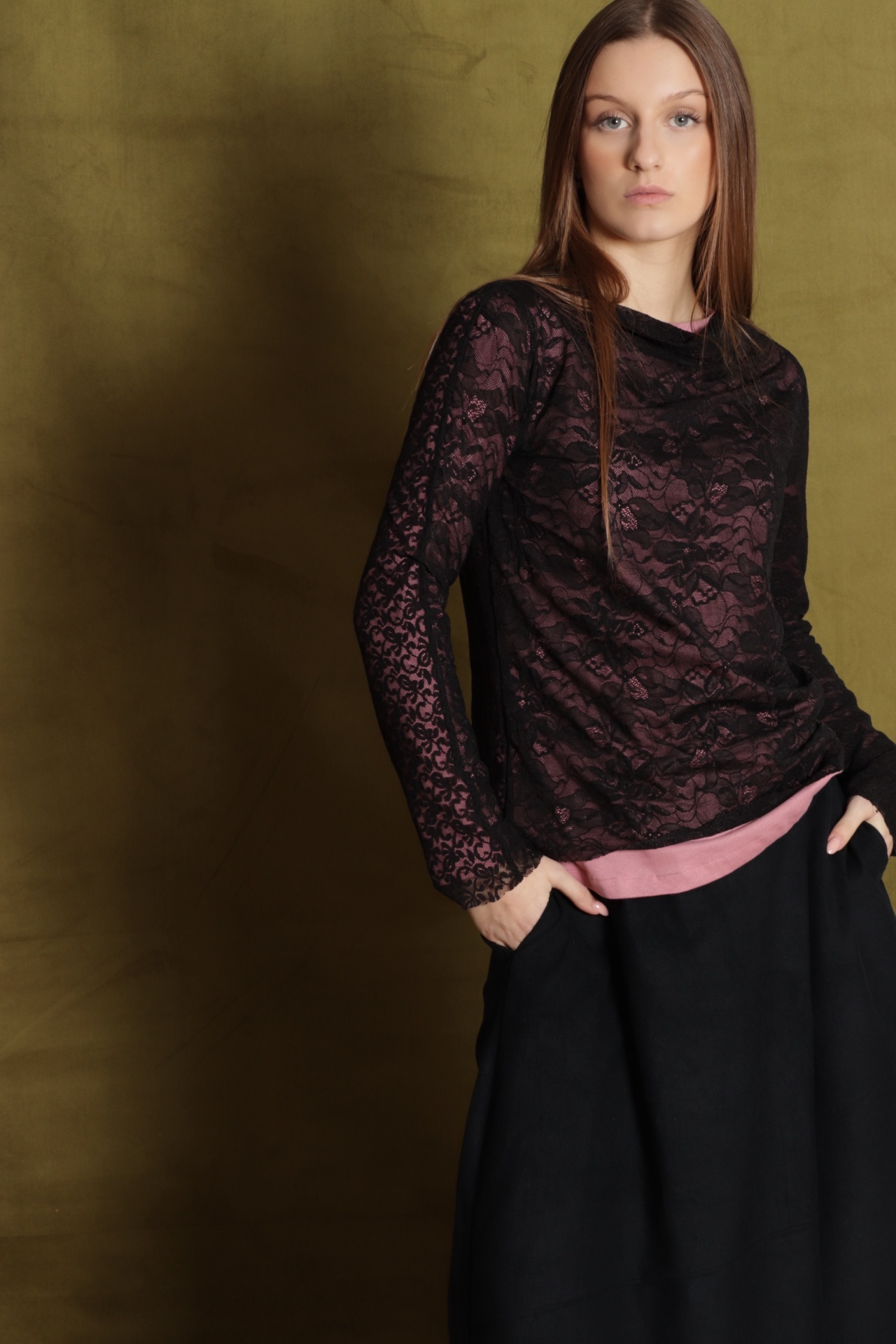 Camisola básica em renda preta. É uma camisola de linhas rectas, meia gola subida e manga comprida. Pode ser usada assumindo a sua transparência ou sobre uma camisola básica na cor pretendida, ganhando assim um visual diferente dependendo da cor base. É uma peça sem bainhas.