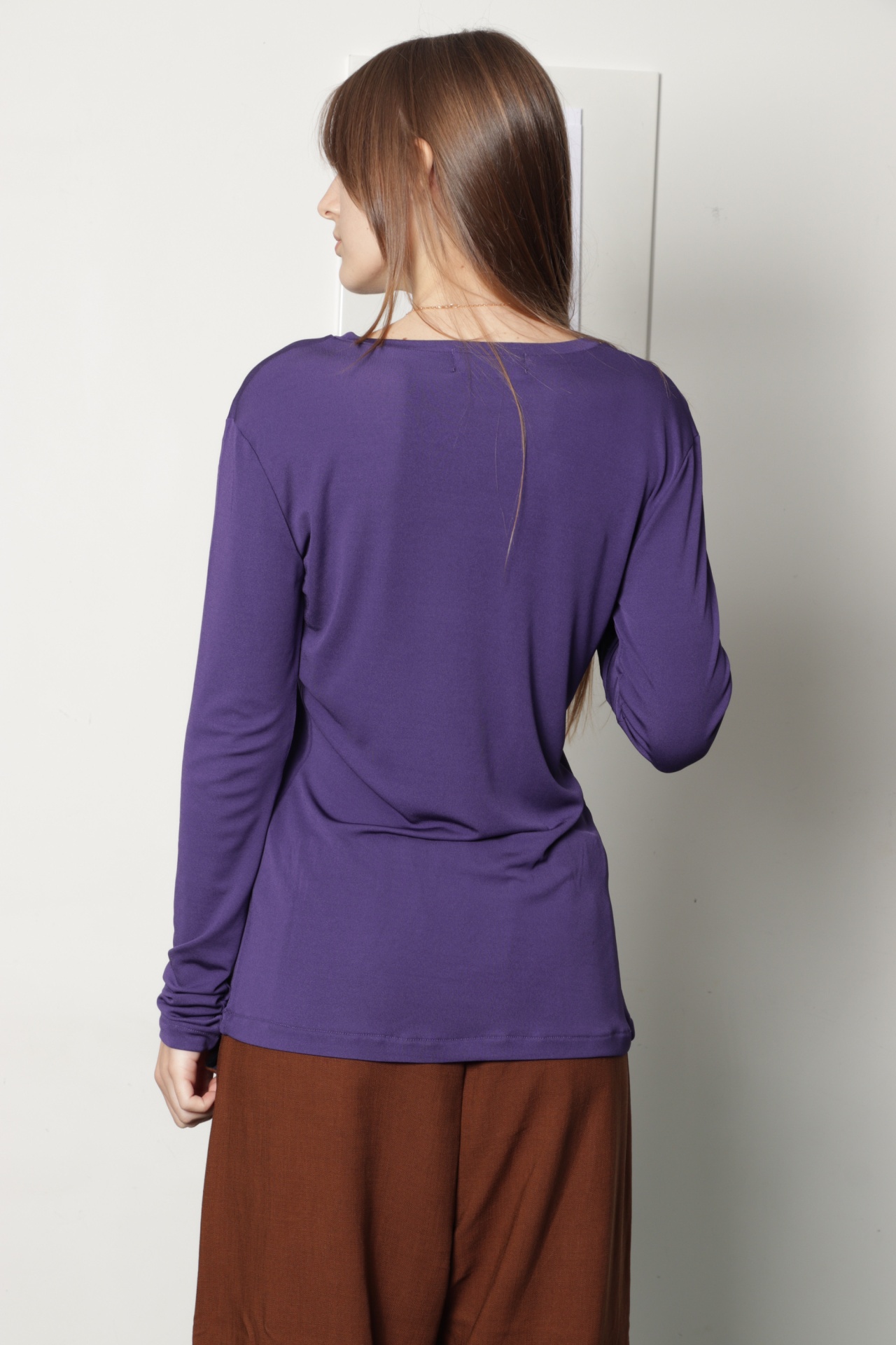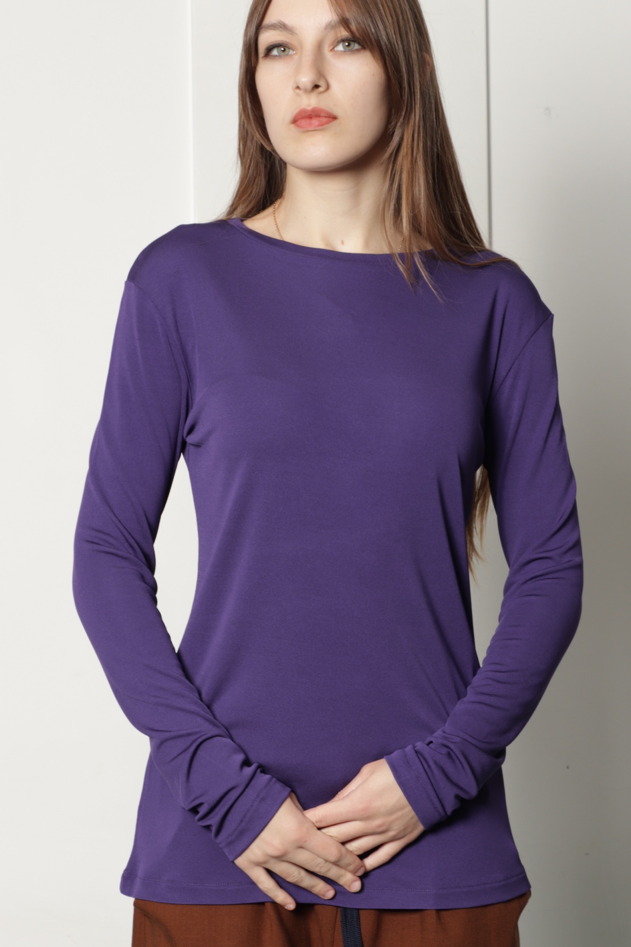 Camisola básica em jersey microfibra na cor roxa. É uma camisola de linhas rectas, decote redondo e manga estreita comprida. Peça básica para vestir por dentro de vestidos, camisas e camisolas.