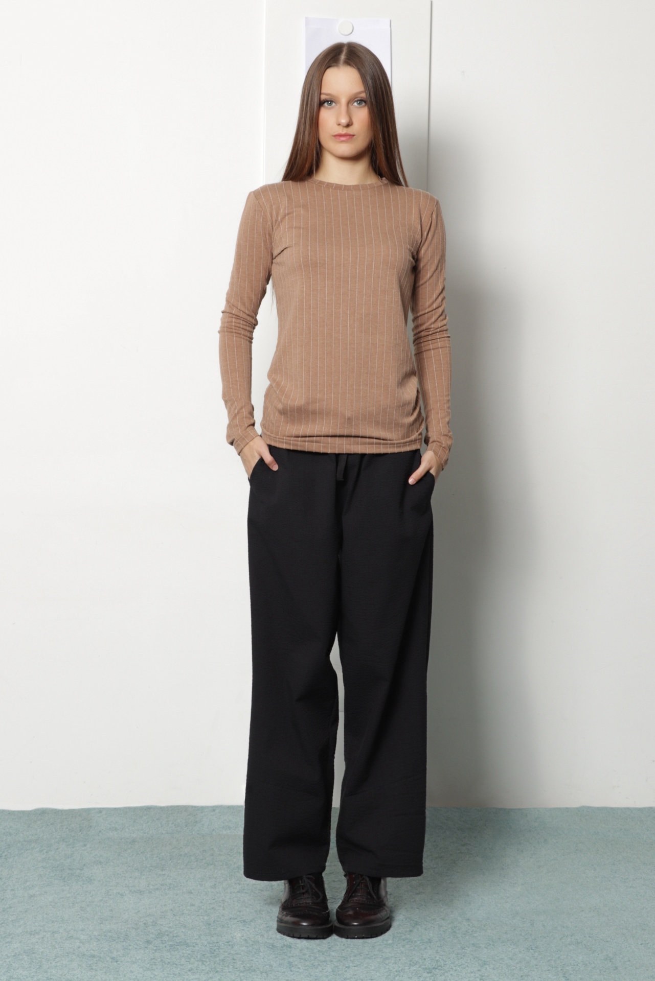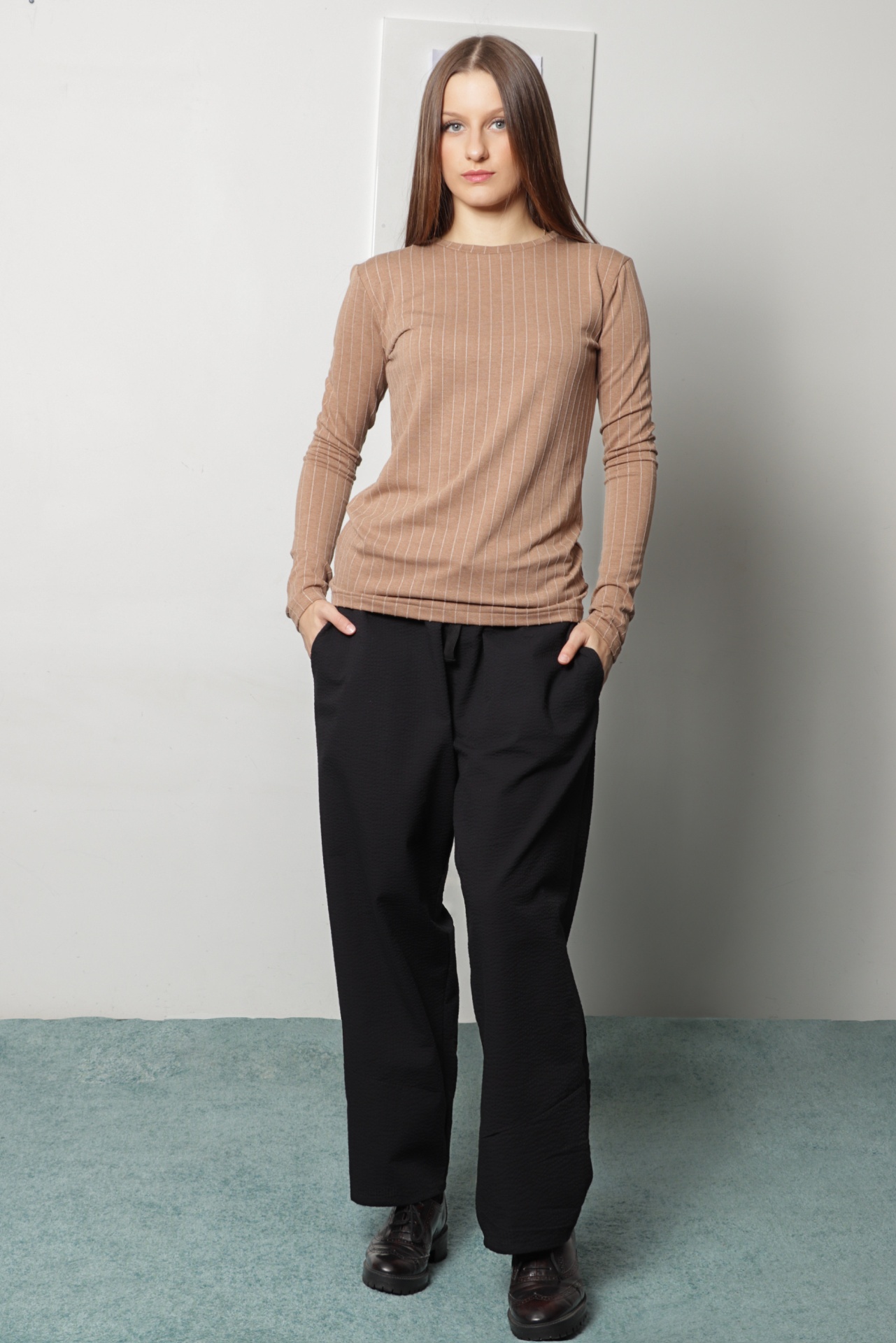 Camisola básica em jersey mistura algodão e viscose, na cor bege camel com risca fina bege em relevo. É uma camisola de linhas rectas, decote redondo e manga estreita comprida. Peça básica para vestir por dentro de vestidos, camisas e camisolas.