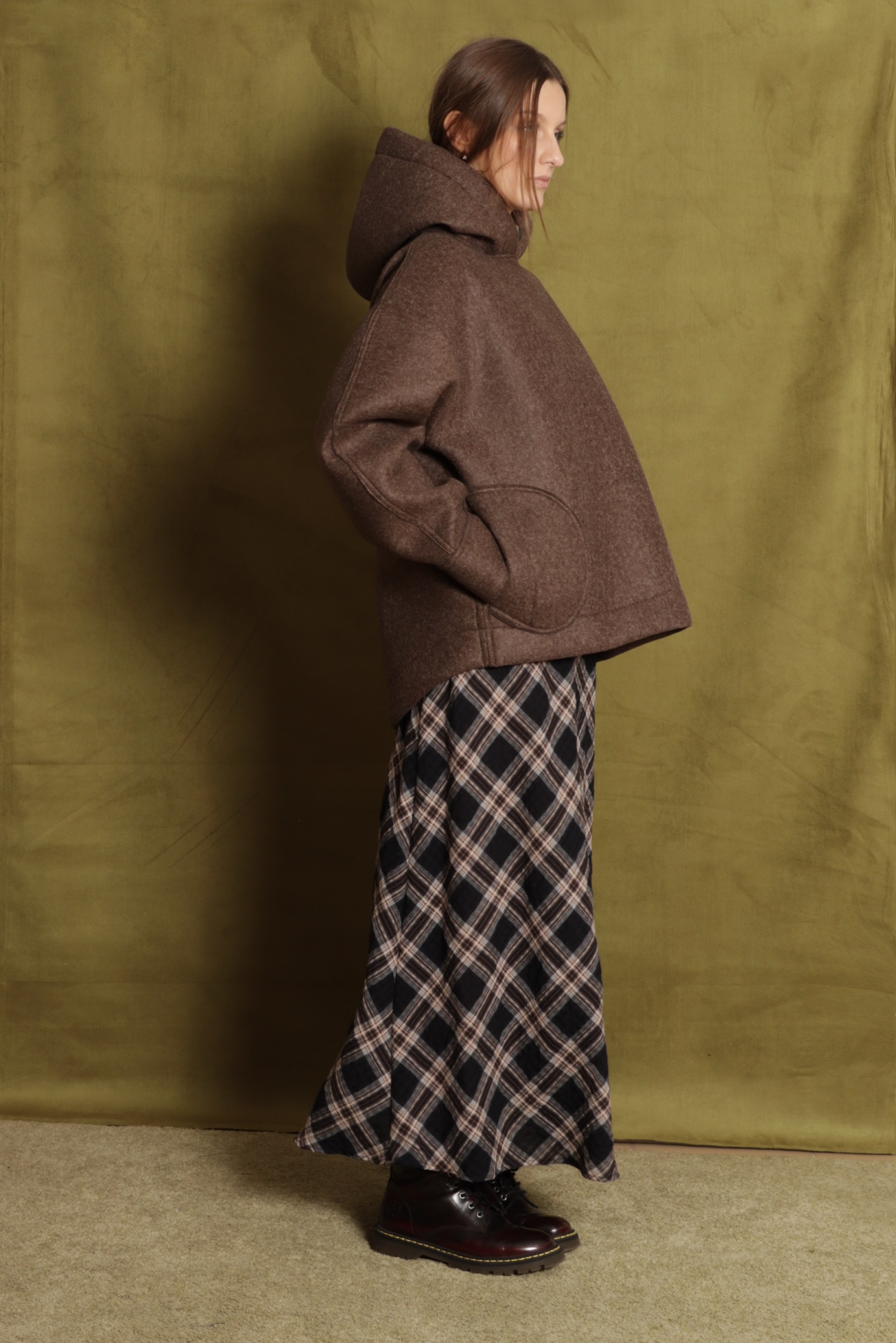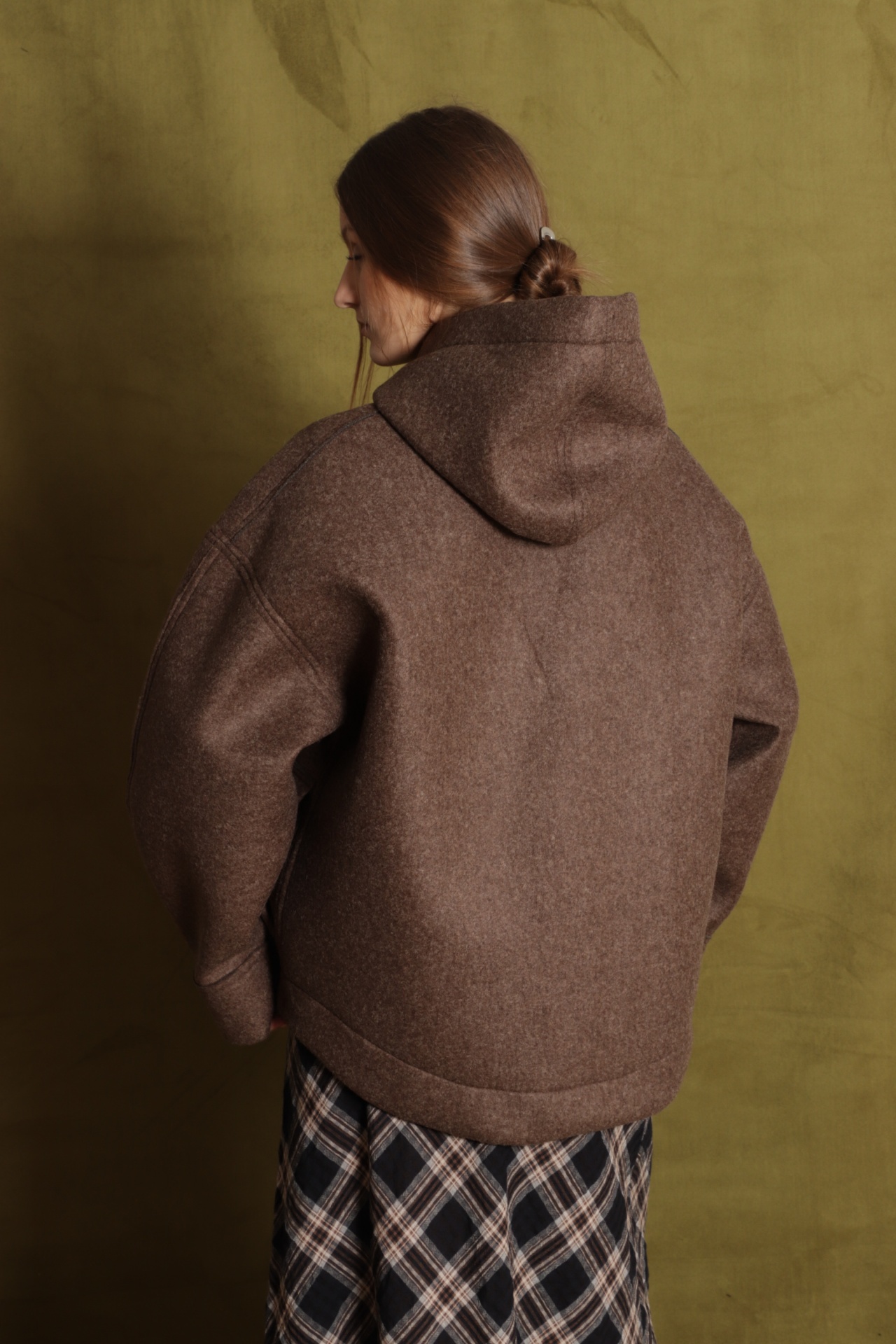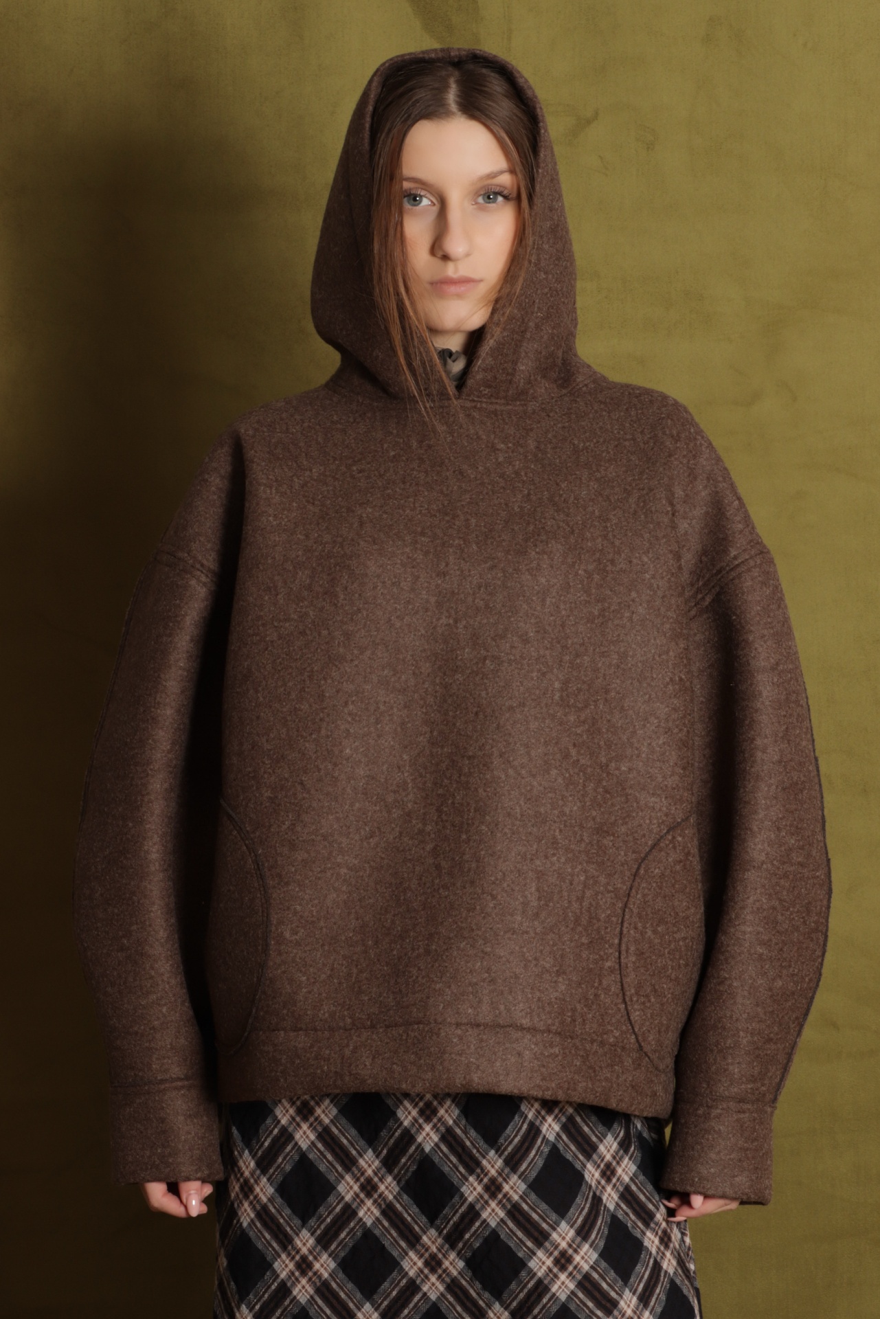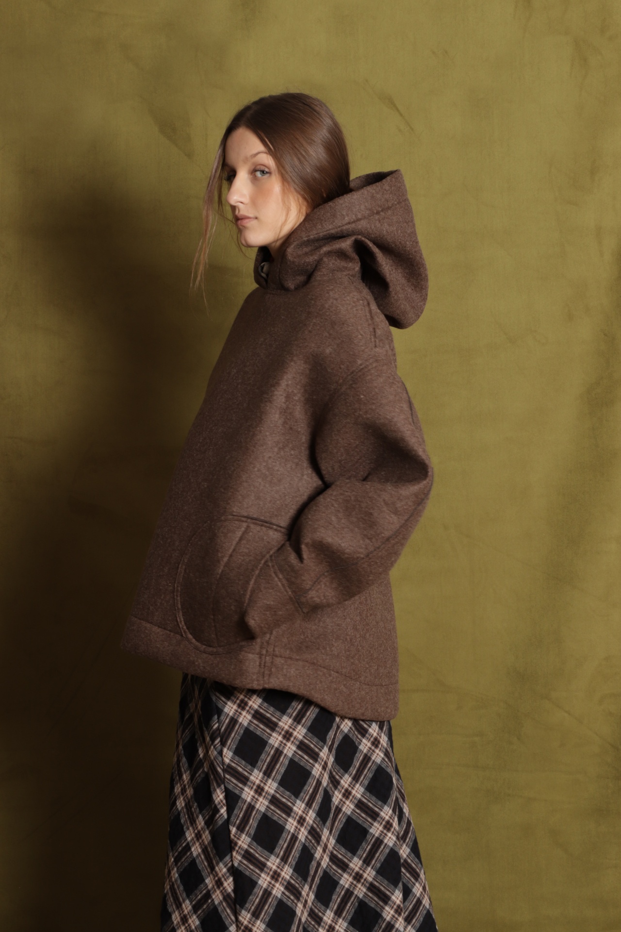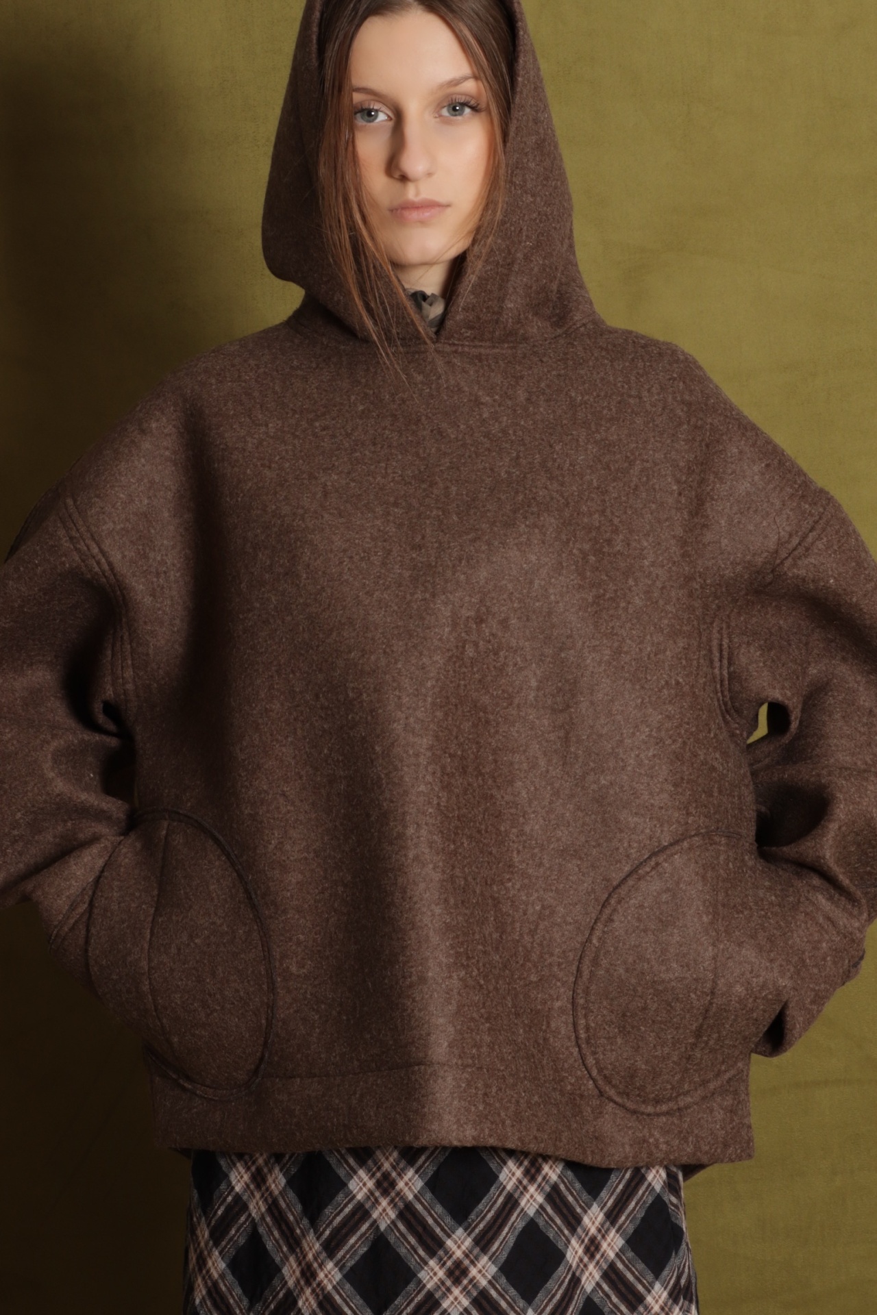 Camisola oversize com capuz em neoprene laminado a tweed castanho mescla. Tem bainha arredondada mais comprida atrás e bolsos aplicados na frente. É uma camisola descontraída, muito confortável, ideal para os dias mais frios.