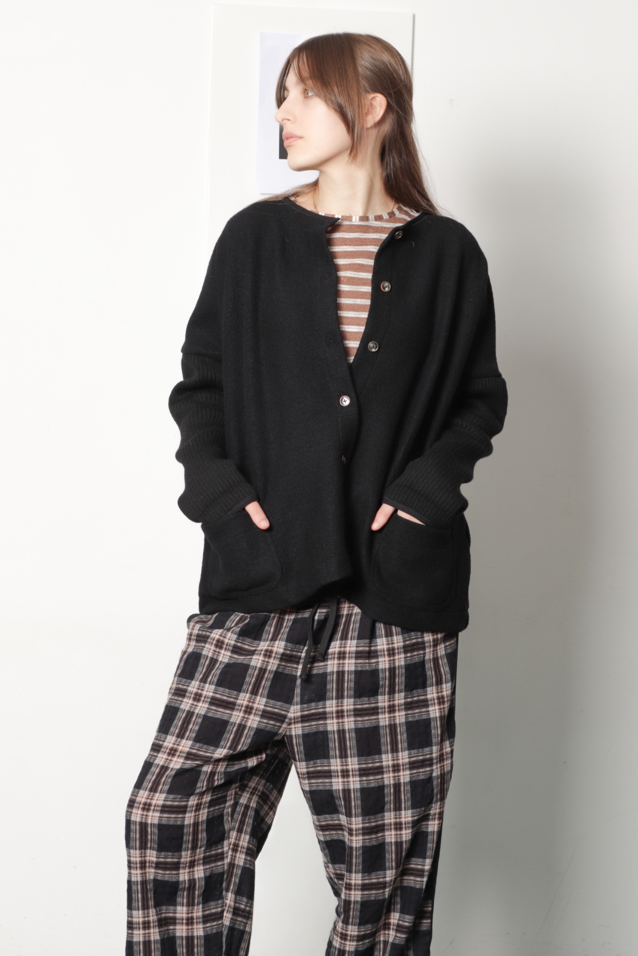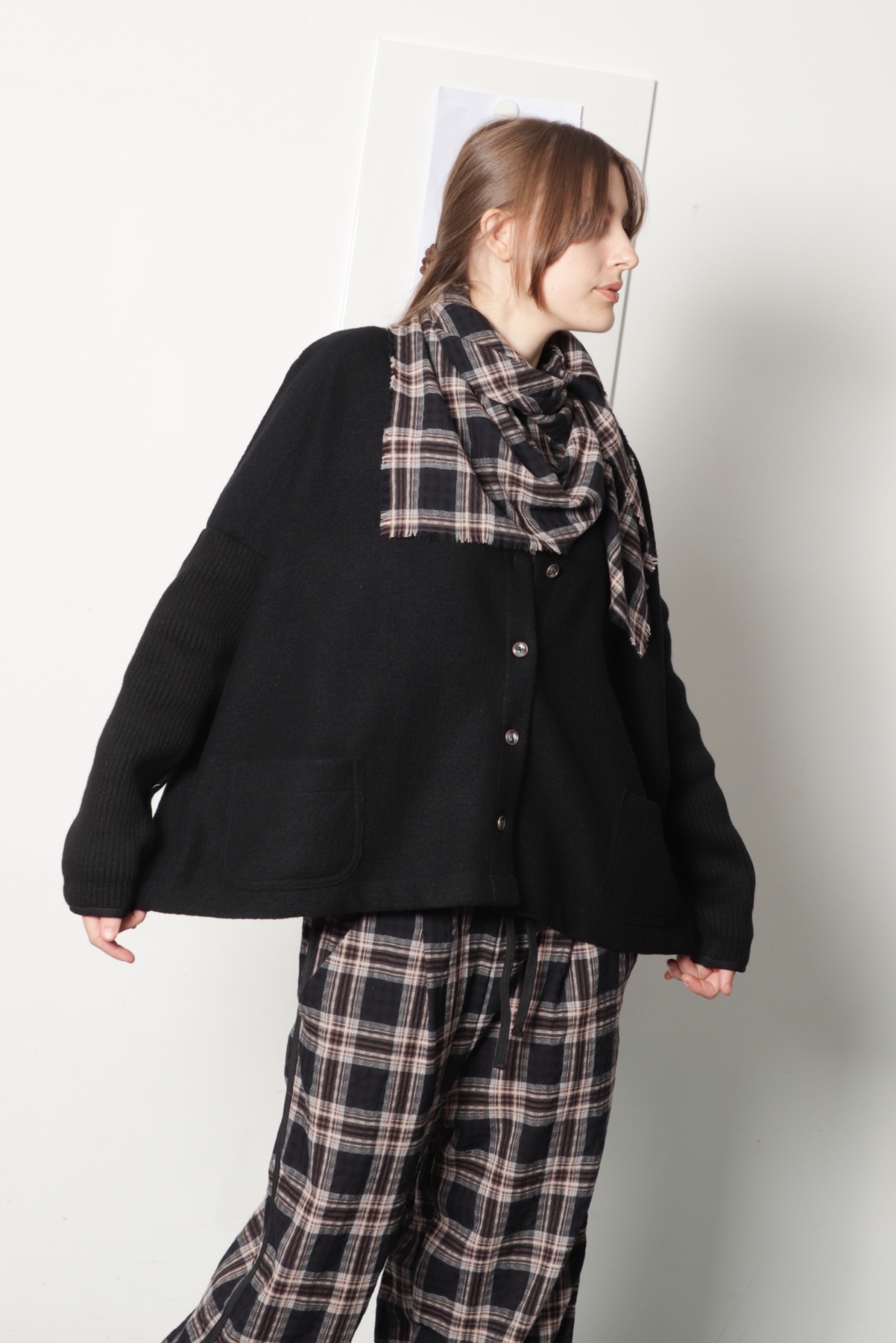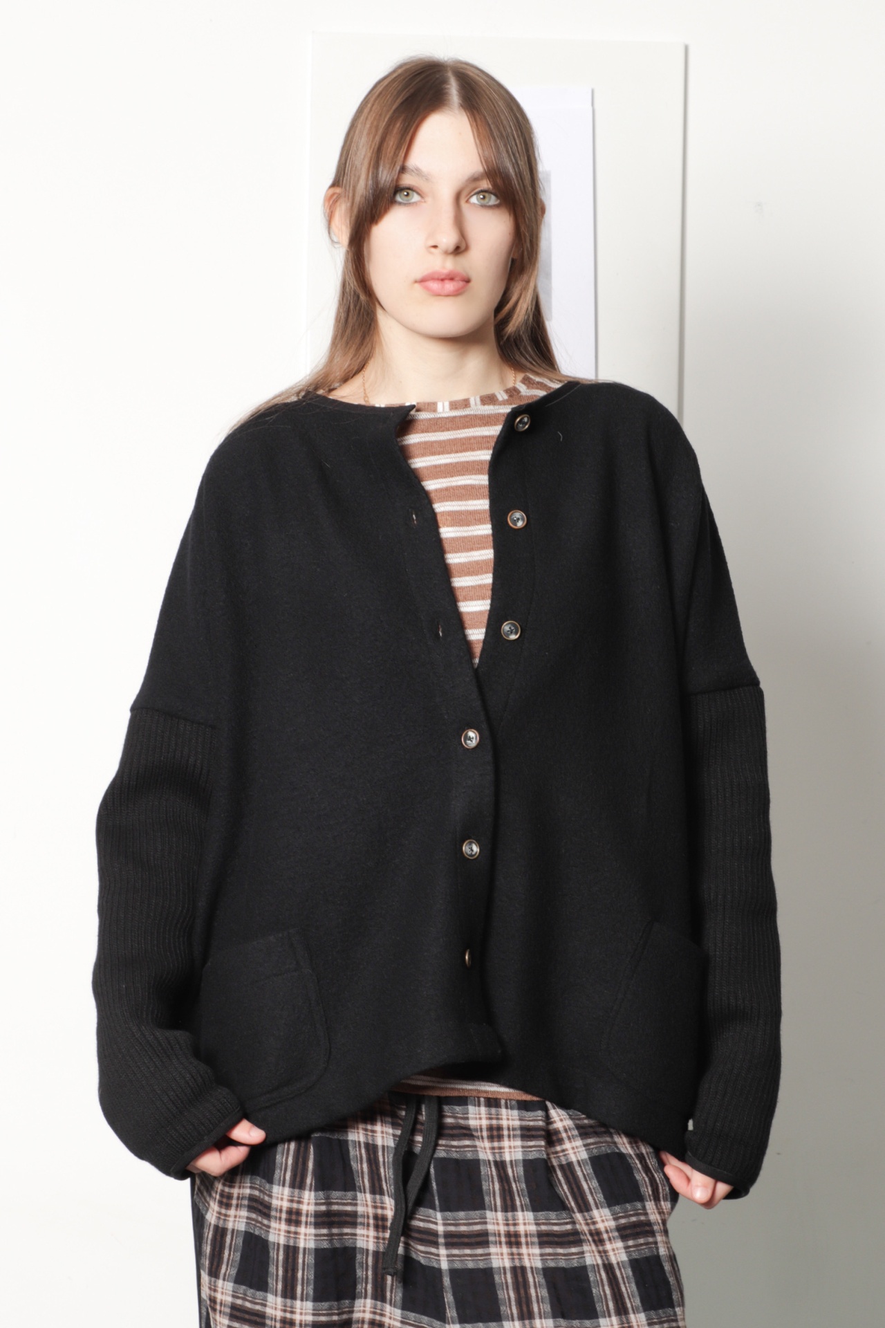 Casaco oversize, estilo cardigan, em lã fervida preta, com mangas em malha tricotada em canelado. Acabamento com elástico no decote e punhos. Tem 2 bolsos de chapa na frente e aperta com botões de fantasia.