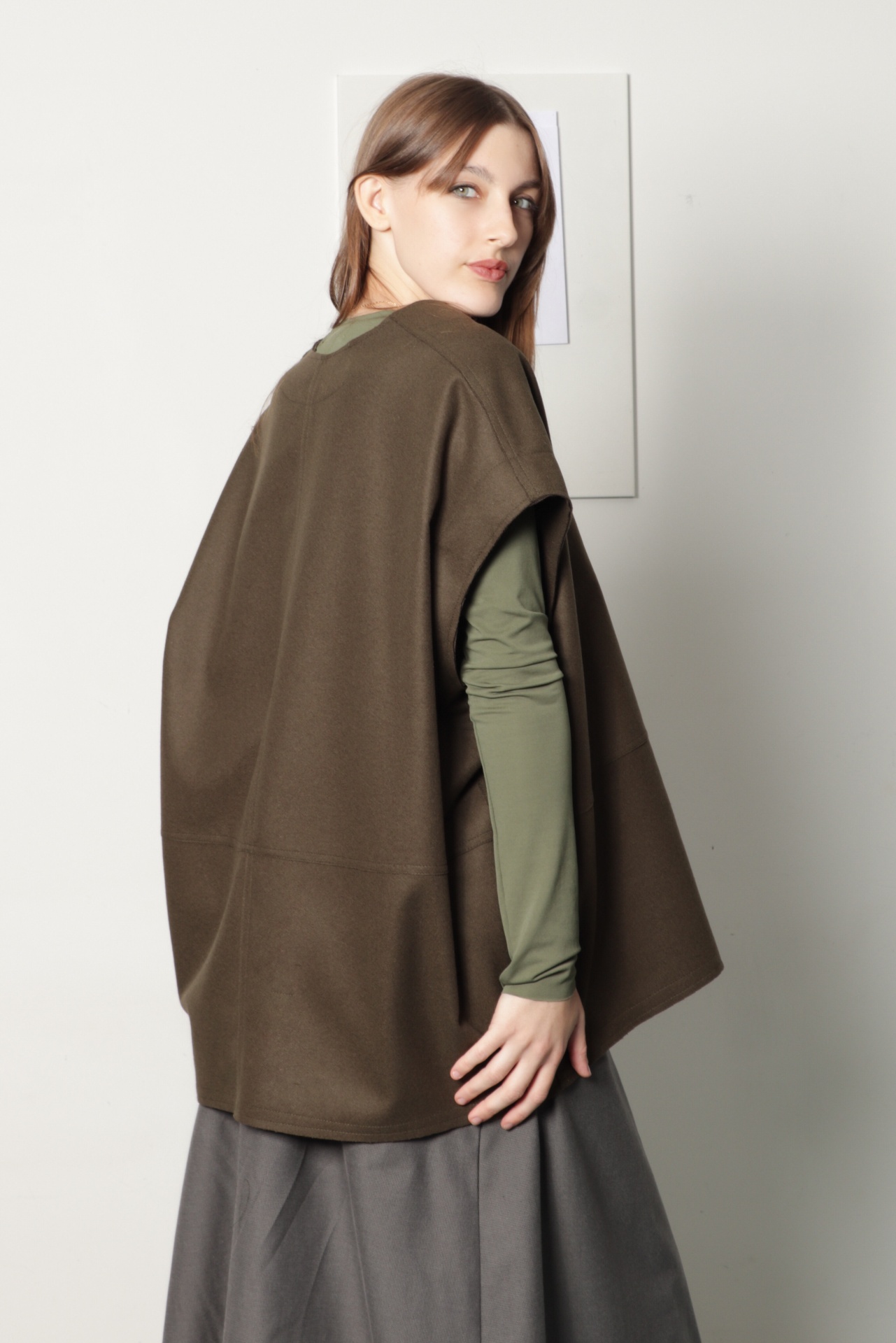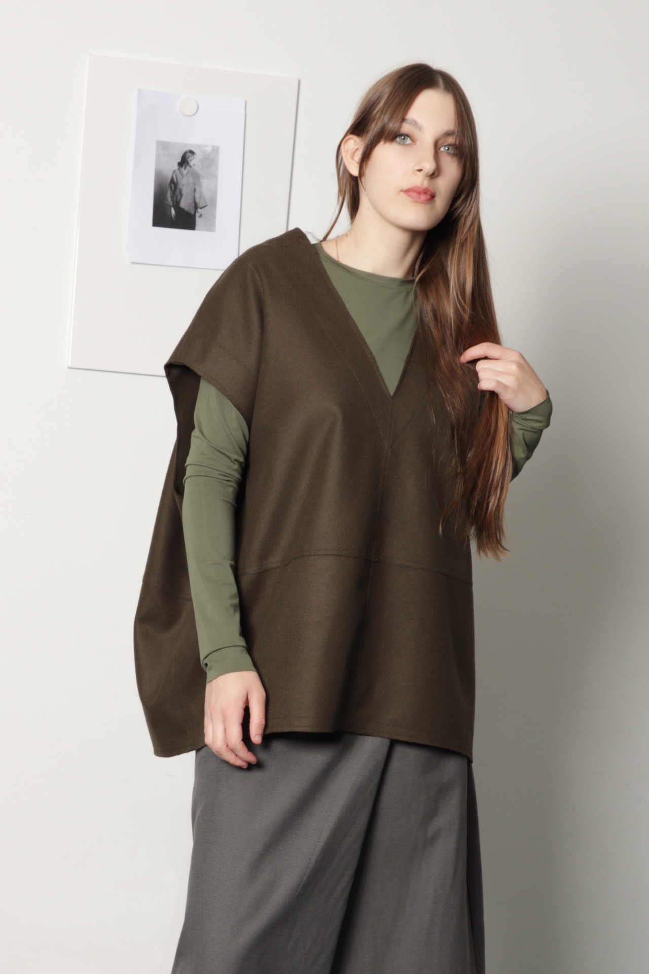 • Mulher com camisola verde e colete castanho de tecido grosso em fundo branco.