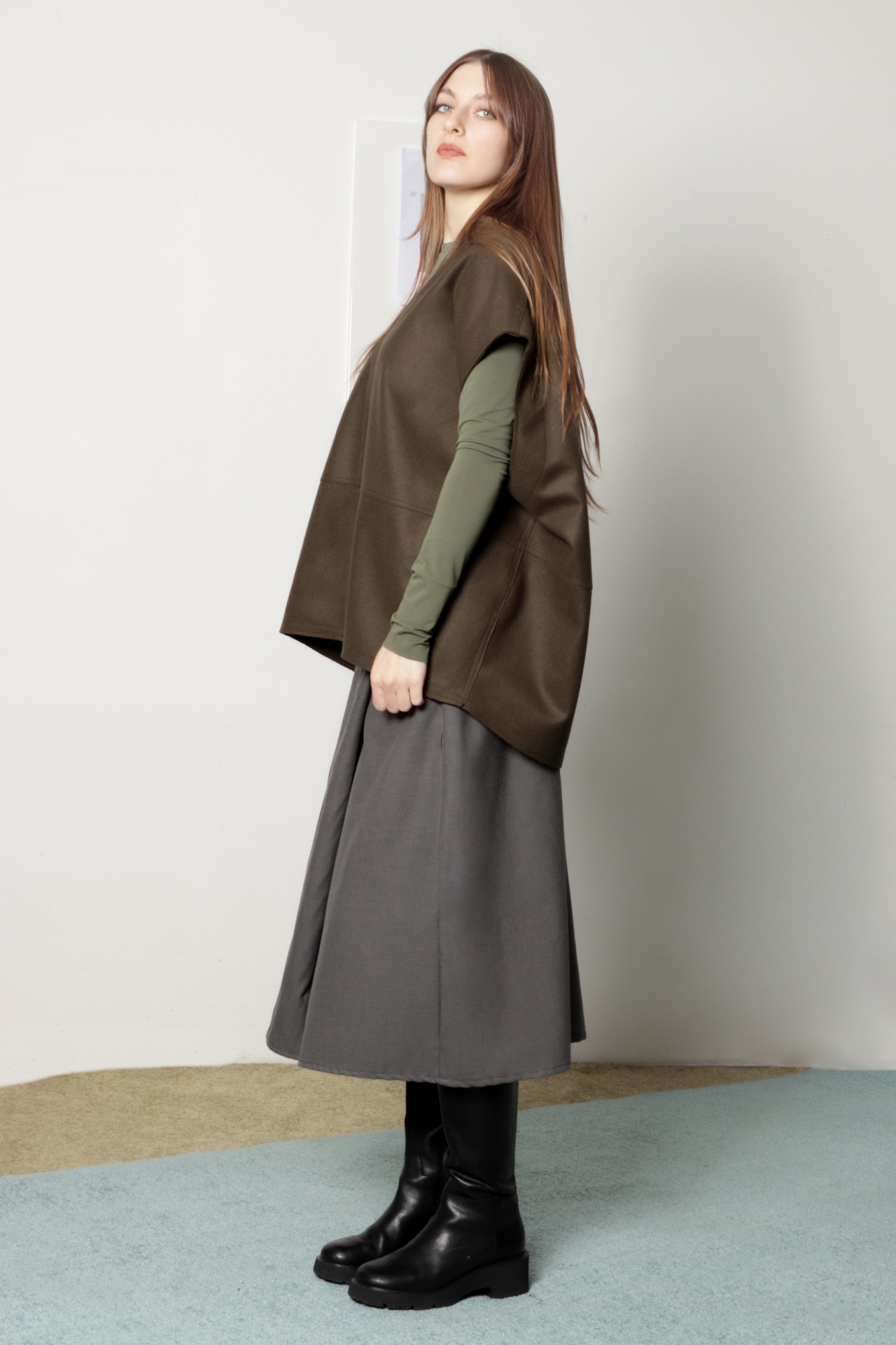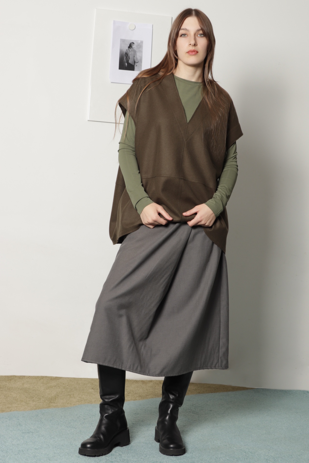 • Mulher a usar camisa verde, colete castanho, saia cinzenta e botas pretas em ambiente interior