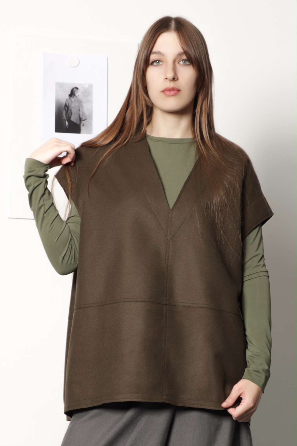 Colete oversize em fazenda de lã na cor verde musgo. Acabamento em corte vivo, com costuras sobrepostas. Tem bainha arredondada, ligeiramente mais comprida nas costas. É uma peça descontraída de aspecto "clean" minimalista e uma tendência para este inverno.