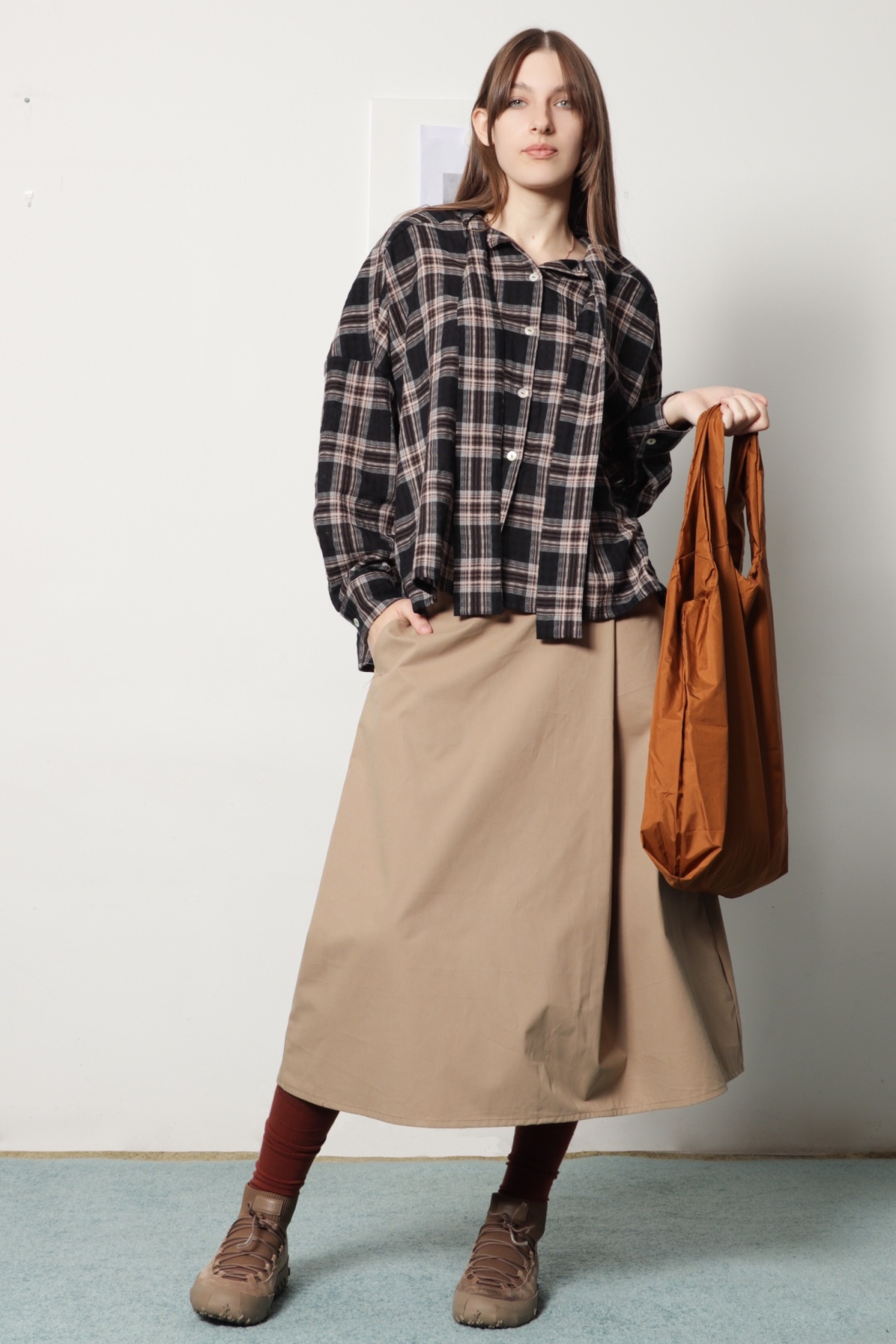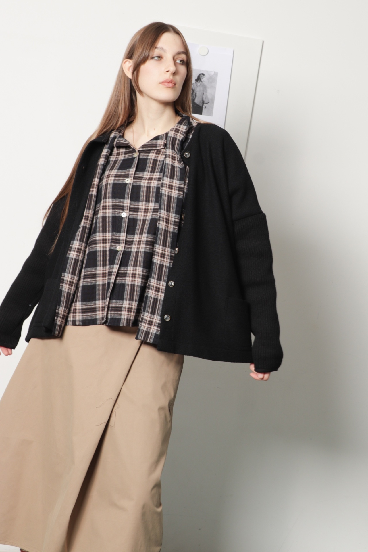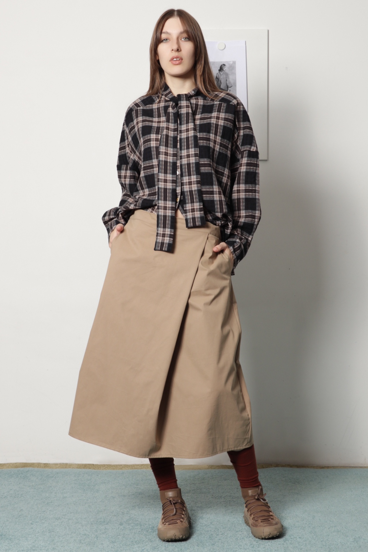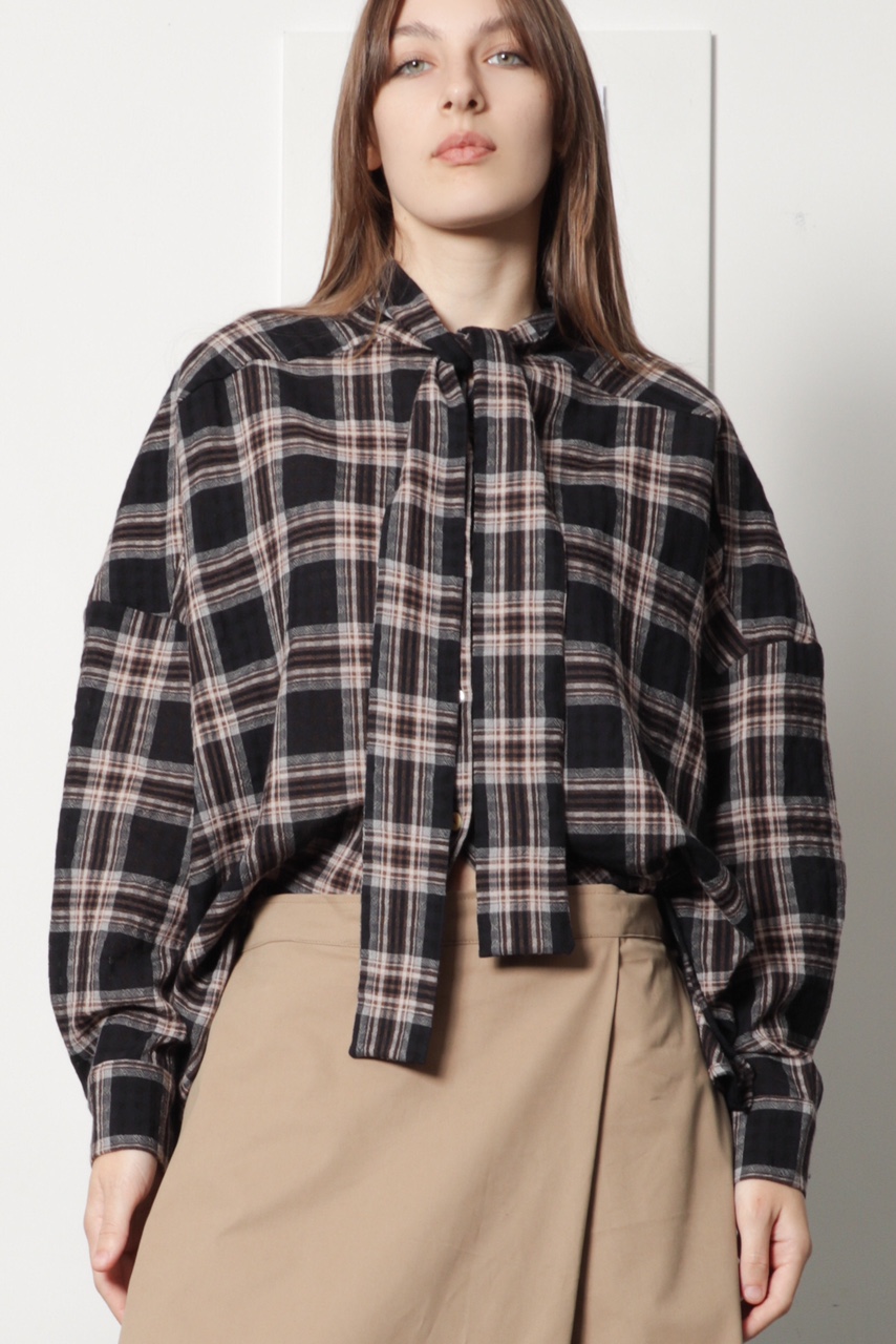 Camisa oversize com laçada em xadrez, nas cores preto, castanho e bege. Pode ser usada com laçada ou com as tiras soltas para um look mais descontraído. Tem manga comprida com punho e botão em ombro descaido, um pequeno macho nas costas e bainha arredondada ligeiramente mais comprida atrás.