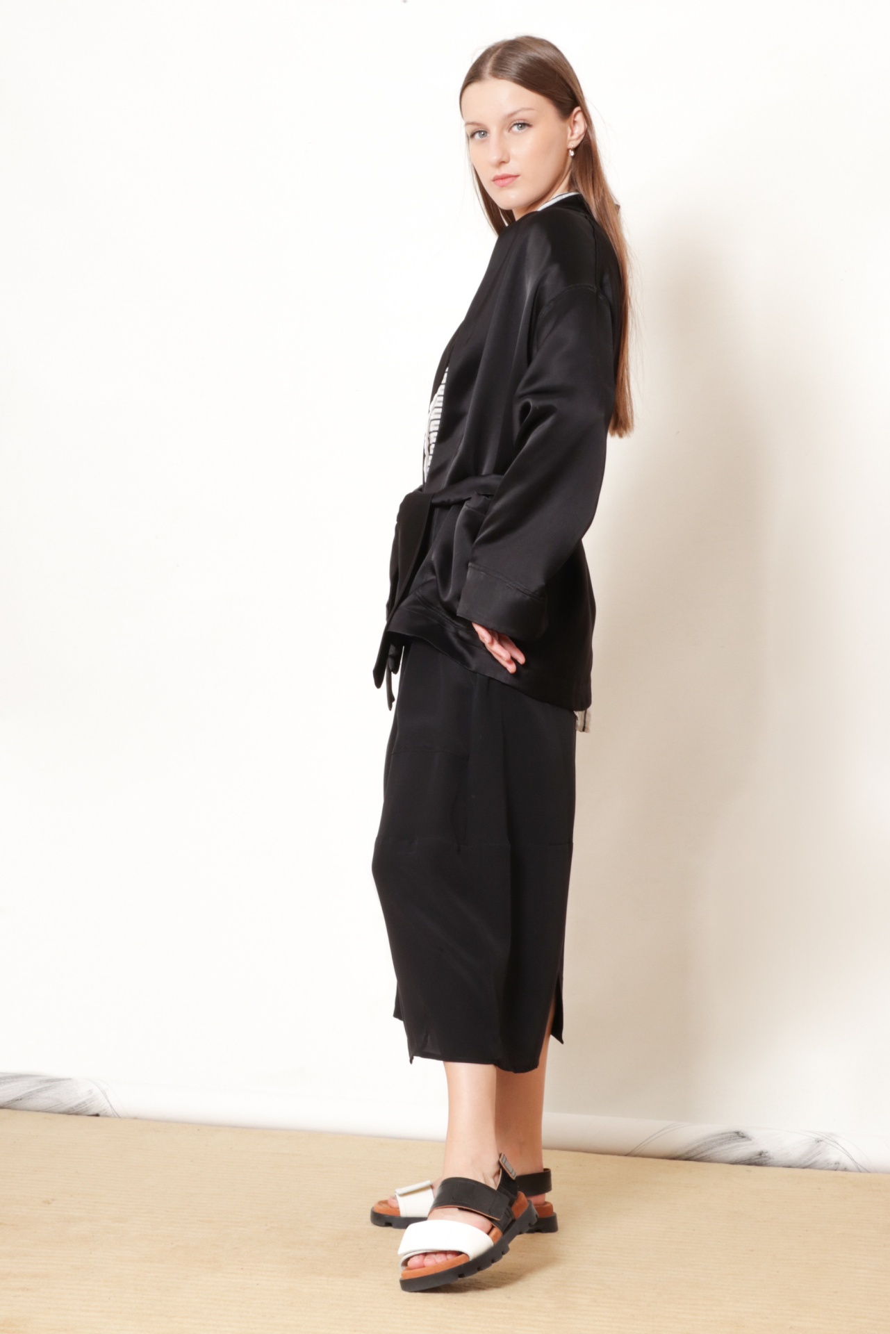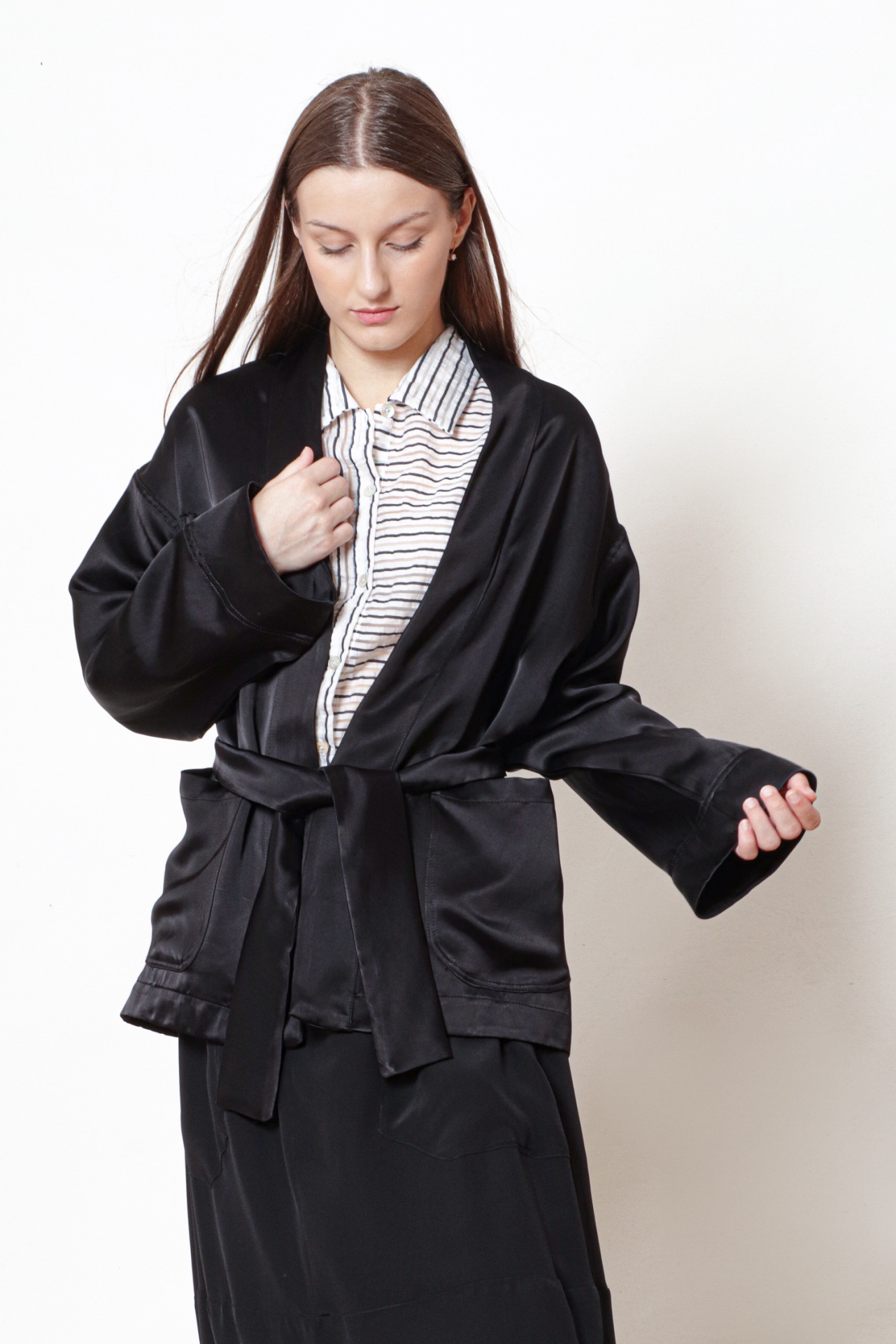 Kimono YAMAGUCHI 225,00 € Desconto de %. IVA incluído. Partilhar Comprar Contactar 1 unidades em stock | SKU: YAMAGUCHI-260u04 Casaco kimono em cetim de seda, na cor preta. Tem 3 bolsos de chapa na frente e pode ser usado aberto ou apertado com cinto do mesmo material. 100% sedaTamanho únicoLargura frente abaixo da cava = 58cms (circular 116cms)Comprimento = 68cm HANDMADE IN PORTUGAL Instruções de lavagem: limpar a seco Nota: este casaco foi fotografado com a camisa ISAKA e com a saia RAZU