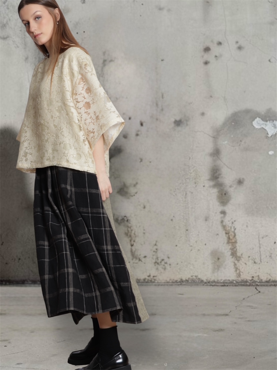 • Mulher com blusa creme floral e saia xadrez preta em fundo de parede cinza.